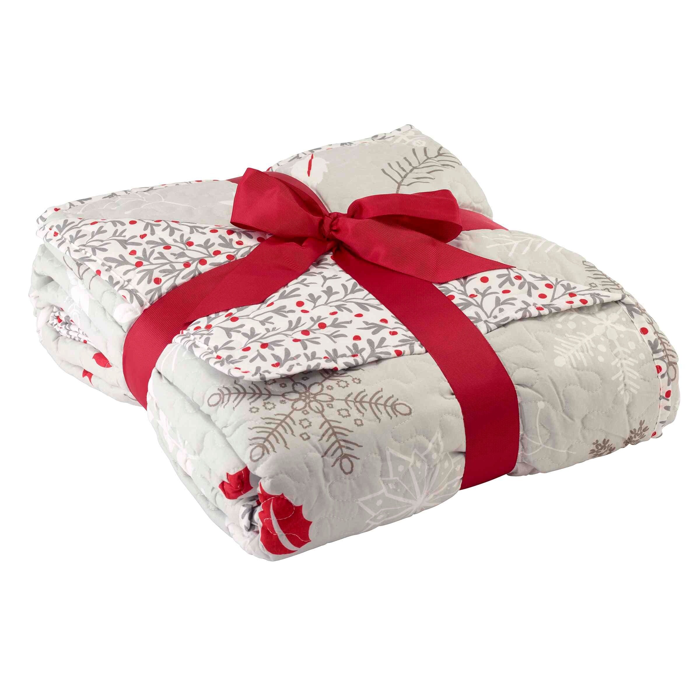 The Avanti Winterberry Holiday King Quilt Set features a festive winter design with snowflakes, berries, poinsettias and leaves on a light grey quilted ground, reversing to a coordinating leaf and berry design. Printed on 100% polyester. Includes 1 quilt (108" x 92") and 2 king shams (20" x 36").
