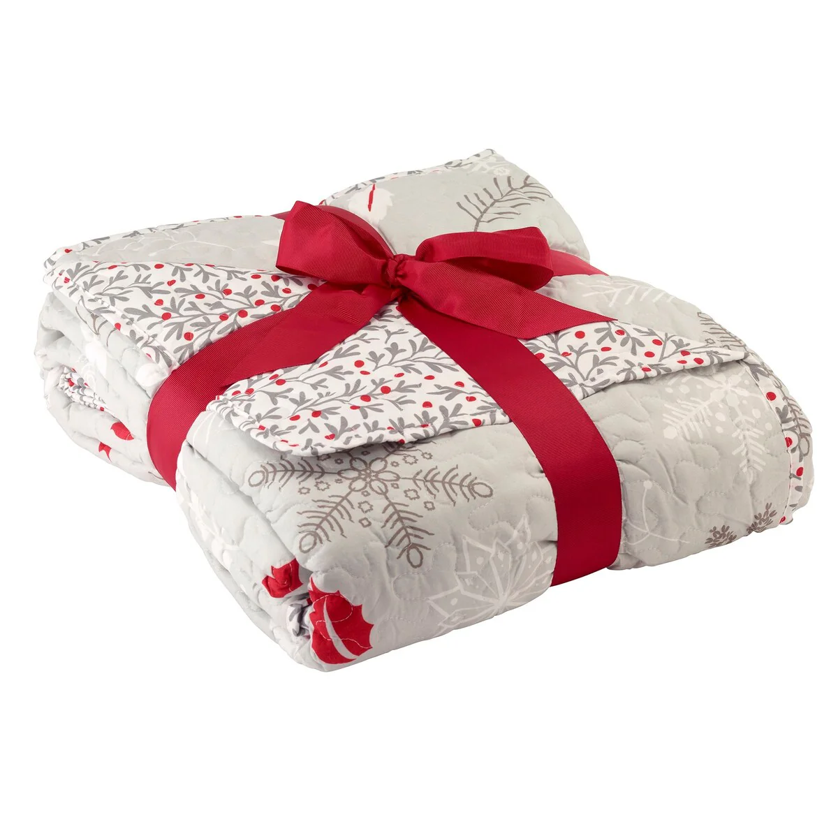 The Avanti Winterberry Holiday King Quilt Set features a festive winter design with snowflakes, berries, poinsettias and leaves on a light grey quilted ground, reversing to a coordinating leaf and berry design. Printed on 100% polyester. Includes 1 quilt (108" x 92") and 2 king shams (20" x 36").