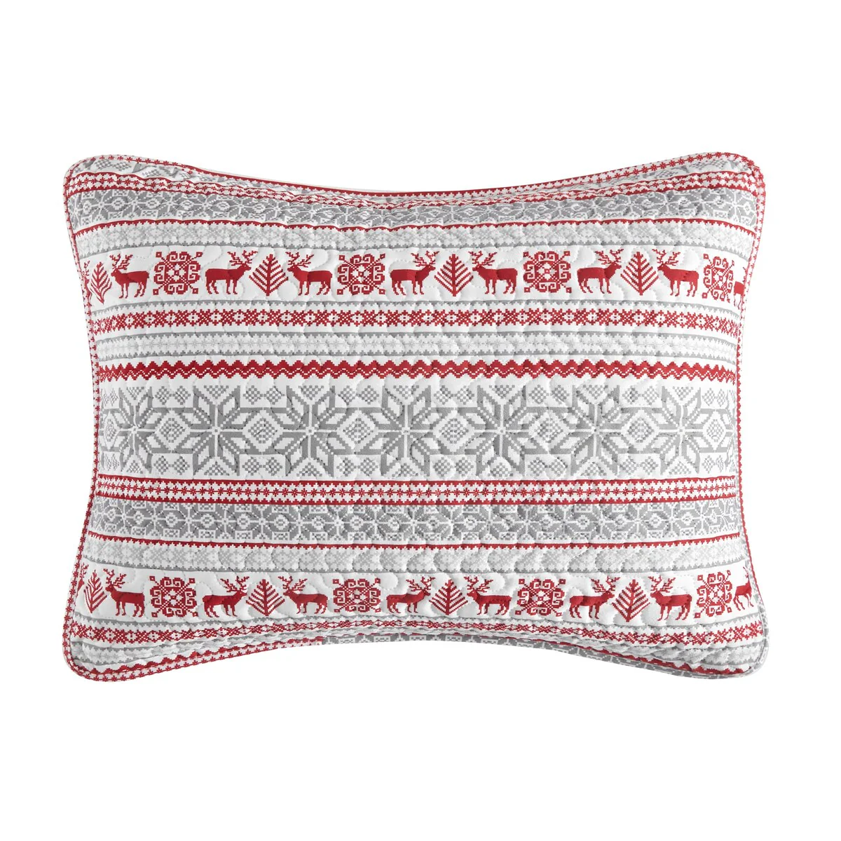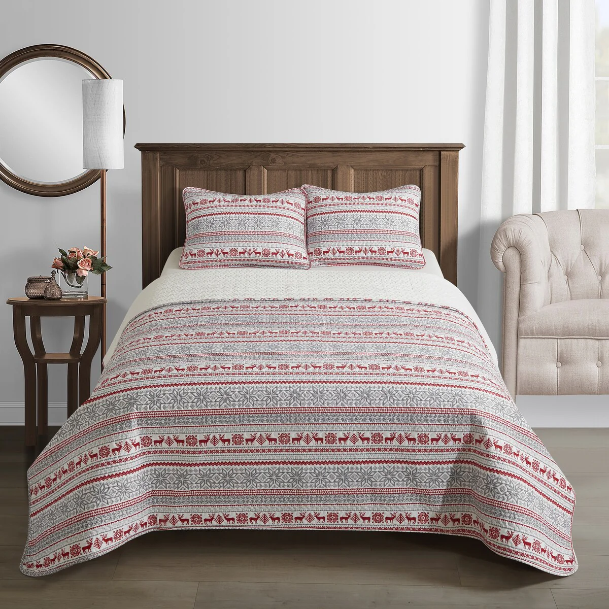 Inspired by the famous knitwear technique, This Dearfoams Fair Isle 3 piece Quilt Set will have you feeling snuggled up in your favorite sweater. This look allows you to drape your mattress in pure luxury with our fabric, and features a print to get you into the holiday spirit. �The soft touch makes it easy to stay in bed all day, and the solid reverse allows you to change up your bedroom decor with the seasons. �This 3 piece set includes a quilt and 2 pillow shams, and is machine washable for ease of care.�
