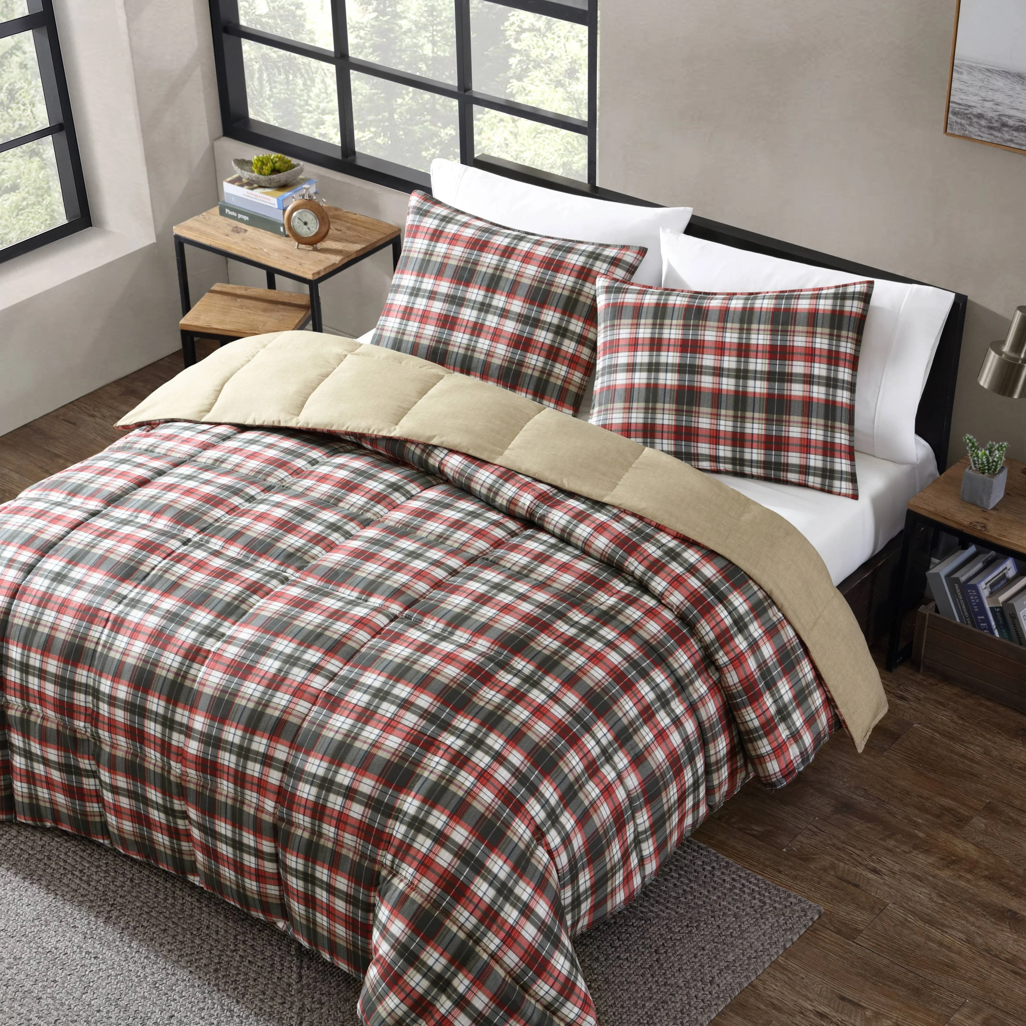 The Eddie Bauer Astoria down alternative comforter collection is crafted with 100% polyester fibers. The front of the set features super soft micro-suede, while the back features a brushed microfiber. Each comforter is filled with lofty polyester, providing extra warmth without the weight. Each set includes two matching shams for easy styling (twin size includes one sham). Machine washable for easy care, follow instructions on manufacturer care label for best results. Made thoughtfully and sustainably using non-toxic dyes. Pairs perfectly with the Eddie Bauer sheet collection, sold separately