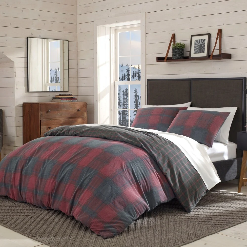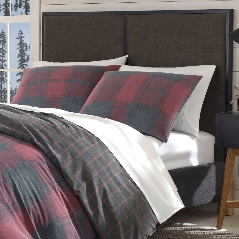Bring warmth to your decor with this Cattle River duvet cover set. The machine washable set is crafted from soft, crisp cotton, and features a reversible duvet cover with a red and blue plaid pattern on front, and a black and red plaid pattern on back. Button closures and internal ties keep your duvet insert (not included) securely in place, while matching pillowcases offer a complete look.