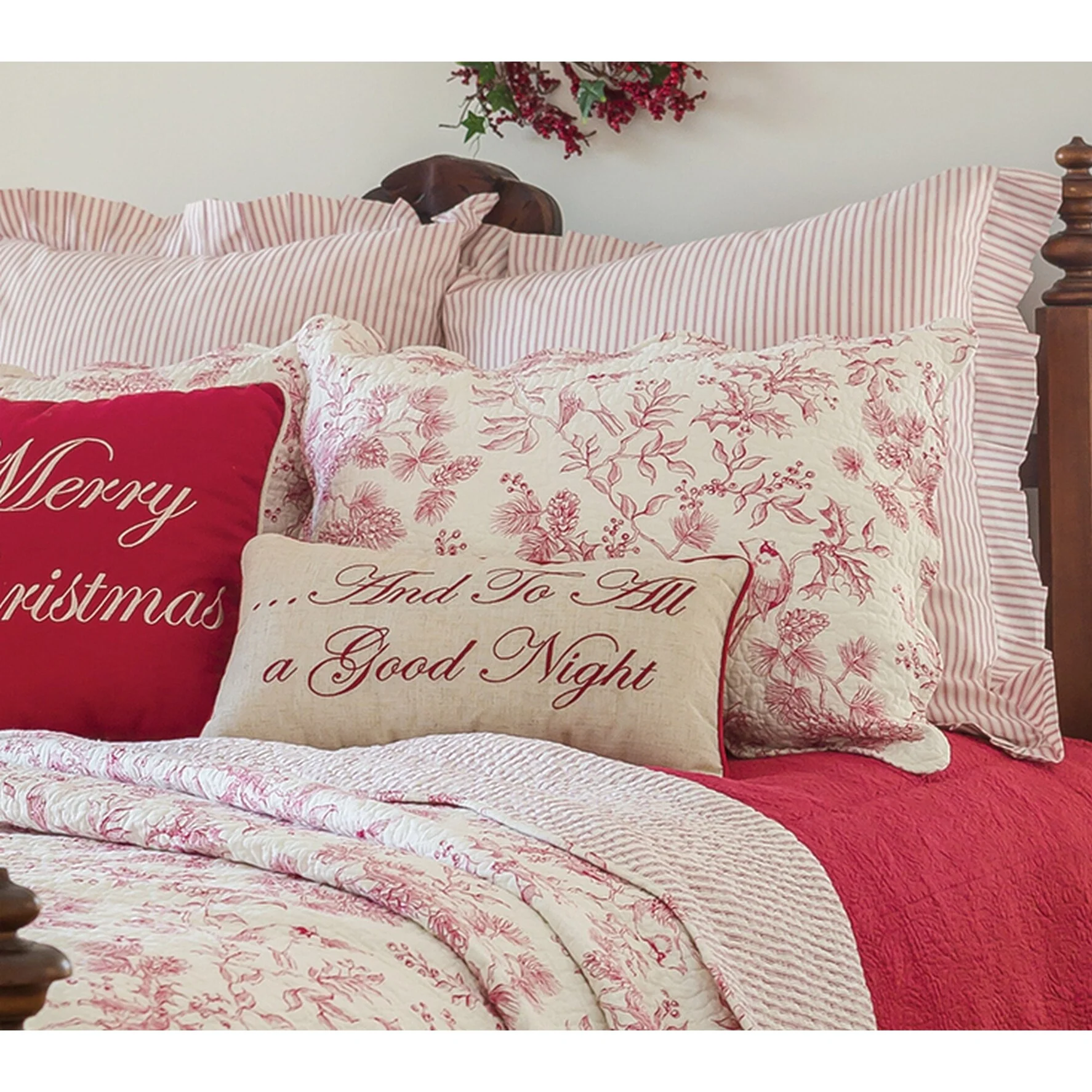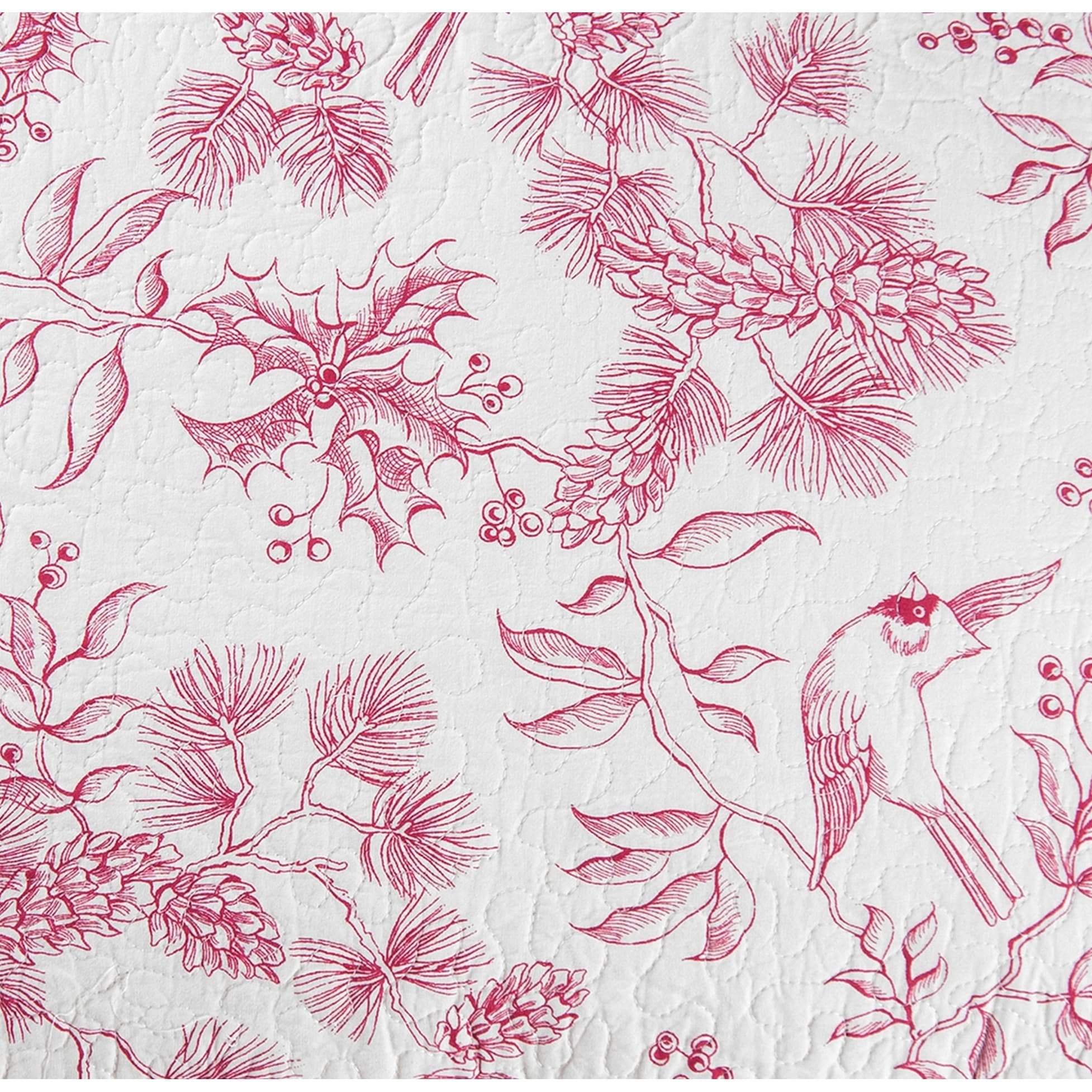 Bring a sophisticated touch to your bedroom as fresh pinecones and cheerful holly berries paint a charming winter scene in the red-on-antique white Evergreen Toile quilt set. Allover vermicelli quilting and a scalloped edge bring a finished look to this classically elegant bedding. Switch to a reversible vintage-inspired red ticking with just a flip of the quilt. Crafted of 100-percent cotton, this quilt set is machine washable for easy care. Coordinating accent pillows, euro shams and bed skirt available separately.