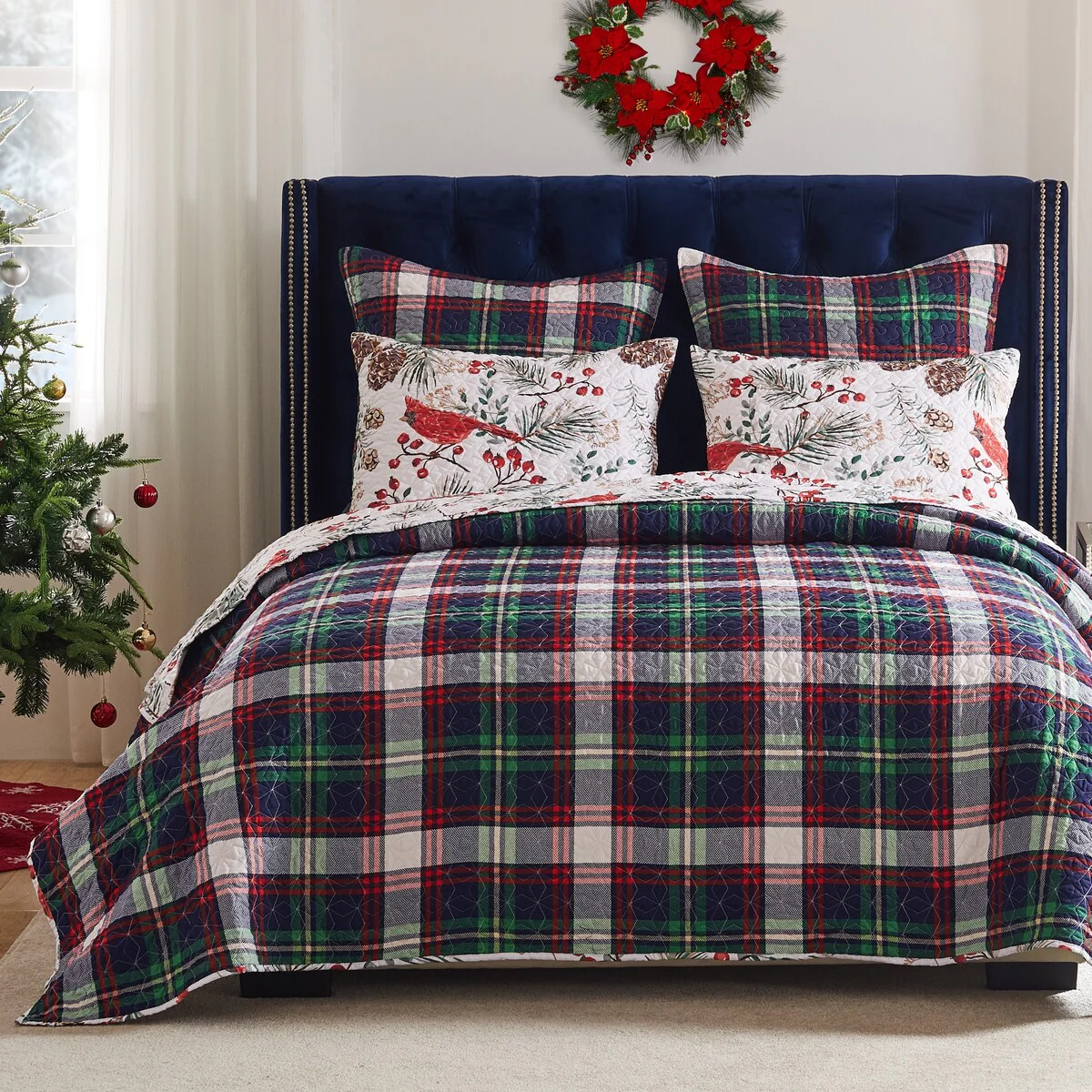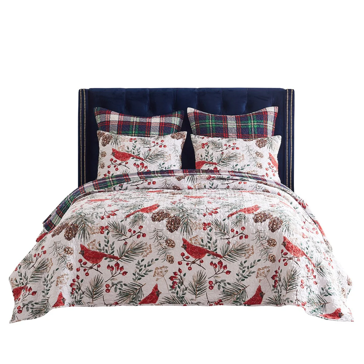 Embrace the festive season with our Cardinal Plaid quilt set, showcasing bright red cardinal birds and holly berries in a snowy white winter wonderland. Evergreen branches and pine cones add to the holiday mood. The reverse features a large-scale plaid print in Christmas red, green and blue. Crafted for versatility, this reversible quilt set includes two pillow shams (one sham with Twin size), offering two charming looks in one. Add holiday cheer to your bedroom with this delightfully cozy quilt set.
