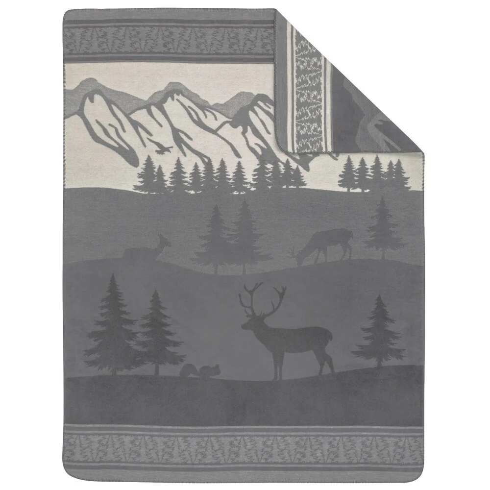Displaying a majestic and serene nature scene this throw is an all-year rounder but also a favorite for the winter season. This charming design was inspired by the great outdoors. Thick and soft high-pile texture with neutral grays and ivory to complement �most anything in your home decor. Whip Stitch binding on all four sides.