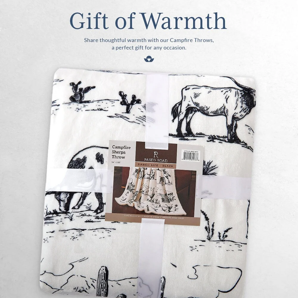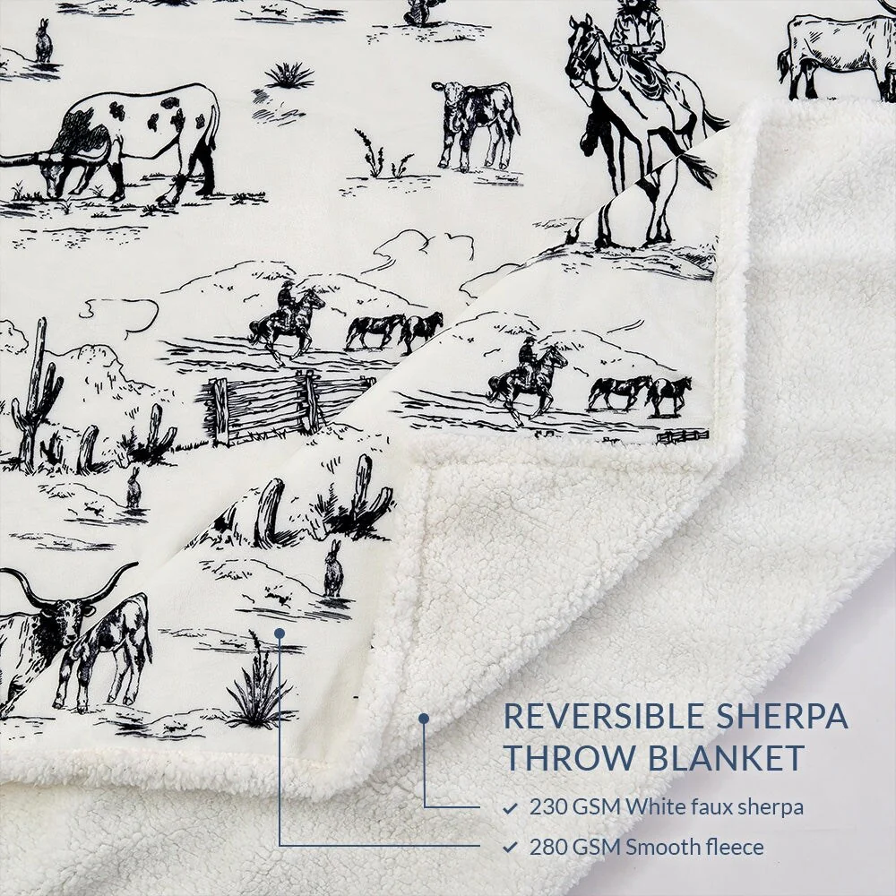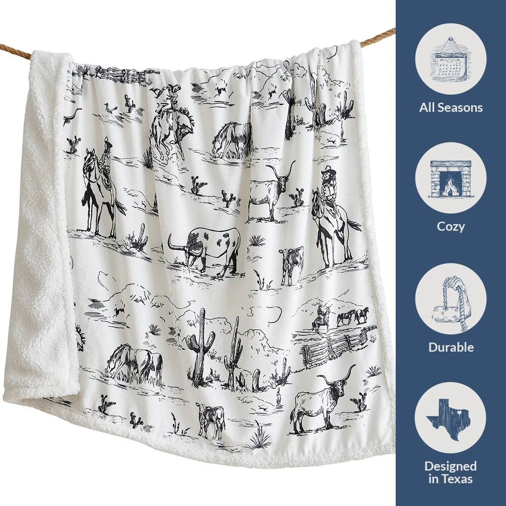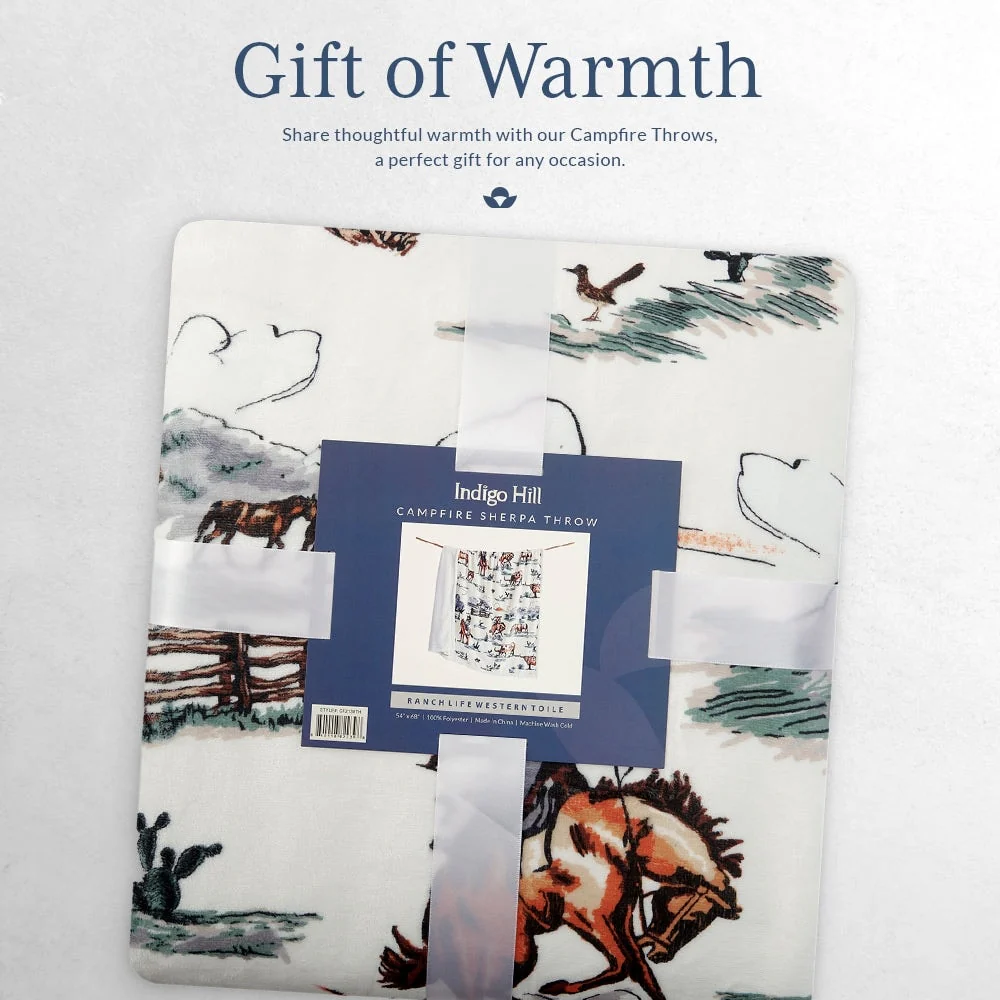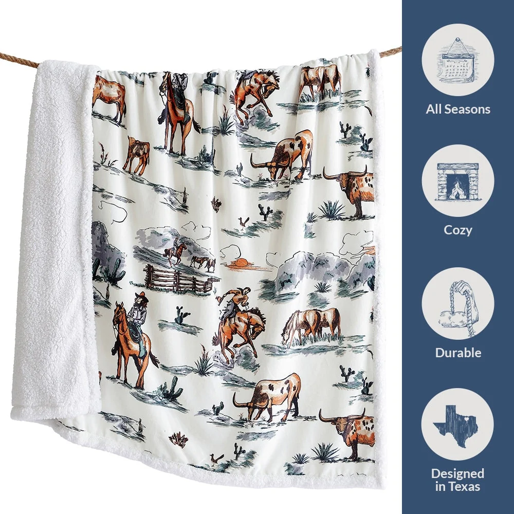 Steep yourself in Western nostalgia with our Ranch Life Western Toile Campfire Sherpa Throw. Showcasing vibrant scenes of wrangling cowboys, grazing herds, and wildlife, all draped in colors as soothing as a desert sunset, it's a cowboy's dream come true. Easy to care for and backed with cozy sherpa, this throw serves as a versatile partner for home relaxation and campfire tales alike. And the best part? We've wrangled it into a price range that won't rustle your budget. Part of our Campfire Throws Collection.