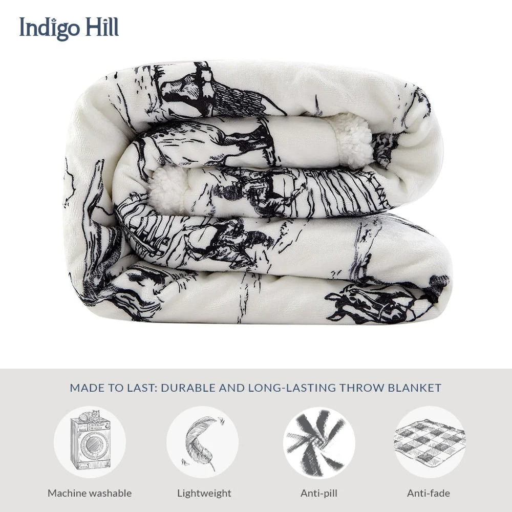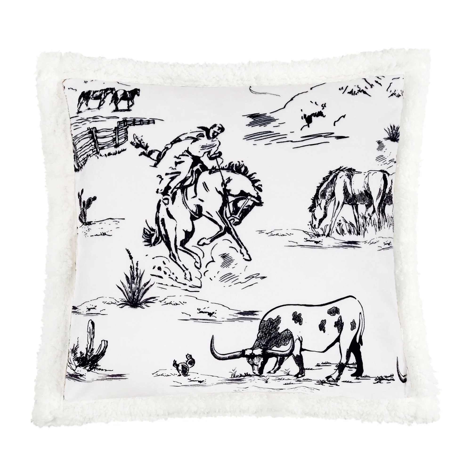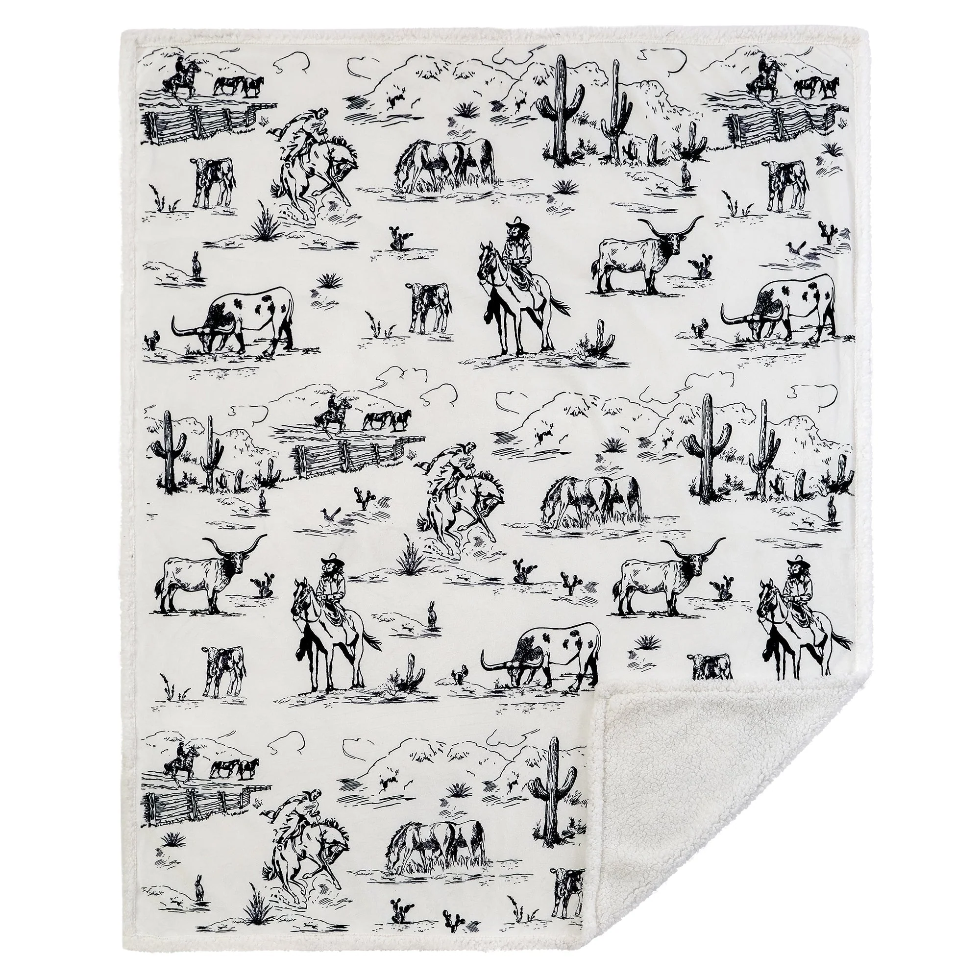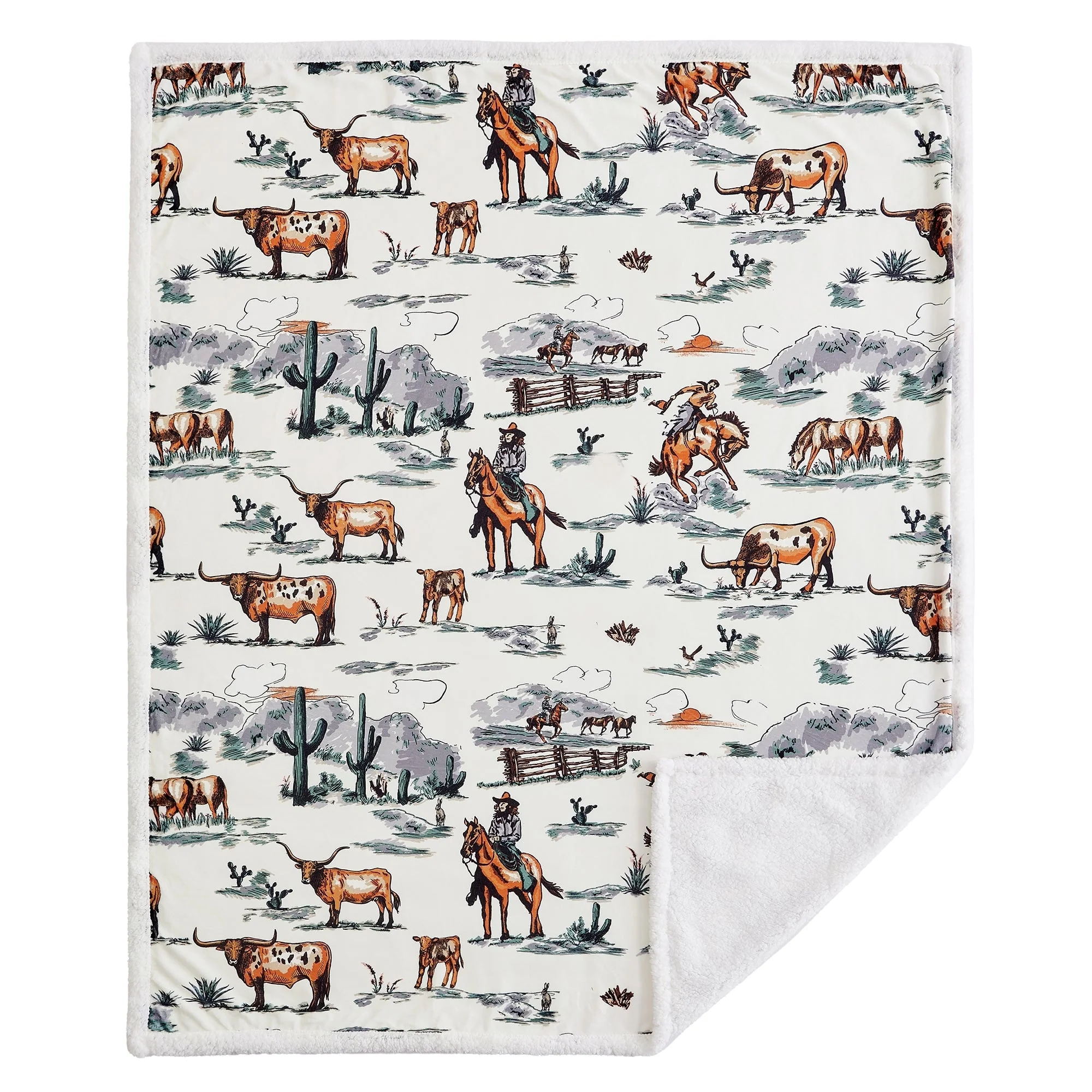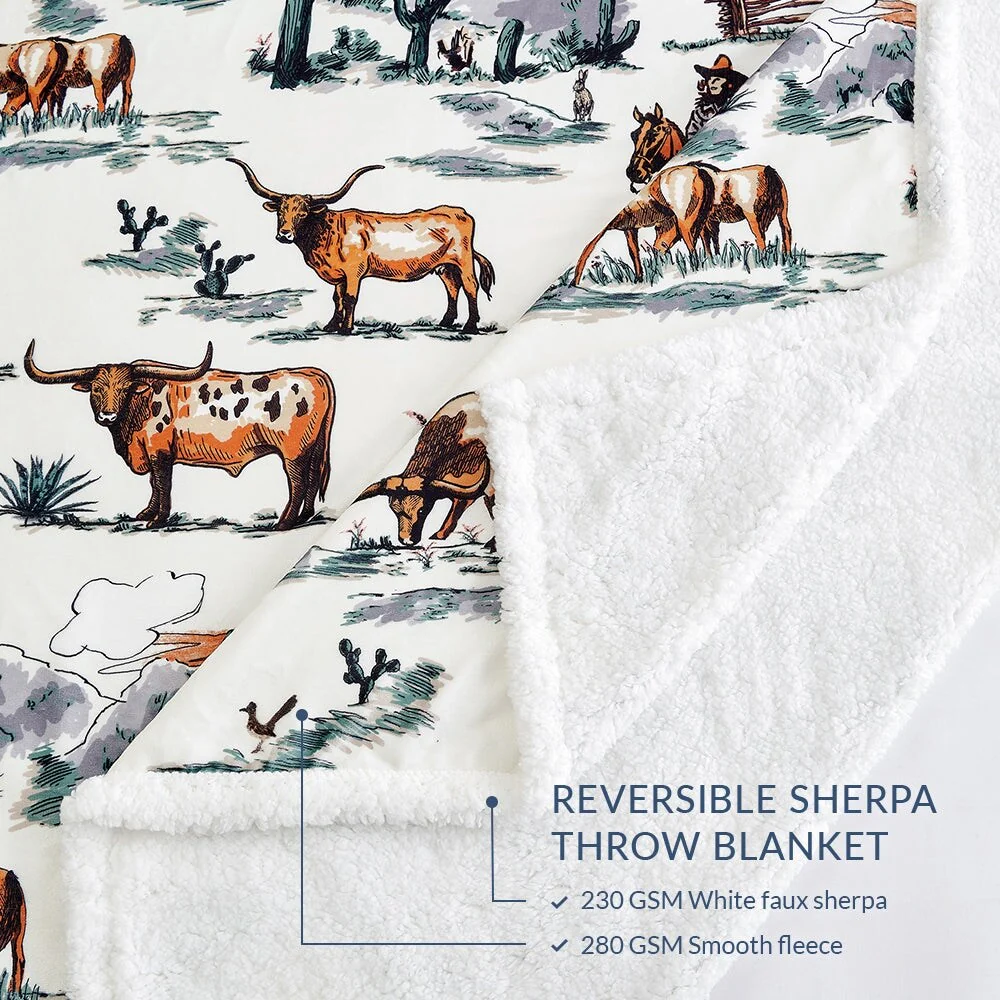 Steep yourself in Western nostalgia with our Ranch Life Western Toile Campfire Sherpa Throw. Showcasing vibrant scenes of wrangling cowboys, grazing herds, and wildlife, all draped in colors as soothing as a desert sunset, it's a cowboy's dream come true. Easy to care for and backed with cozy sherpa, this throw serves as a versatile partner for home relaxation and campfire tales alike. And the best part? We've wrangled it into a price range that won't rustle your budget. Part of our Campfire Throws Collection.