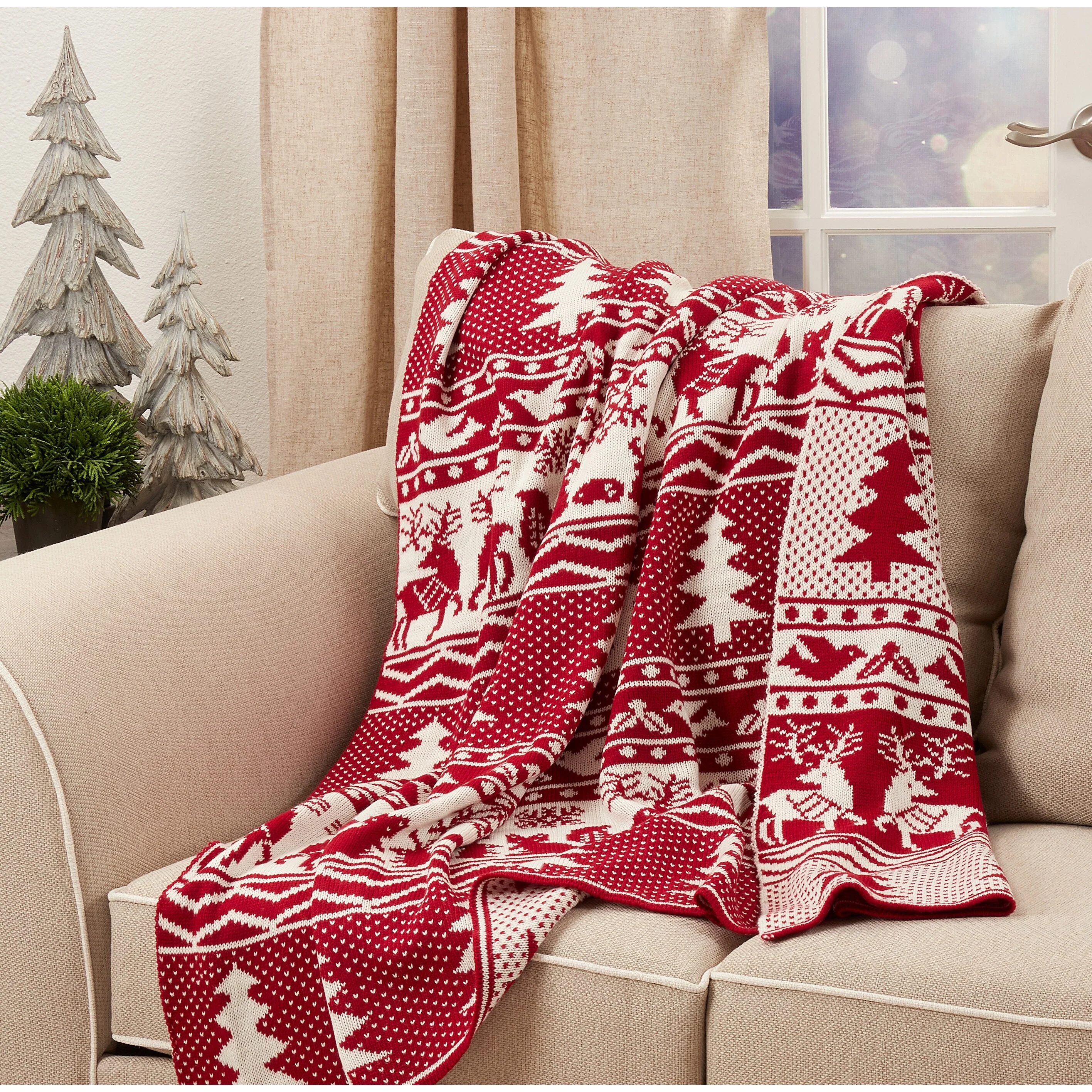 Keep warm and cozy during the holiday season, with this gorgeous Reindeer and Christmas Tree Knit Throw. Plush and comfortable, perfect for any room. The design features a traditional red and white color combination to make coordinating with existing holiday decor easy.