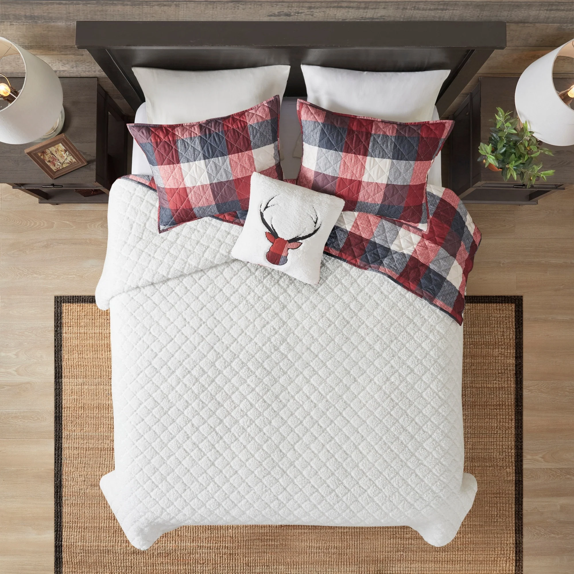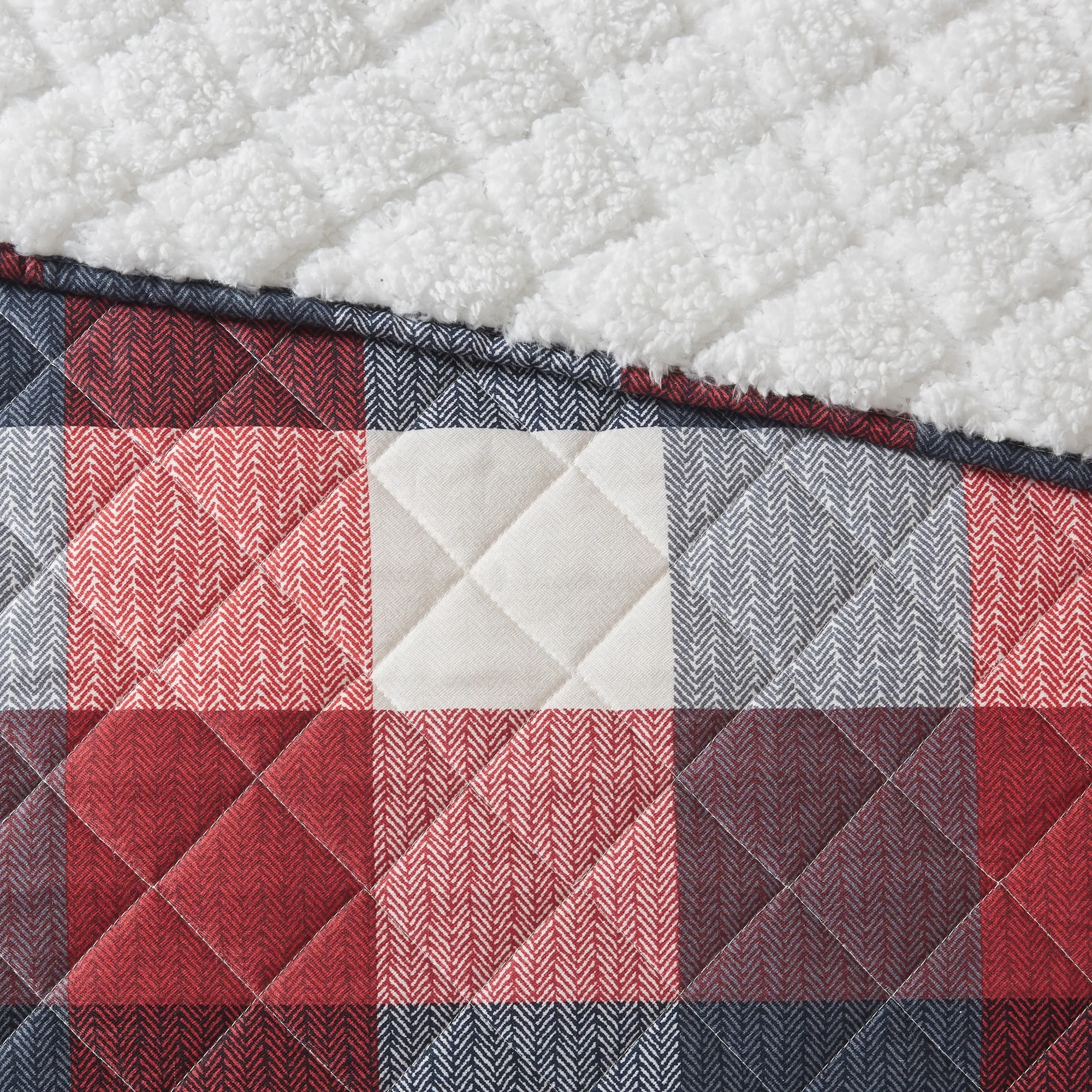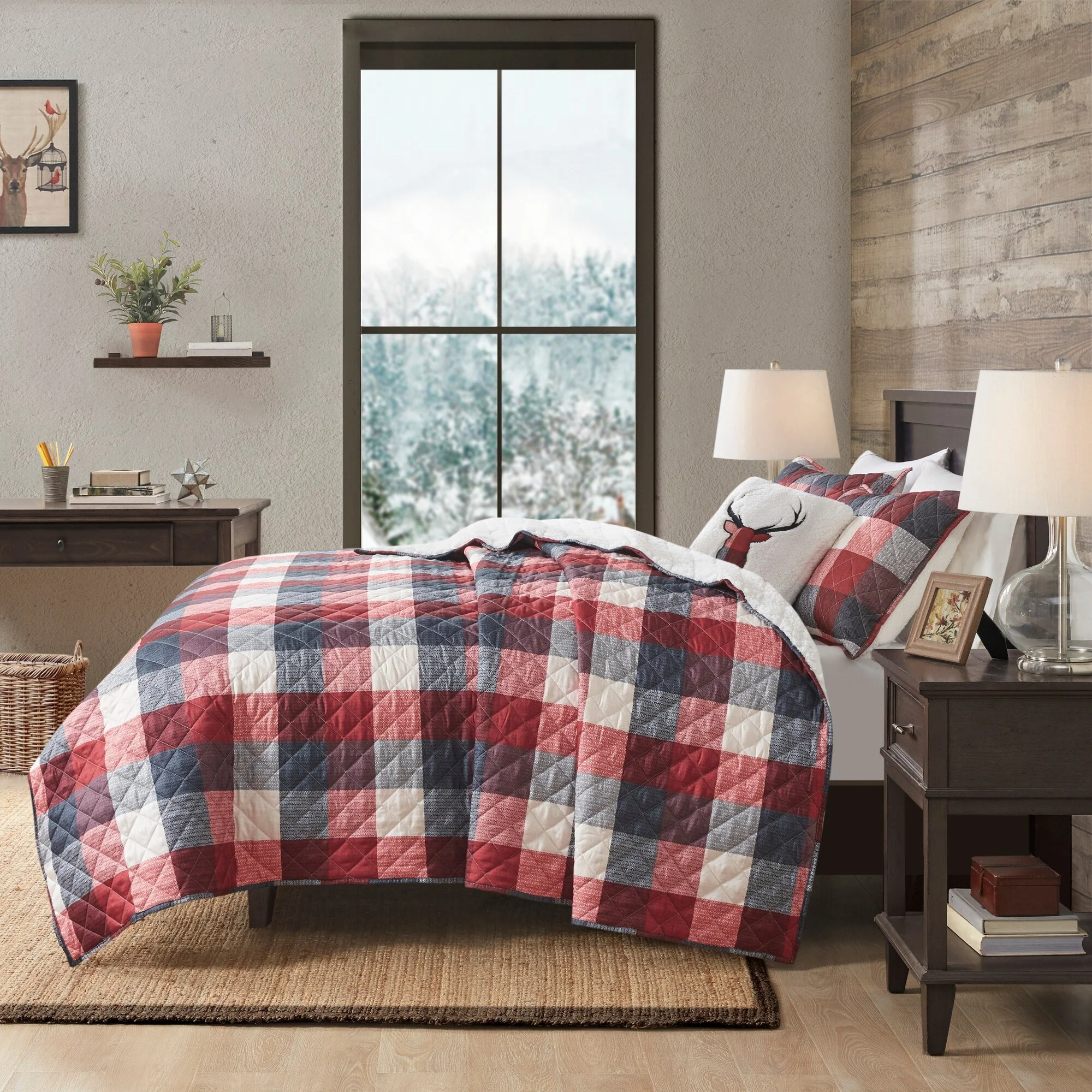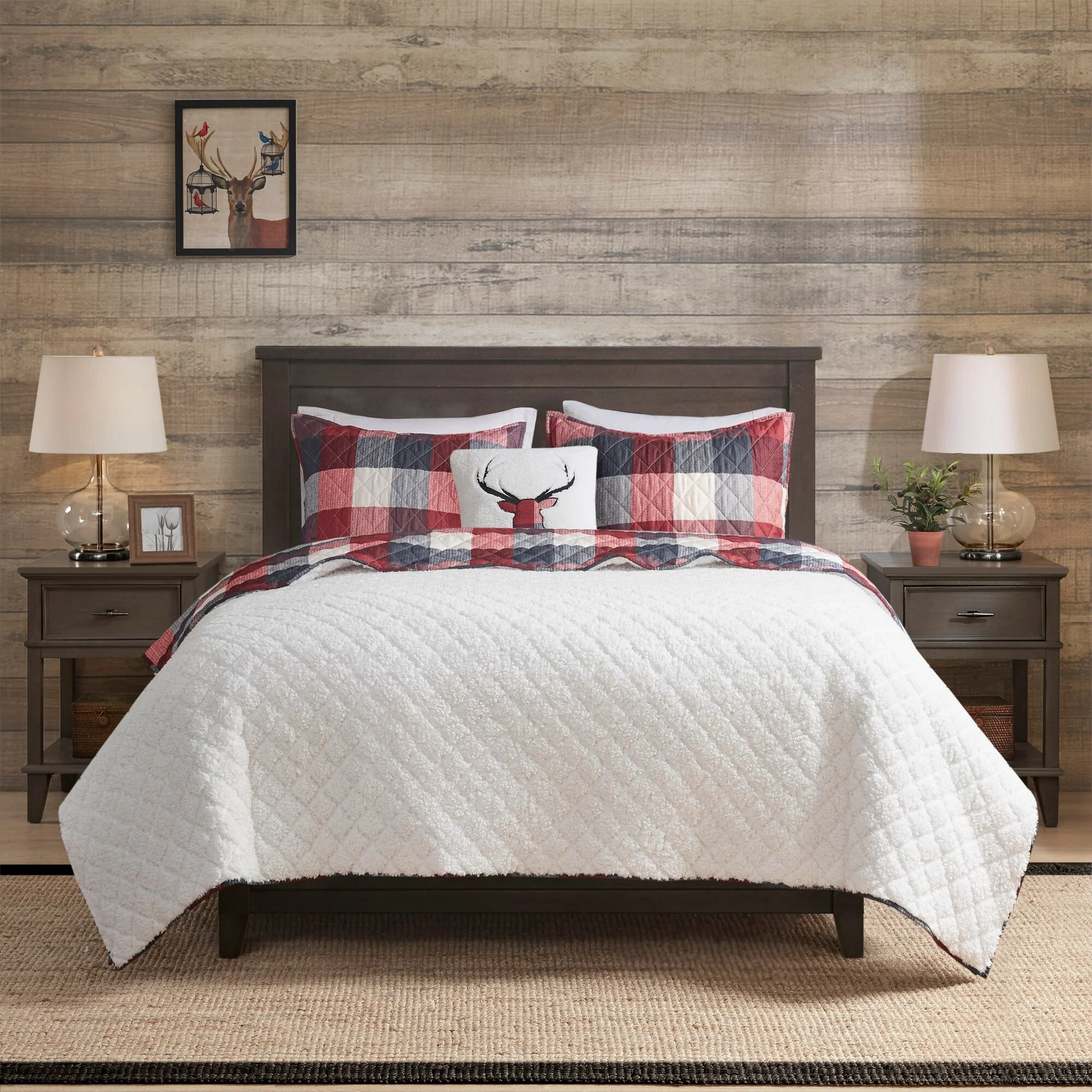 Sleep in warm, cozy comfort with the Madison Park Meadow 4 Piece Printed Herringbone to Sherpa Reversible Coverlet Set. This cabin style coverlet features a red buffalo plaid pattern with a cozy sherpa reverse, for added warmth and comfort. Channel quilting along the coverlet adds a delicate touch to the country look. The 2 matching shams pair handsomely with the coverlet, while a square decorative pillow with a deer applique adds the finishing touch to this lodge style coverlet set. Machine washable for easy care, this reversible farmhouse coverlet set is OEKO-TEX certified, meaning it does not contain any harmful substances or chemicals to ensure quality comfort and wellness.