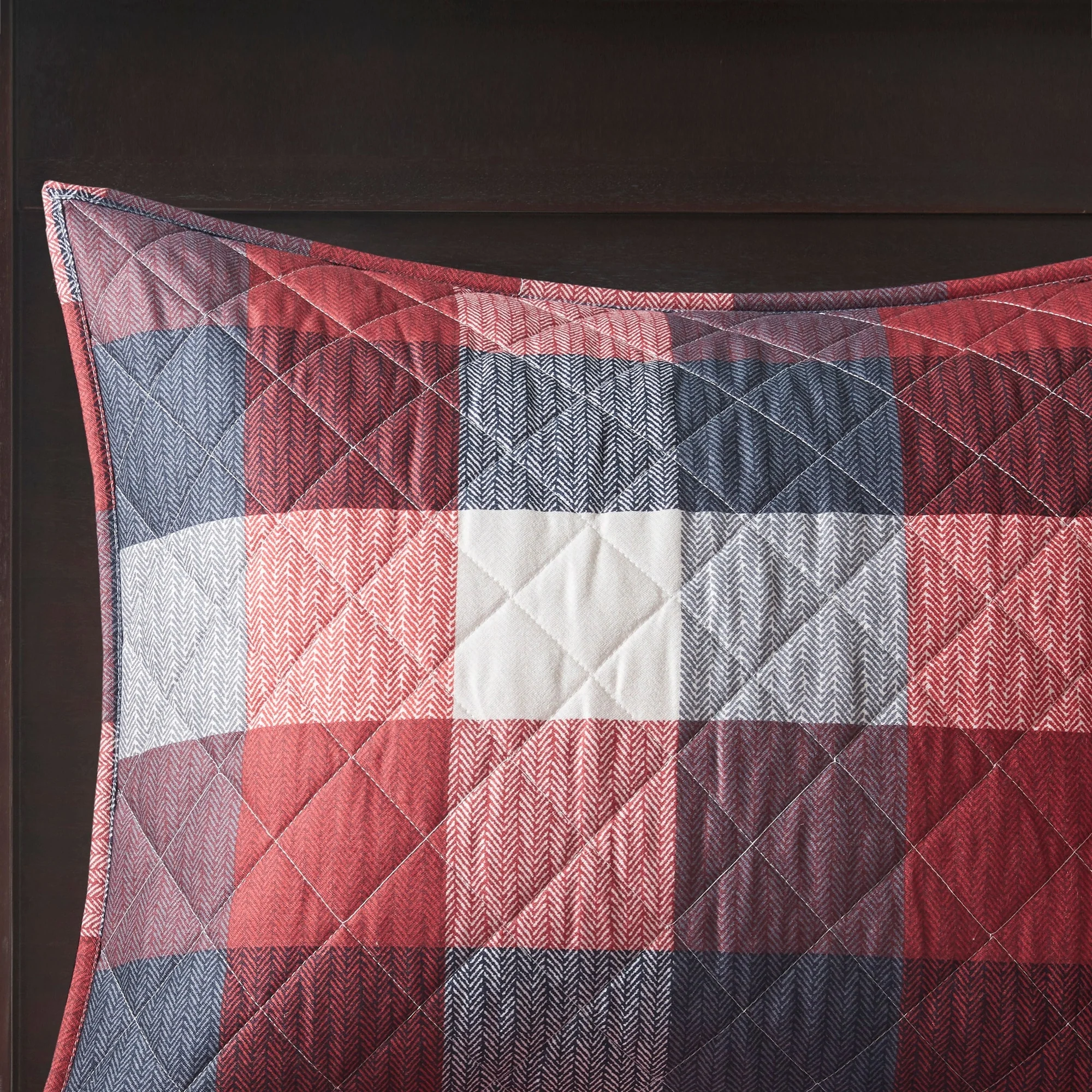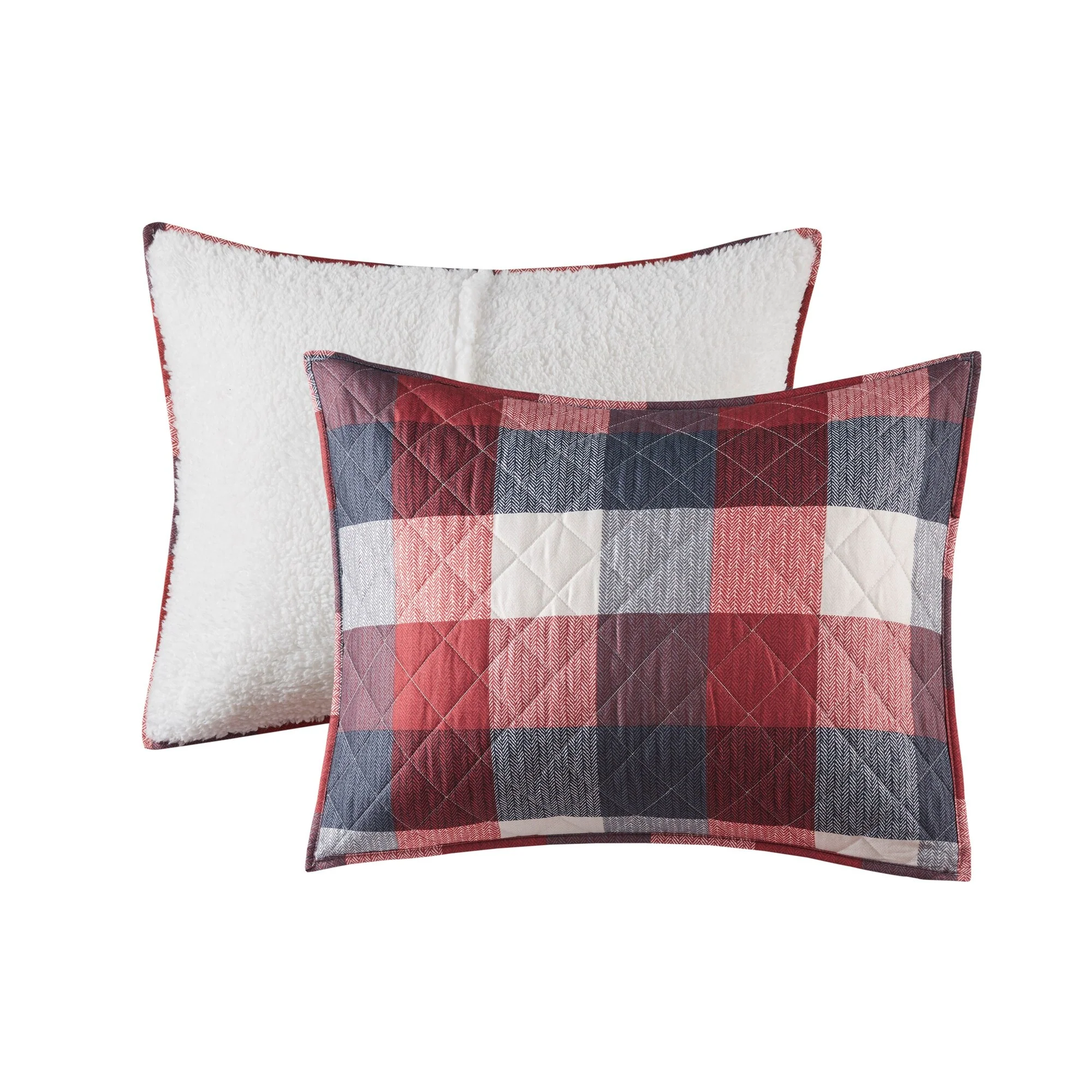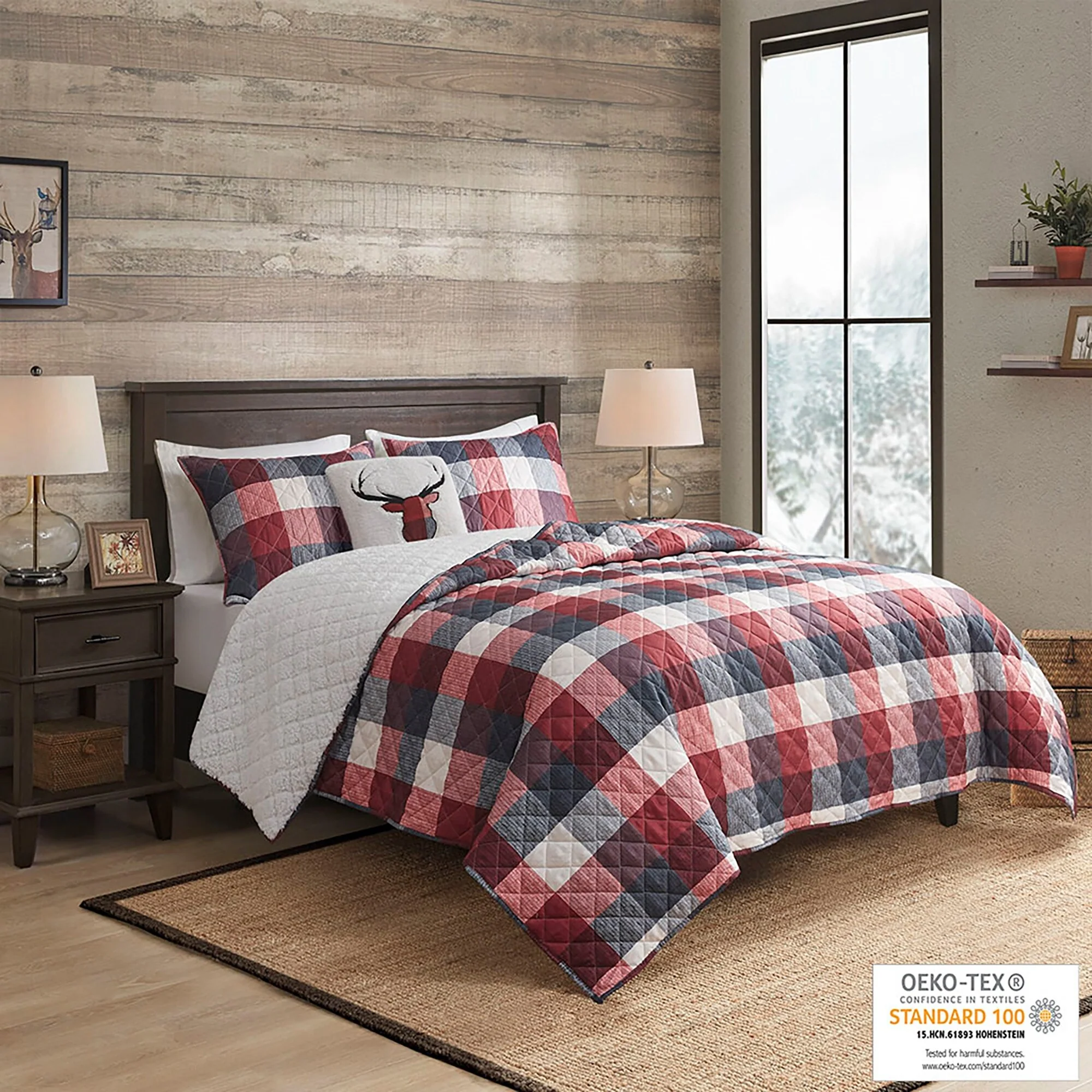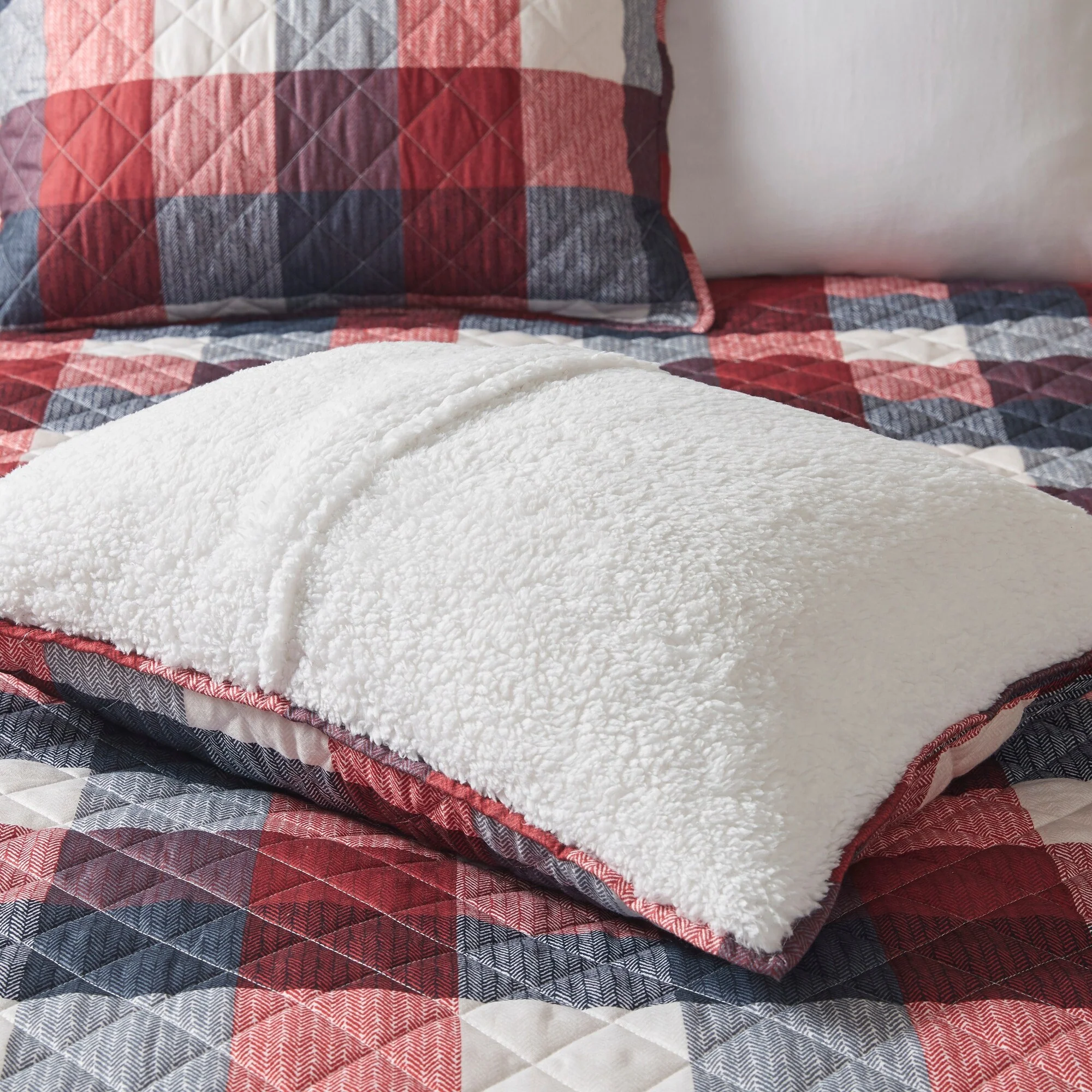 Sleep in warm, cozy comfort with the Madison Park Meadow 4 Piece Printed Herringbone to Sherpa Reversible Coverlet Set. This cabin style coverlet features a red buffalo plaid pattern with a cozy sherpa reverse, for added warmth and comfort. Channel quilting along the coverlet adds a delicate touch to the country look. The 2 matching shams pair handsomely with the coverlet, while a square decorative pillow with a deer applique adds the finishing touch to this lodge style coverlet set. Machine washable for easy care, this reversible farmhouse coverlet set is OEKO-TEX certified, meaning it does not contain any harmful substances or chemicals to ensure quality comfort and wellness.