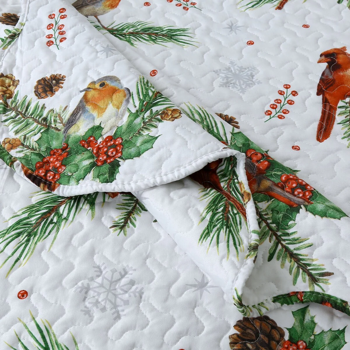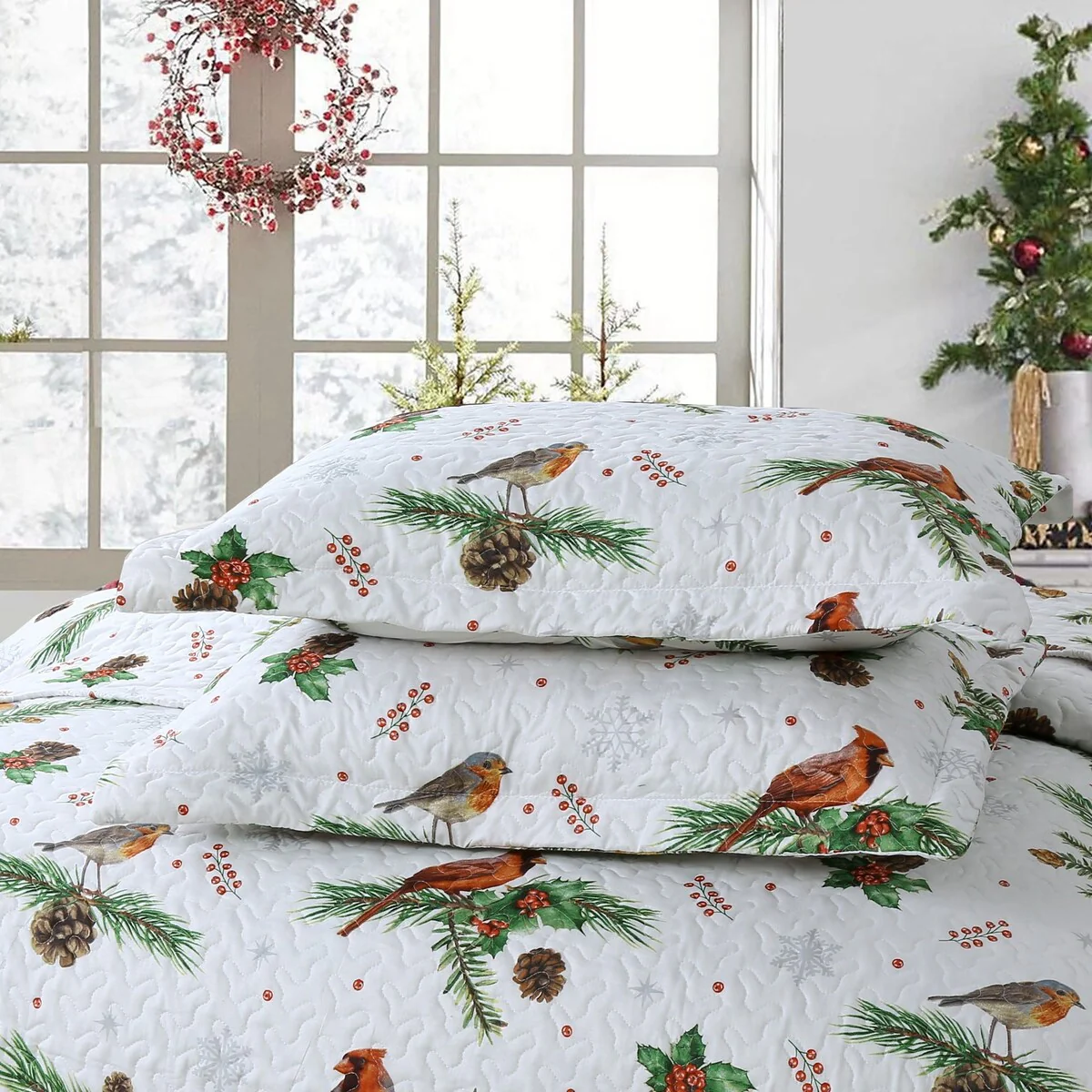3 Pcs Winter Cardinals Christmas Quilt Bedspread Set