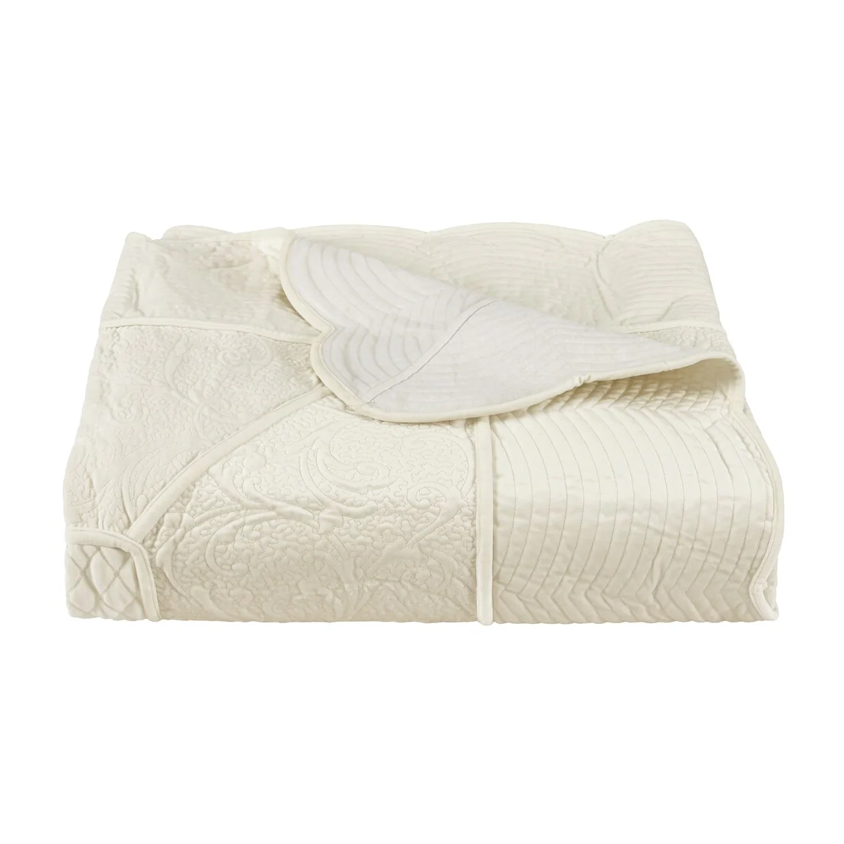 Celebrate the holidays at home with the Marissa - Winter White Quilt Set, which offers lavish velvet softness and elegance. Detailed embroidery throughout the coverlet is combined with scalloped edges, layered with embroidery and an intricate vermicelli scroll design. The top section is quilted with a diamond pin dot in the center, creating a beautiful bordered look. Complete the Marissa - Winter White collection and decorate the season in style with luxurious Holiday bedding, bath and window from J. Queen New York. Available in Christmas crimson, evergreen or winter white color options.