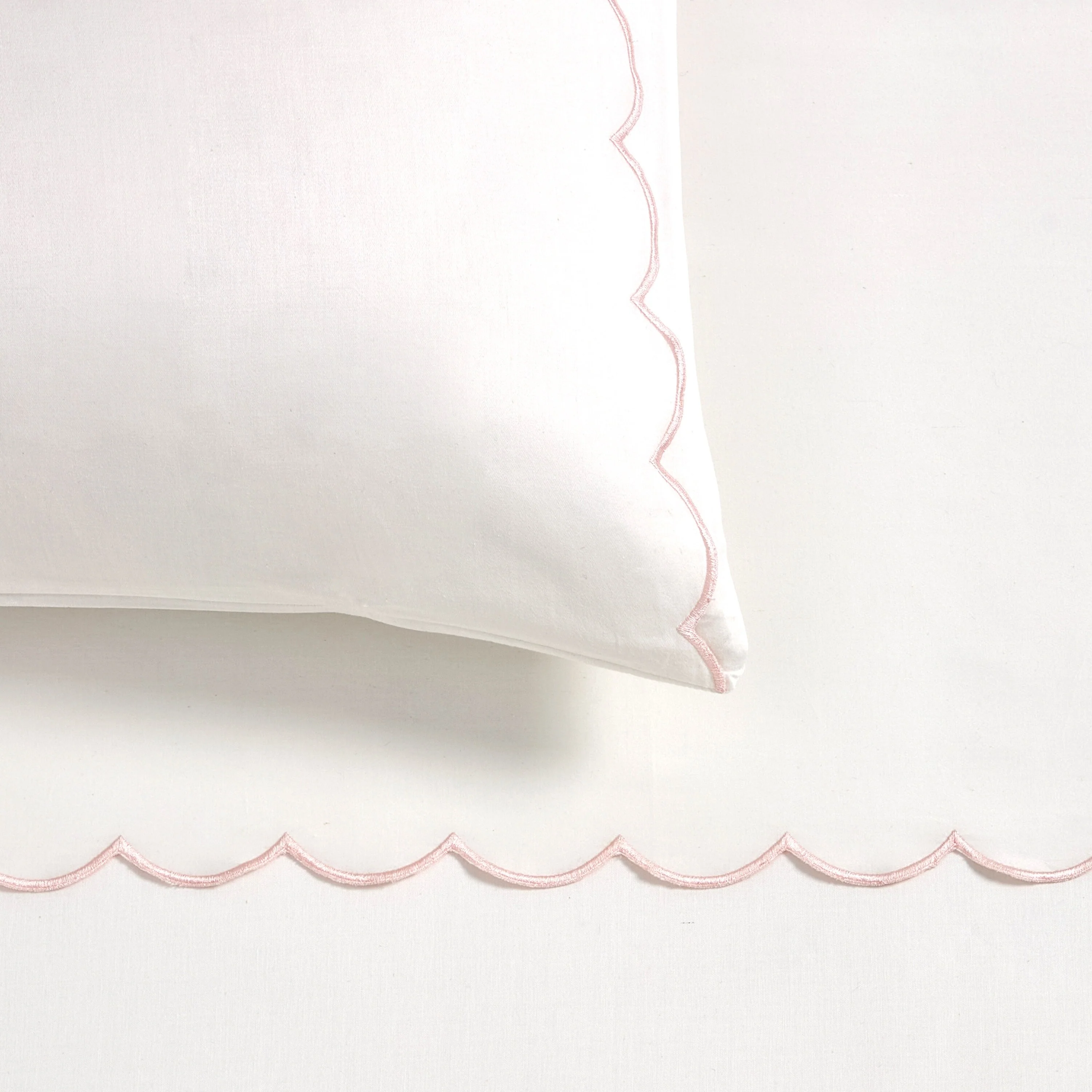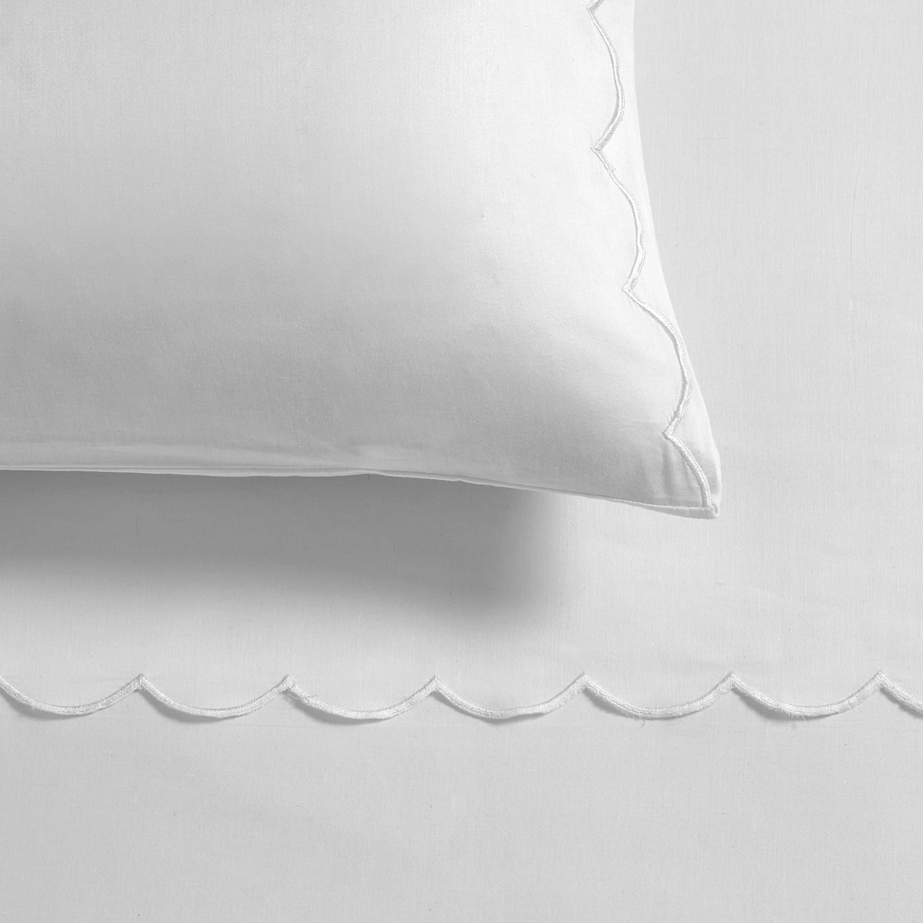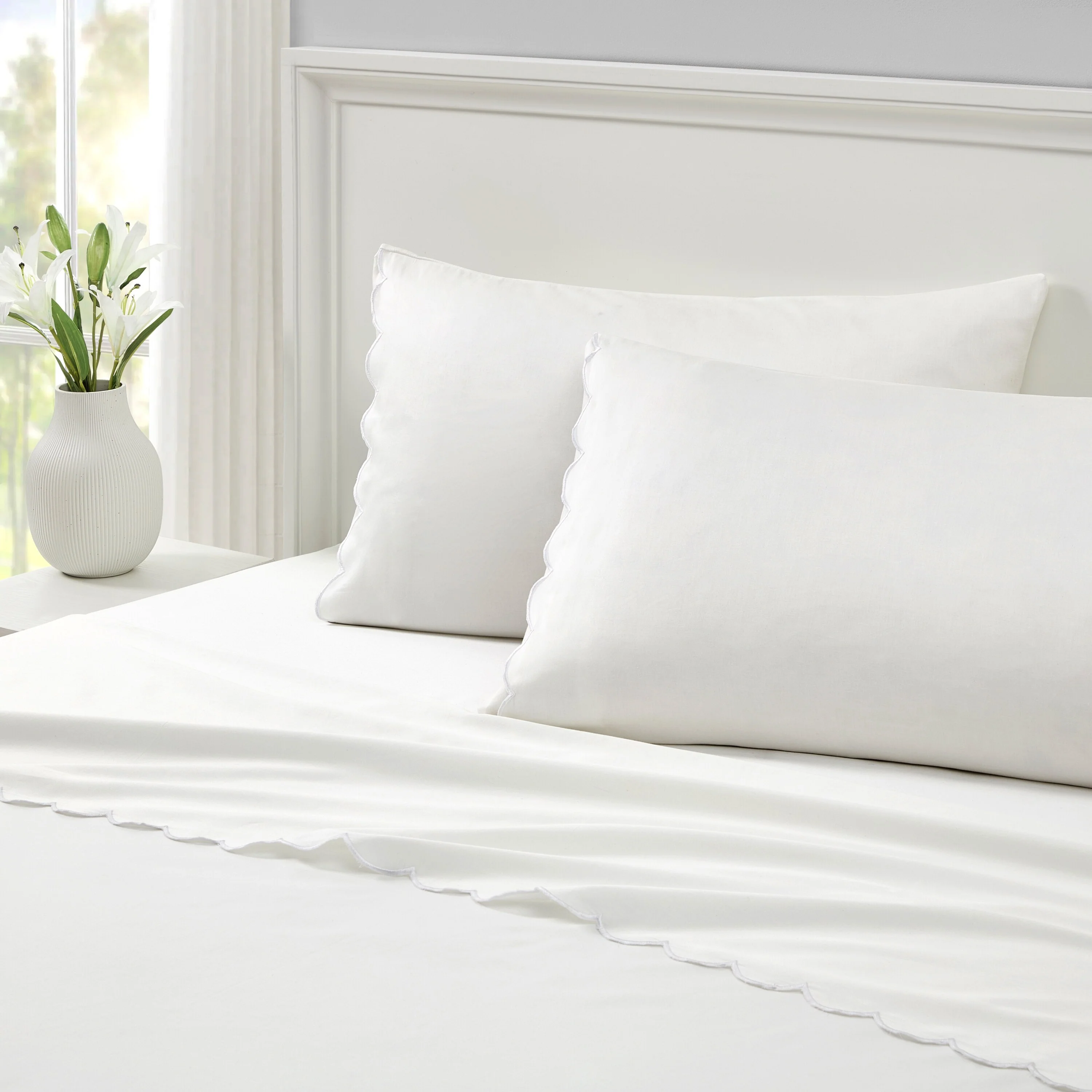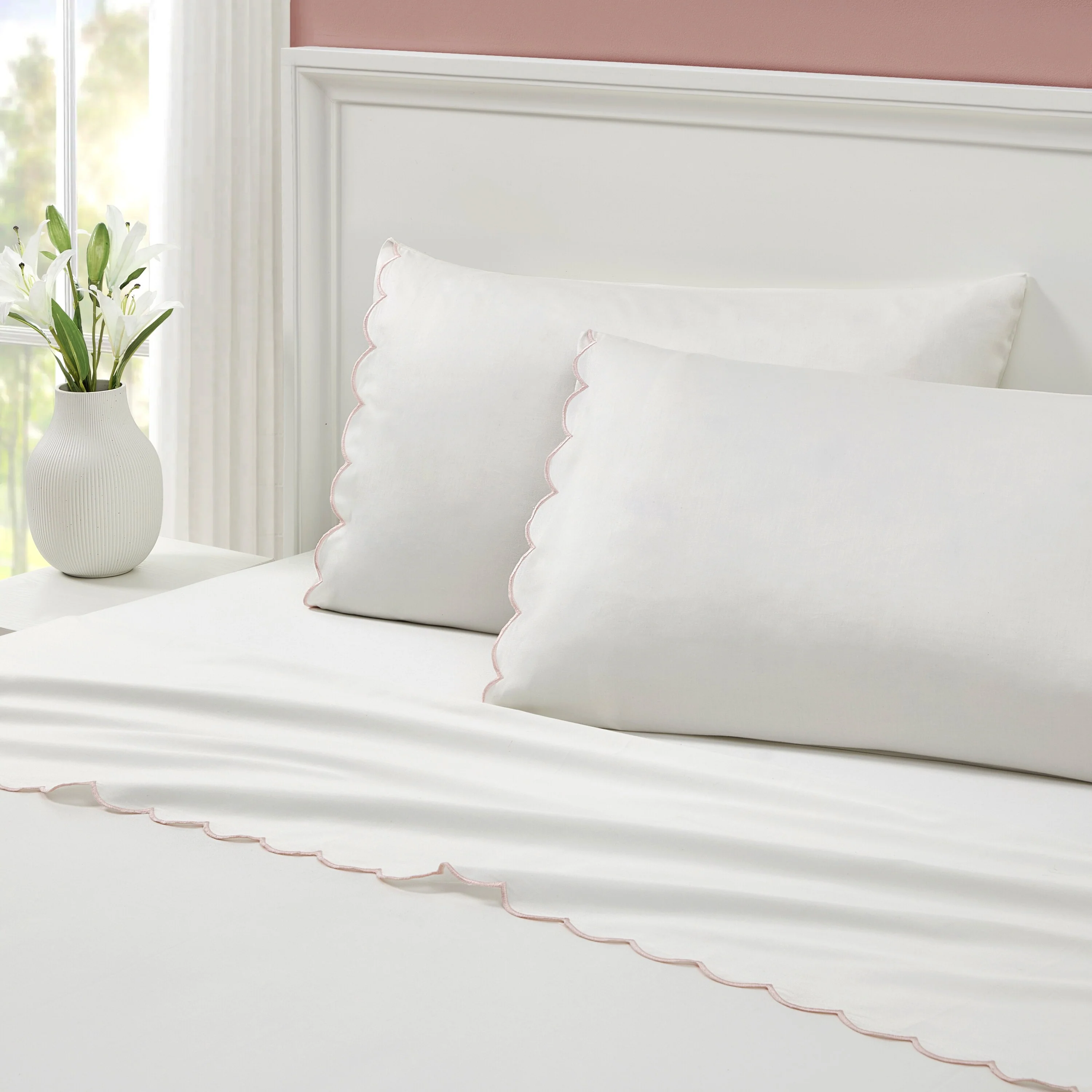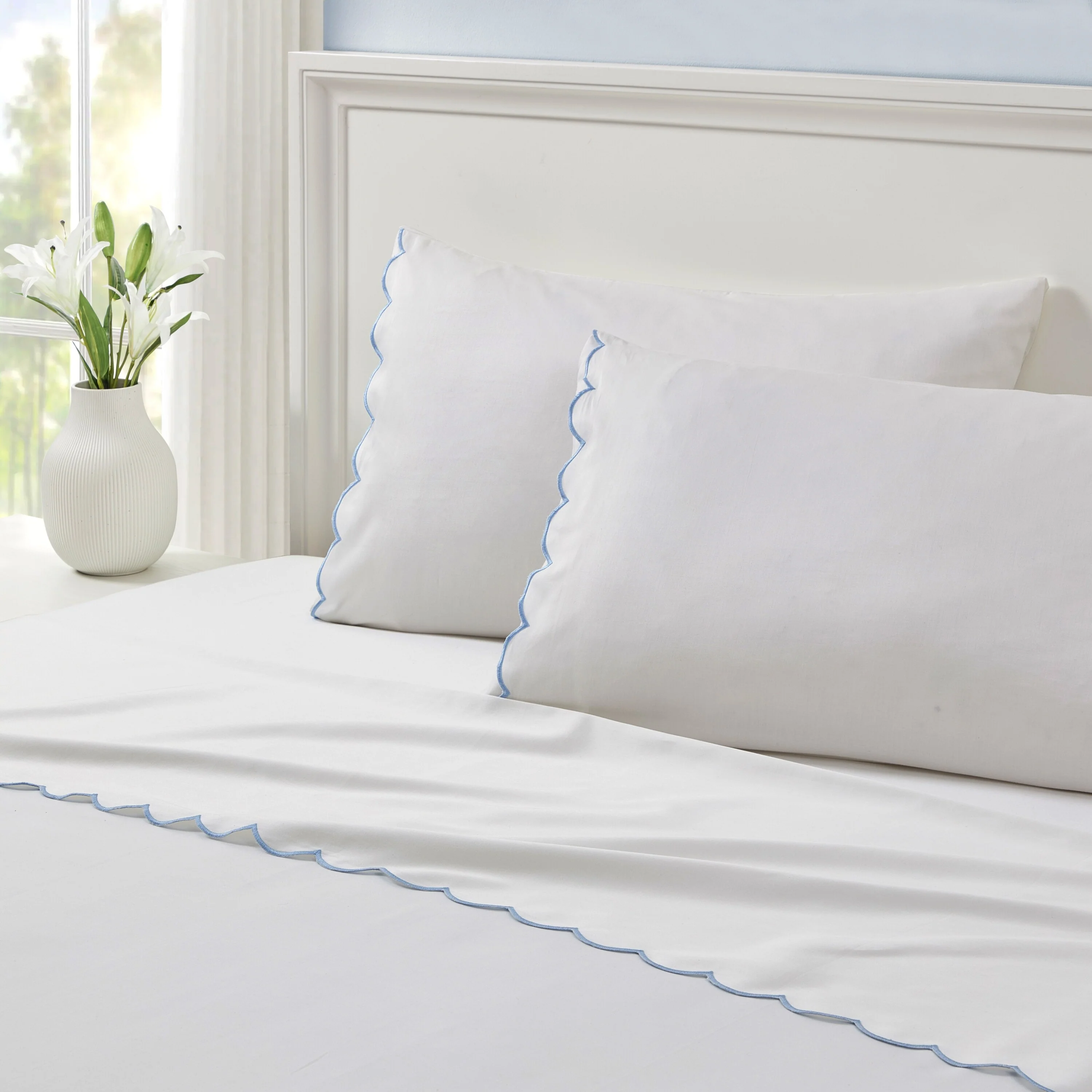 Add a touch of charm to your bedding with the Peri Home Scallop Pillowcase Pair. This crisp white sheet set is beautifully accented with an embroidered scallop hem in pink, white, or blue for a delicate and timeless detail. Made from cozy, soft cotton, these sheets promise restful sleep.