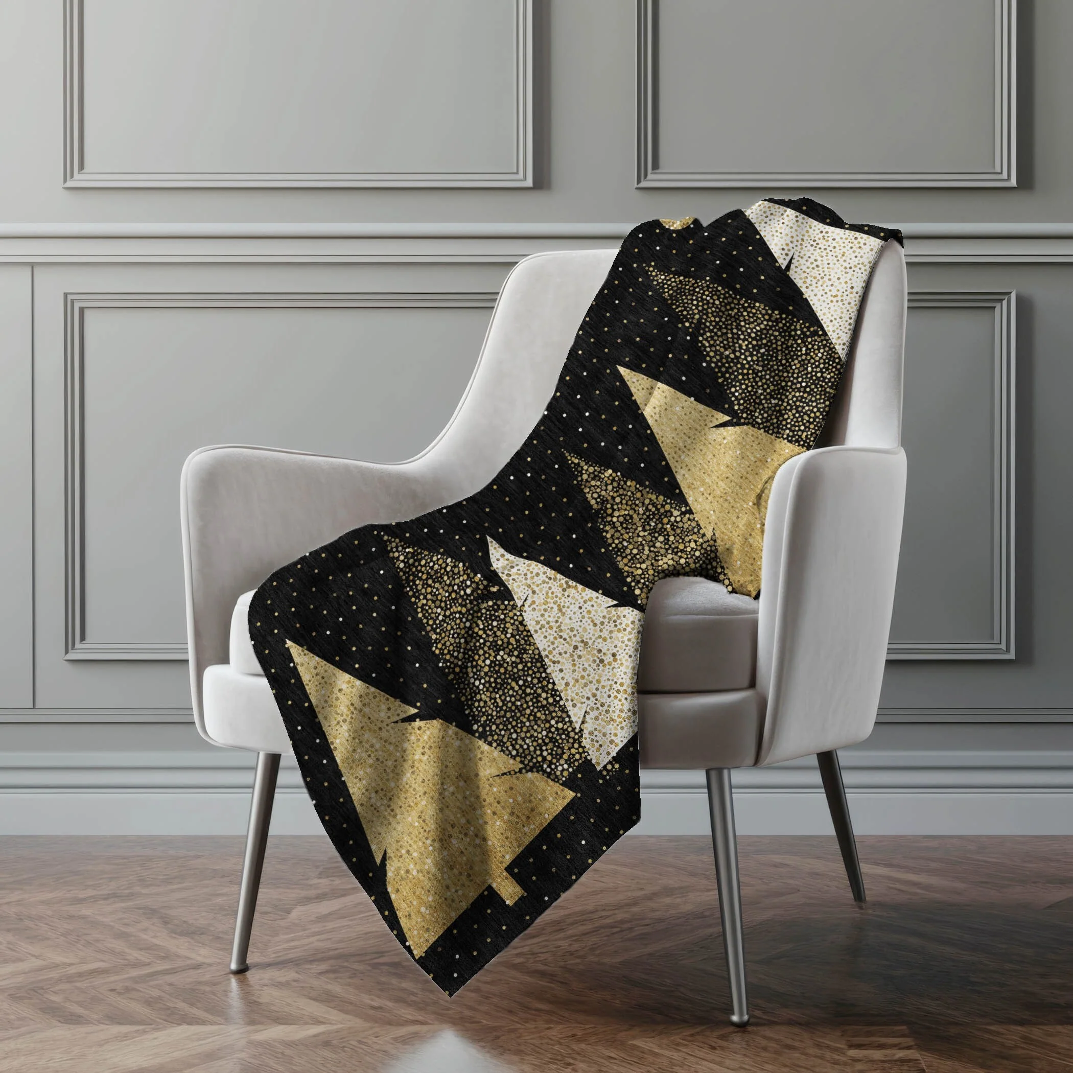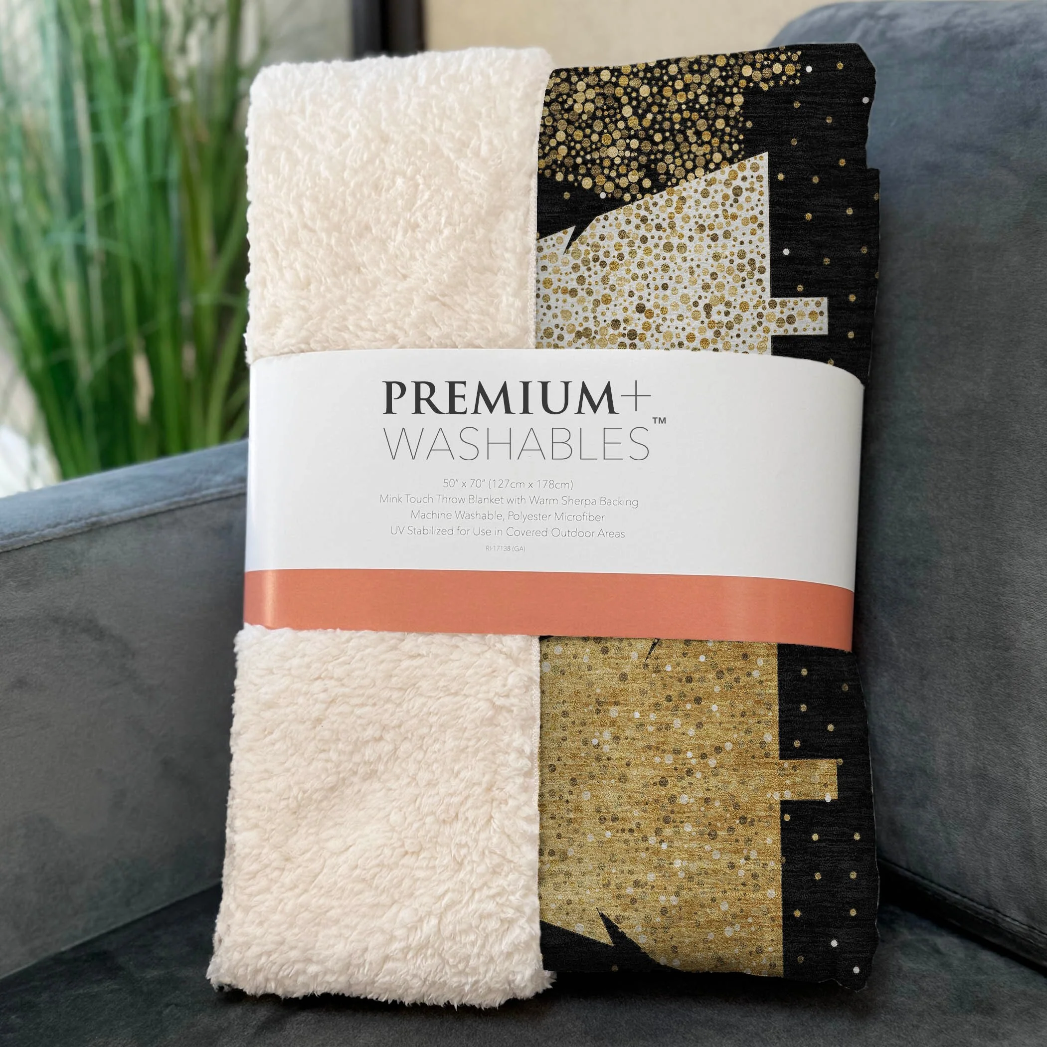 Immerse your home in festive wonder as shimmering gold trees dance on a rich black field, offering a beautiful accent to holiday decor. Expansive 50" x 70" dimensions embrace you with the exquisite softness of a soft-touch front and cozy sherpa backing, ensuring warmth and comfort throughout the season. Thoughtfully designed with fade-resistant polyester microfiber, it's perfect for indoor and covered outdoor settings, while machine-washable convenience makes it a breeze to maintain.