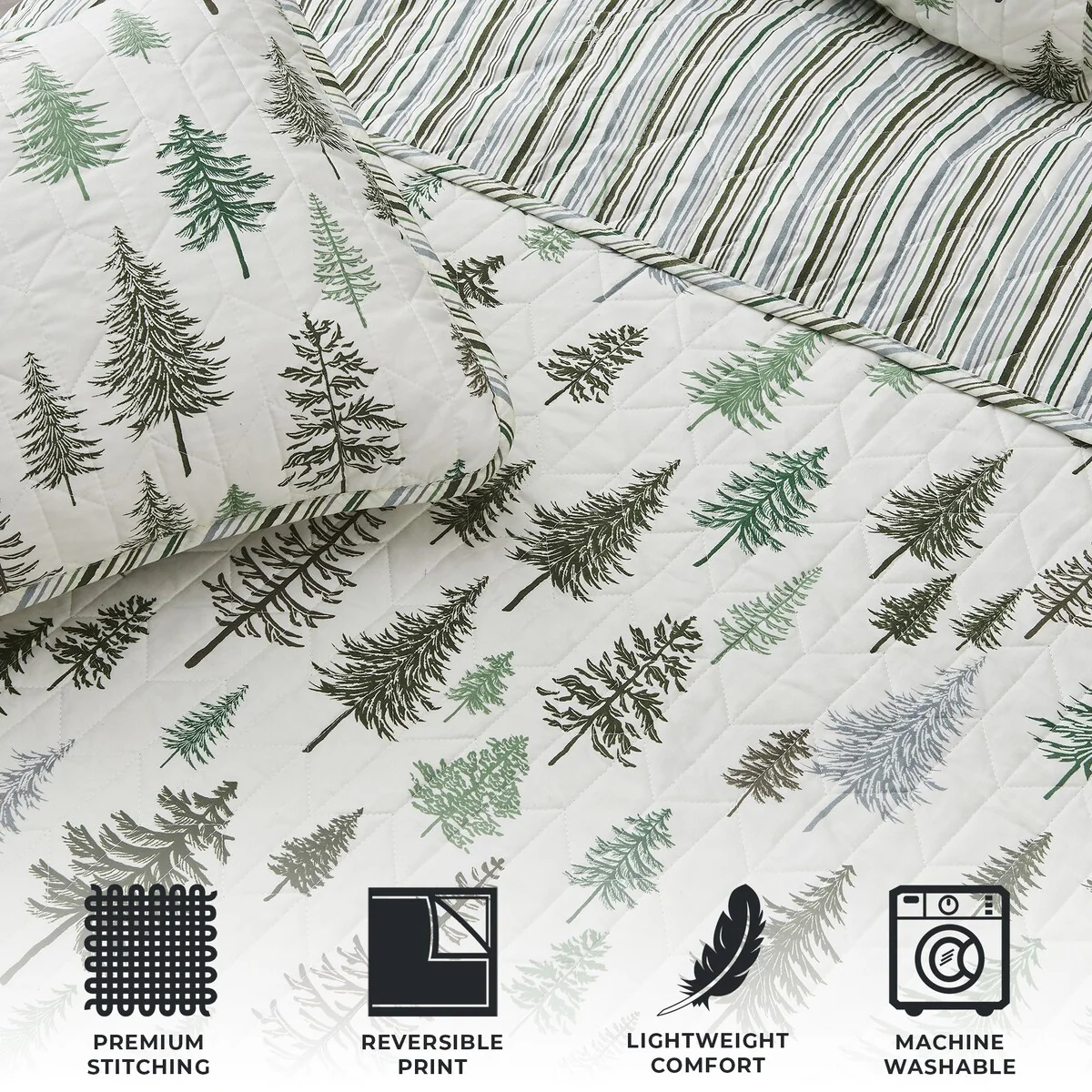 Immerse yourself in a quilt set that will enhance your bedroom decor with evergreens and a tasteful stripe design. This quilt is perfect for those who love spending time outside in nature, you can bring that beauty inside to your bedroom. Effortlessly style your room to enhance your decor and surround yourself with nature.