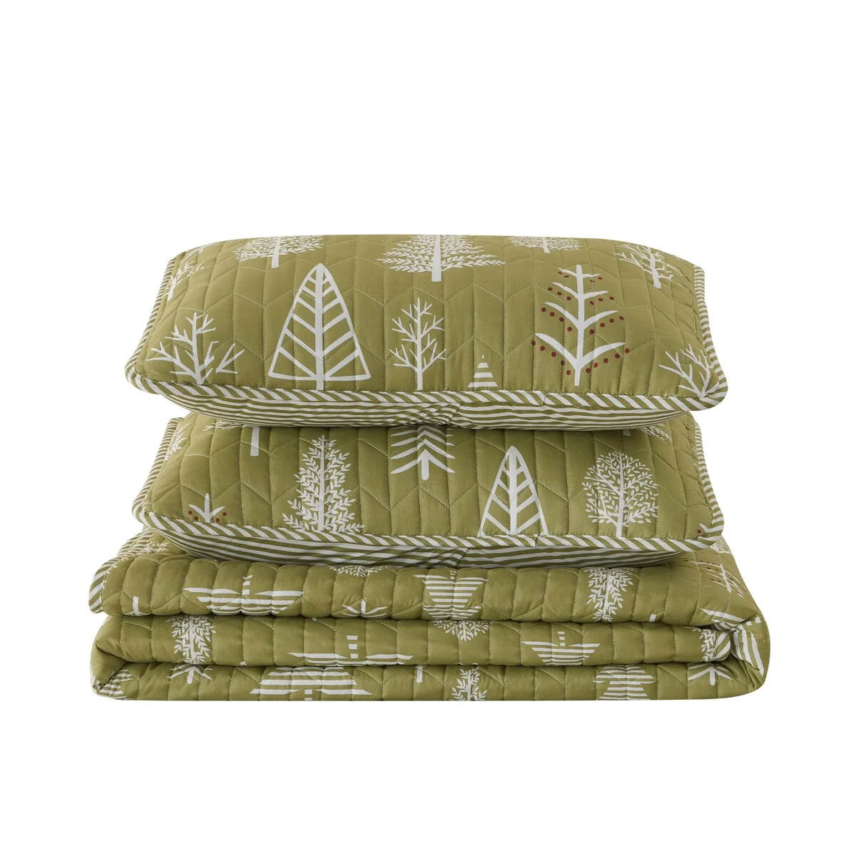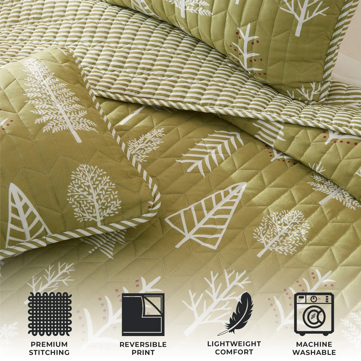 This bedding set fits with your rustic cabin decor to create a cohesive bedroom style! The sage green color, white tree silhouettes, and little pops of red make this a versatile yet unique set to add to your bedroom style. This quilt was crafted for style and lightweight warmth while offering your decor a cozy feel. Are you looking to switch out the design? Simply flip the quilt to reveal its simple reverse side.