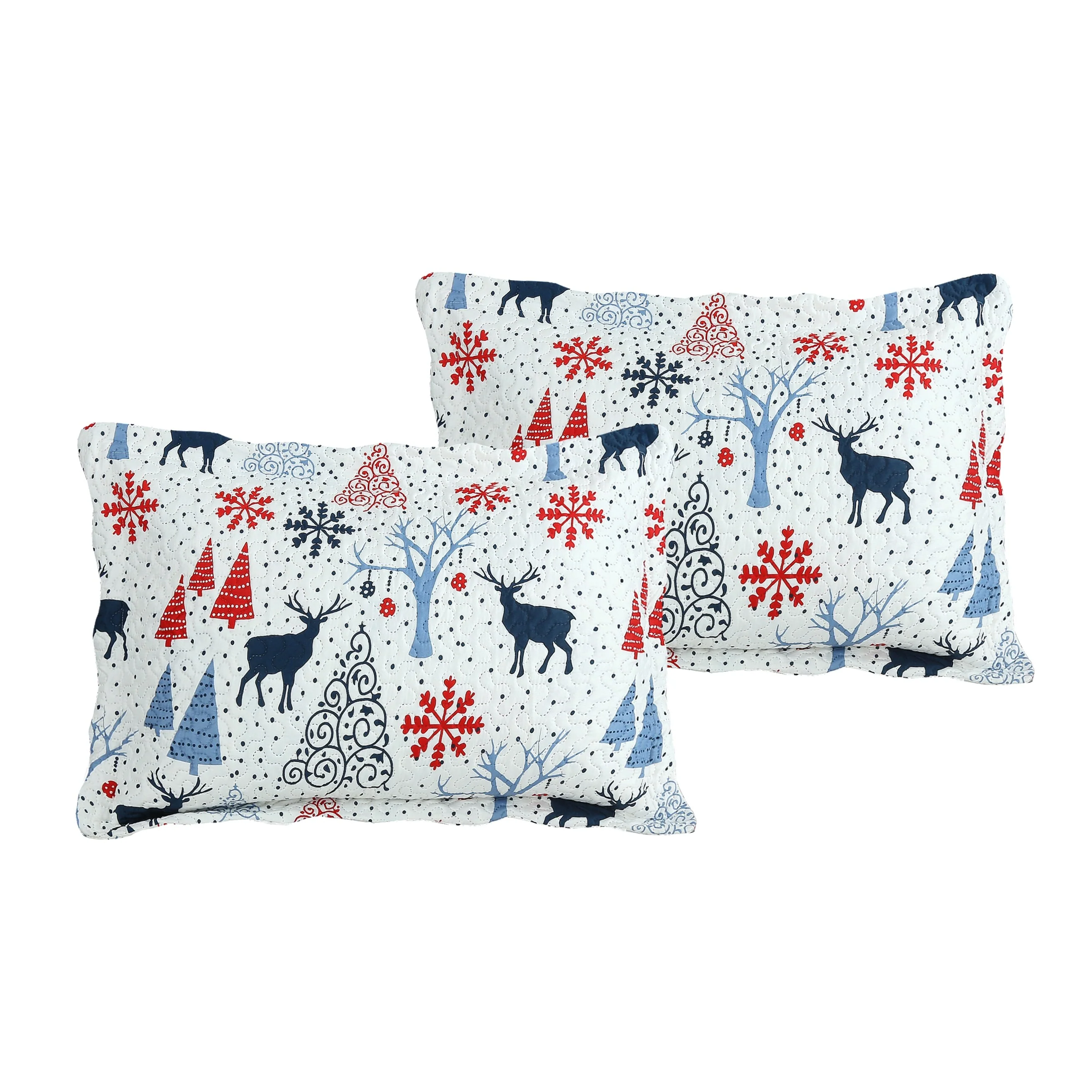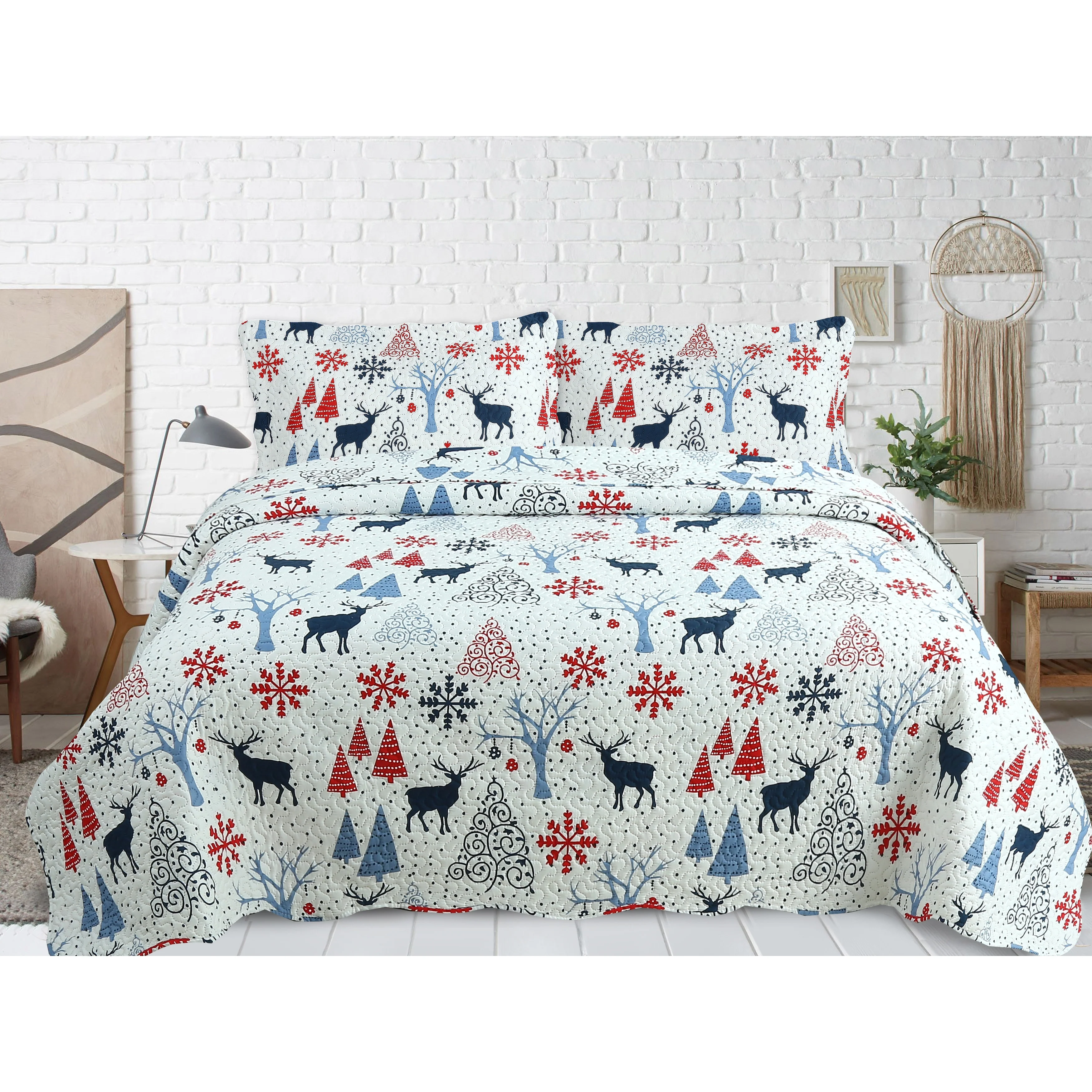 Printed Modern Design: This Unique Decorative Printed Embossed Quilt Sets is Perfect for Home Decoration. This Modern Christmas Pattern is Consist of Xmas Reindeer Snowflake Christmas Tree Deer Ornaments Pattern Blue Red Navy Color with White Base. Fine Linen Breathable Elegant and Reversible Luxury Lightweight Quilt Bedding Set. Perfect Choice for Homeowners with Sophisticated Tastes in DecorationDimension: Twin Single Size Included 1 Quilt - 68 x 90" and 1 Pillow Sham - 20 x 30 + 2"; Queen Full Size Included 1 Quilt - 92 x 94" and 2 Pillow Shams - 20 x 30 + 2"; King Size Included 1 Quilt - 106 x 94" and 2 Pillow Shams - 20 x 40 + 2". If You Want the Quilt Cover the Sheets or Bed, Choose Larger Size of Quilt Set. Suitable for Hot Summer Night, Also Can Be Used as Bedsheet or Blanket in Winter, The Lightweight Quilts is Very Easy to Move Your Body Freely When SleepingContent Material - 100% Brushed Microfiber, Filled with 100% Polyester. This Quilt is Designed for All Season Use, It can Keep You Warm and Comfortable, But Not Too HotFeature - Durable, No Pilling, Super Soft, Wrinkle Free, Prewashed, Preshrunk, Fade Resistant, Cotton Touch. Beautifully Packed in a Zipper BagEasy Care Instruction - Machine Washable by Cold Water with Gentle Cycle. Launder Whites and Colors Separately. Use No Bleach on Colors. Tumble Dry Low