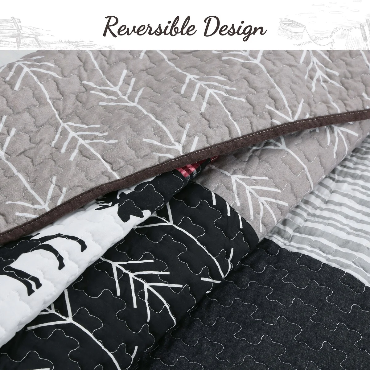Add a touch of rustic charm to your bedroom with this Real Patchwork Reversible Quilt Set featuring a classic lodge moose design. Made with 100-percent microfiber cover and backing, and a 100-percent cotton fill, this quilt set is comfortable, durable, and machine washable for easy care. The set includes one quilt and two shams, and is pre-shrunk to maintain its shape after washing.
