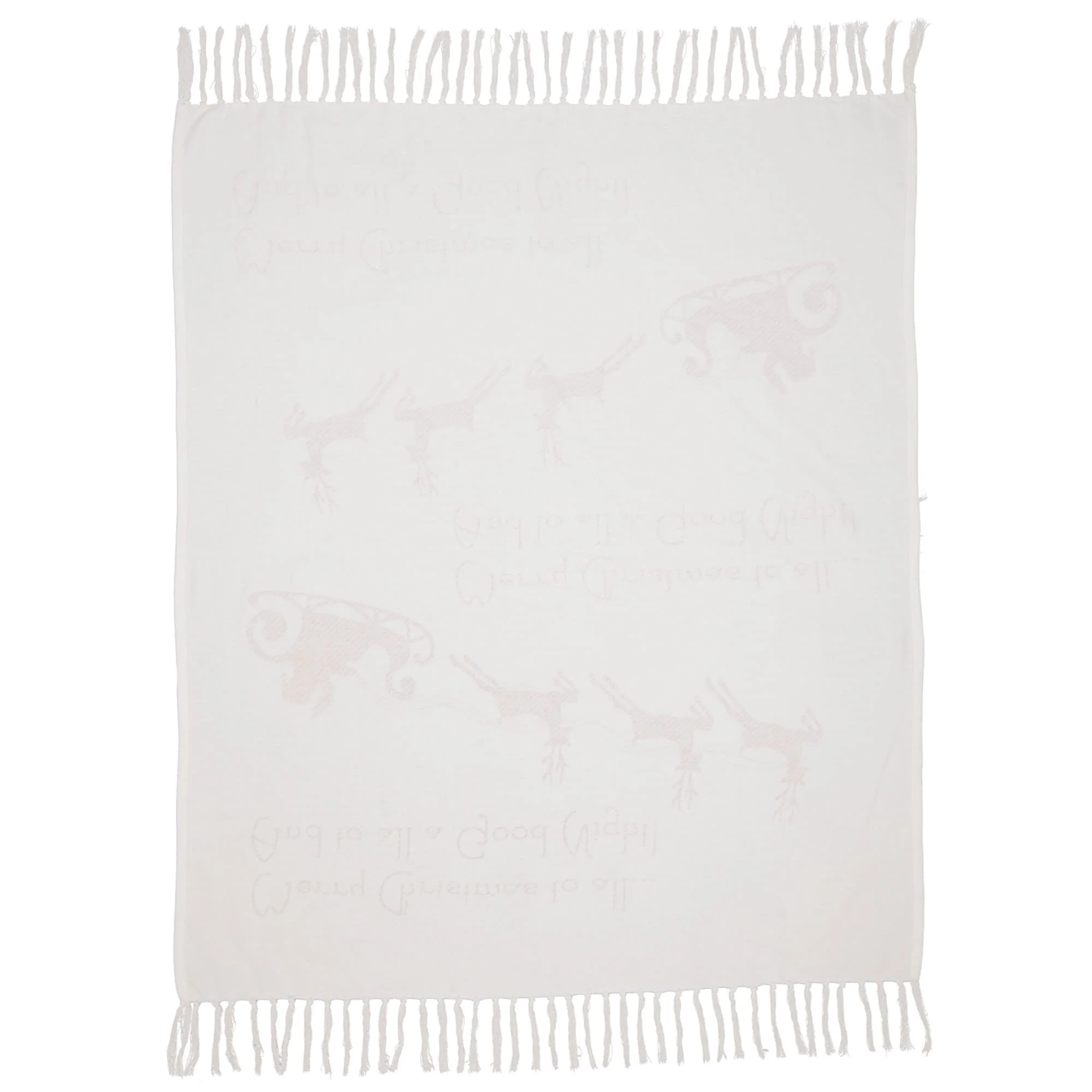 Curl up this Christmas with the Santa Sleigh Woven Throw. This 60x50 white cotton throw features red Santa's sleigh with his reindeer and the words "Merry Christmas to all ... And to all a Good Night". The knotted tassels on the top and bottom of this whimsical throw add rustic, elegant charm. Place on the bed, sofa, or couch to add a little extra Christmas flair in your home. 100% cotton.