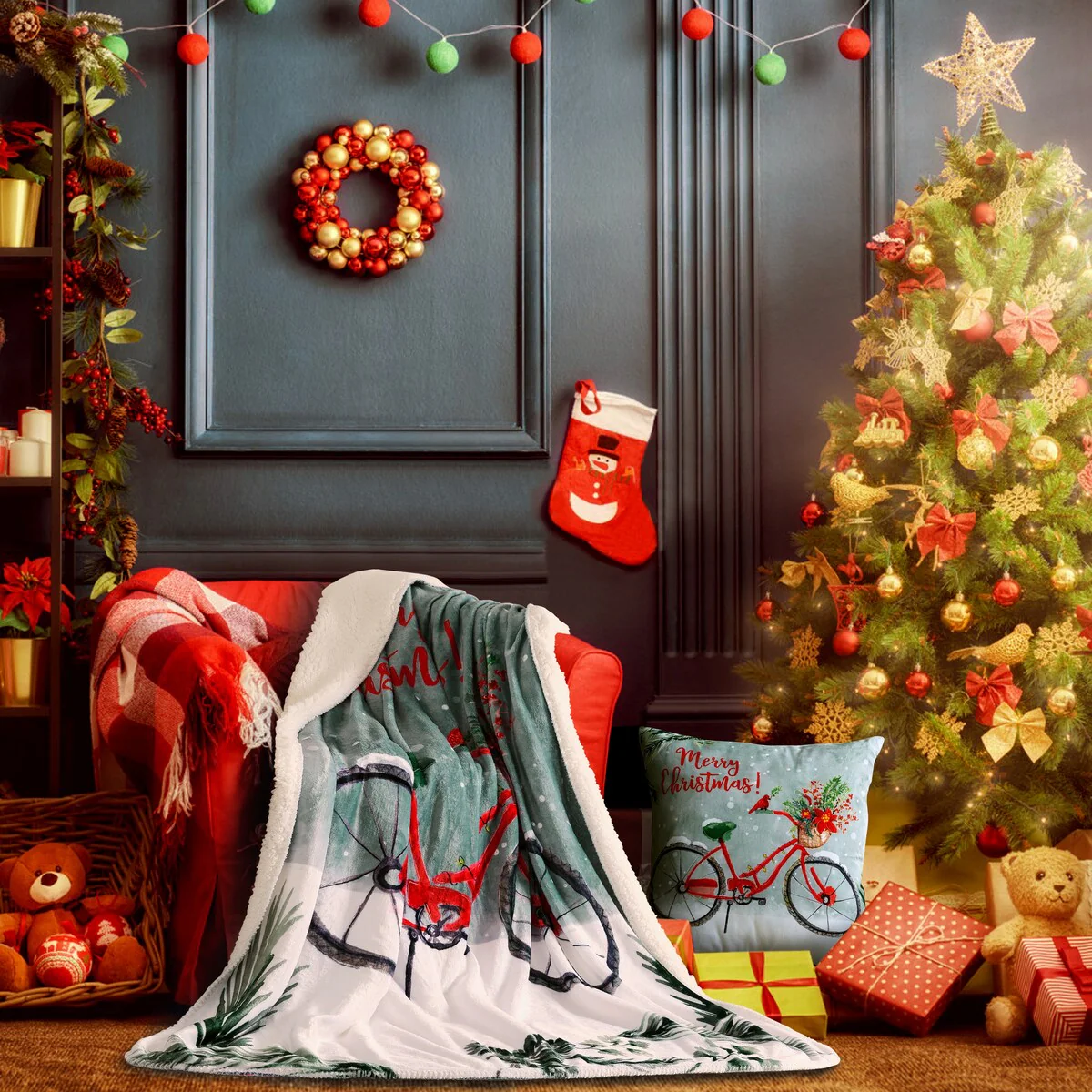 This Christmas bicycle decorative throw will bring all the holiday spirit into your home. With a beautiful watercolor design by talented artist Sara Berrenson, this cozy throw will surely make your holidays more enjoyable. ��Includes one 50x60 in. throw��Beautiful holiday watercolor print designed by artist Sara Berrenson��Super soft fleece fabric on one side and cozy sherpa lining on the other side���Perfect blanket for cuddling up on the couch��Machine washable��Coordinating throw pillow sold separately