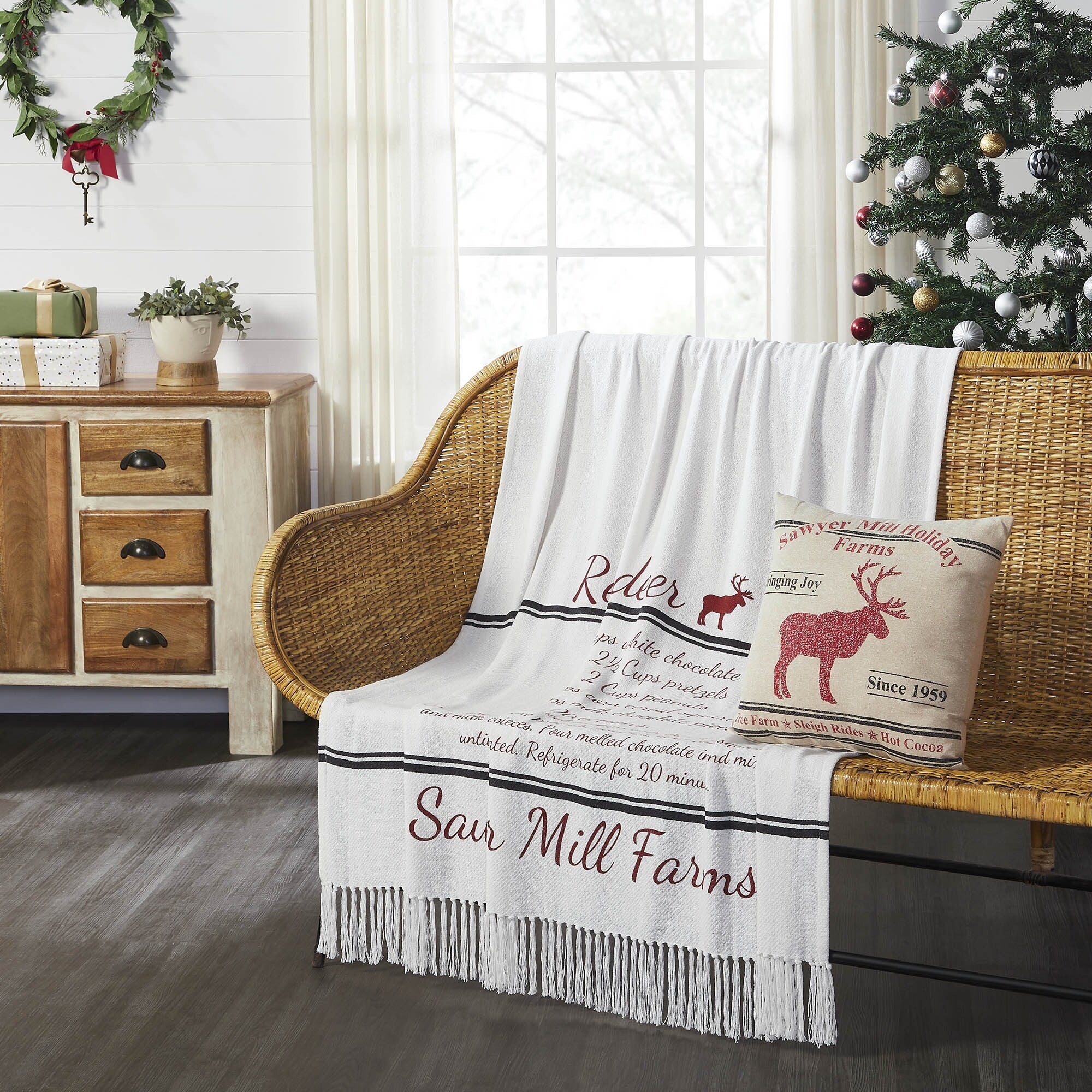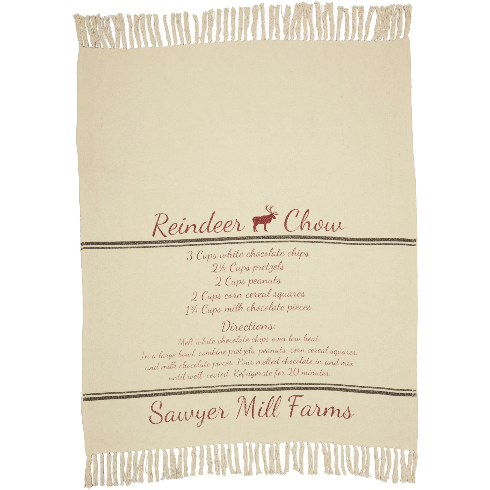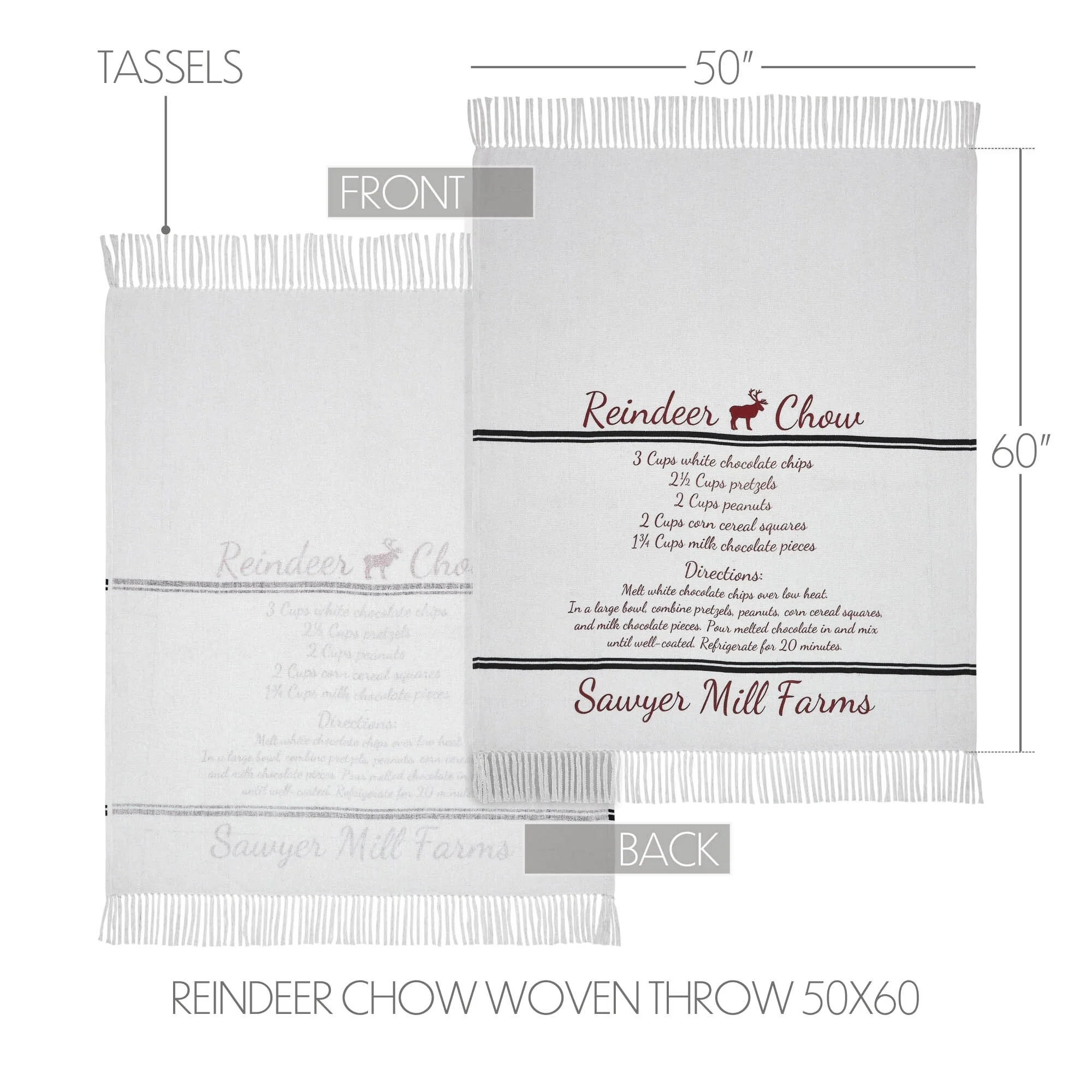 This Christmas be inspired by the Sawyer Mill Reindeer Chow Woven Throw. Enjoy being cozy under our 60x50 white cotton throw blanket with barn red lettering and grey accents. This charming throw has a recipe for Reindeer Chow that adds whimsy to this holiday blanket. Put on a bed, sofa, or couch to bring rustic Christmas style into any room. 100% cotton.