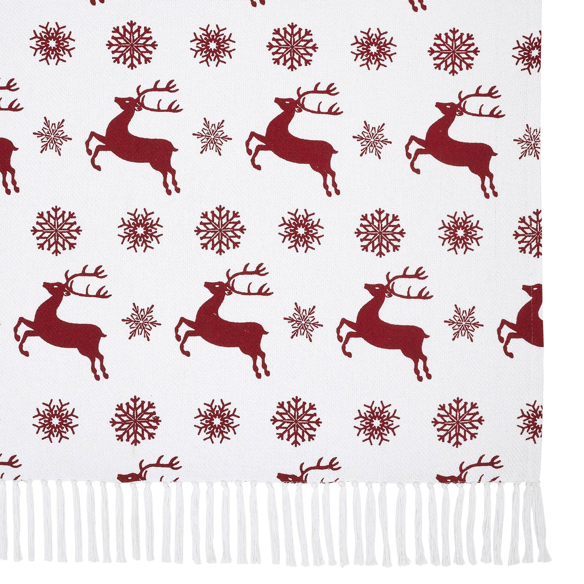 Transform your home into a cozy winter lodge with a fanciful pattern of classic red reindeer and snowflakes on a crisp white background. The Scandia Snowflake Throw measures 50x60 inches. The classic European country throw blanket is carefully crafted with a unique recycled cotton blend yarn. Tasseled edging adds an extra pop of texture. Coordinates with the Scandia Collection by VHC for Nordic Christmas style for your whole home.
