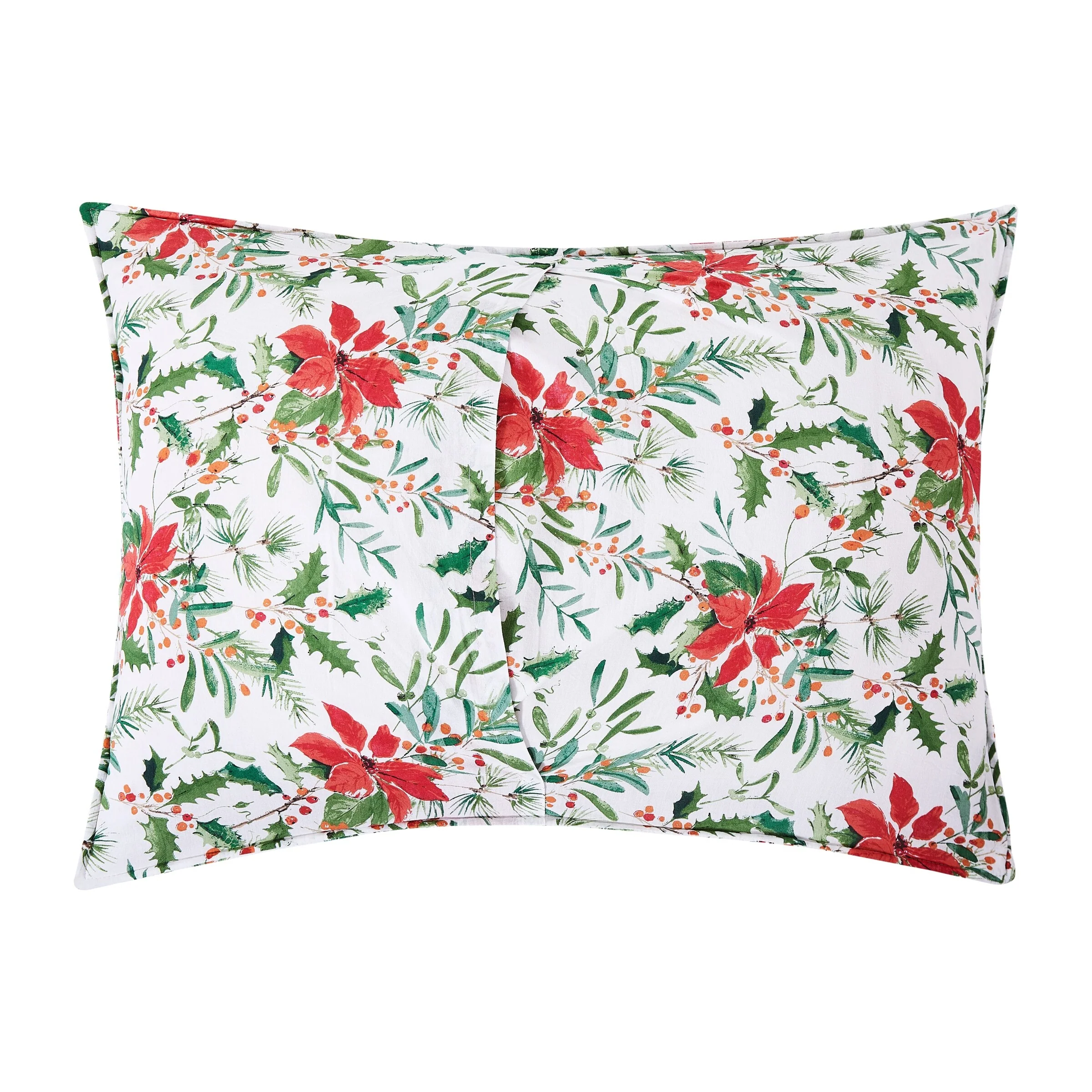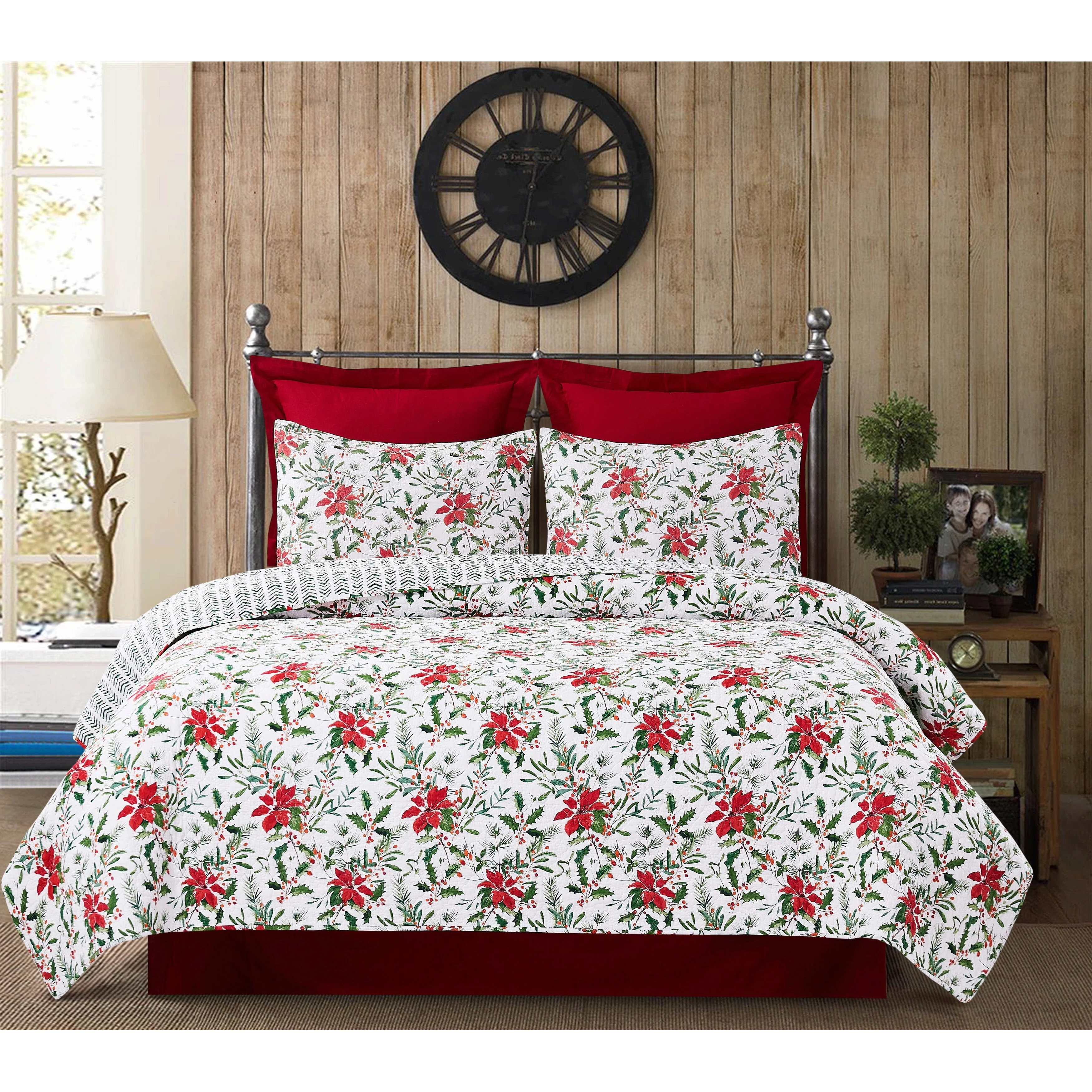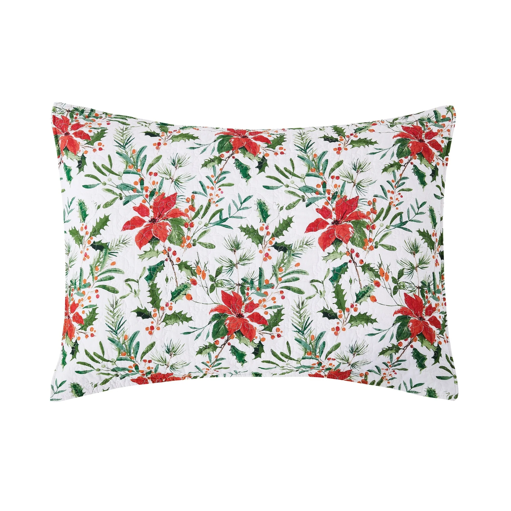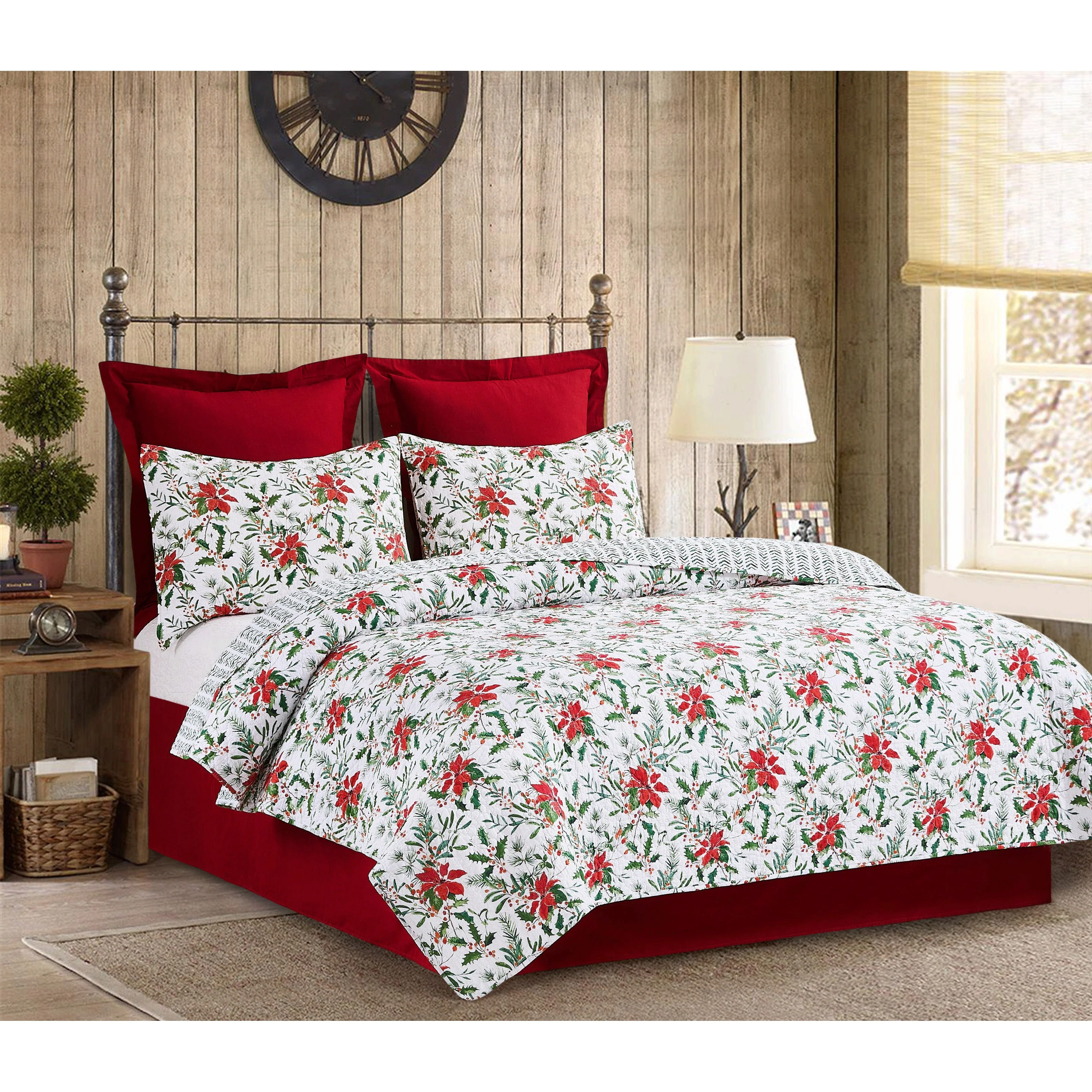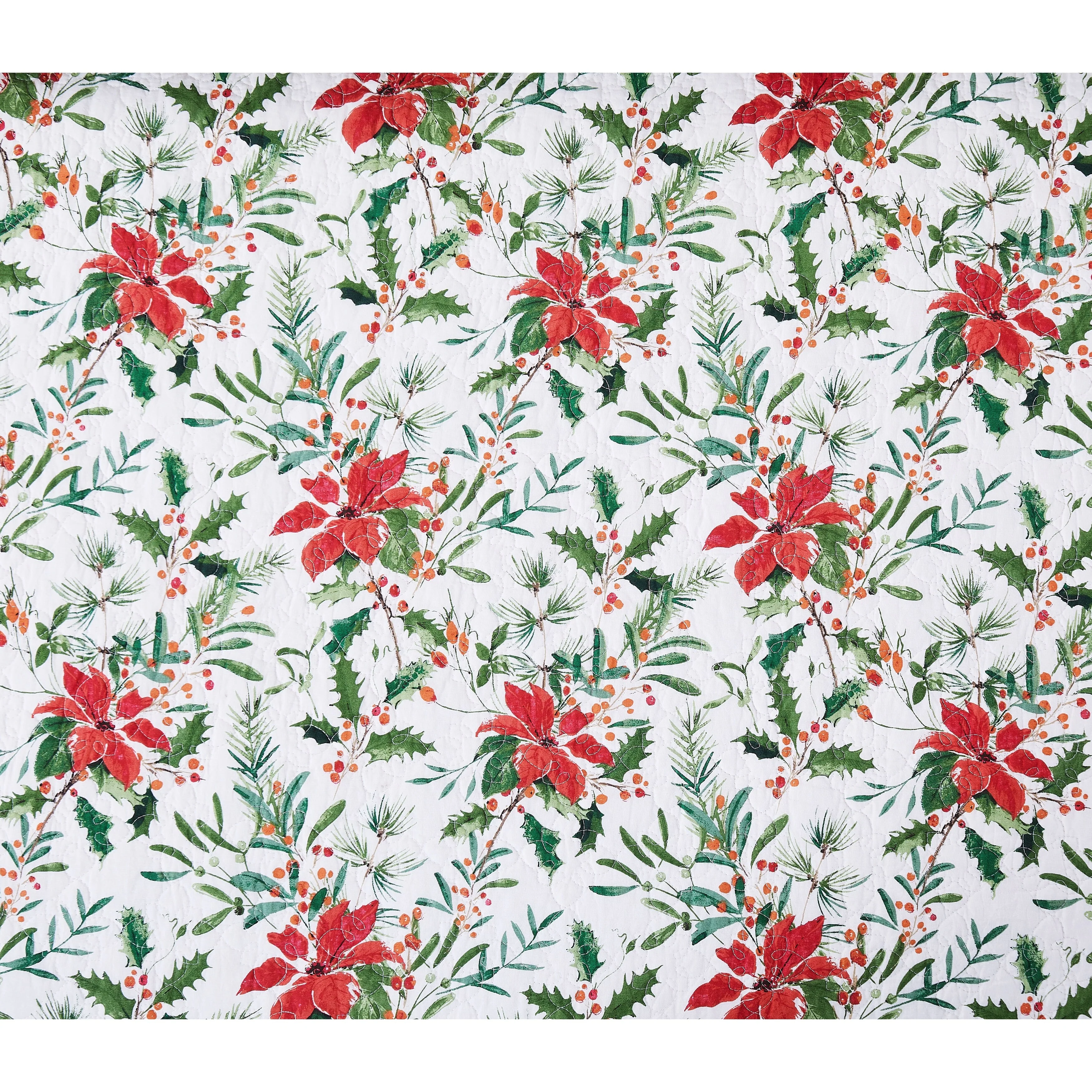 The Silvia Poinsettia quilt set is perfect for the holiday season. Made with a 100% cotton cover and poly-cotton blend filling, the quilt features a classic red poinsettia, Christmas holly, and berries pattern. Reversible to a simple chevron pattern, this oversized quilt is sure to bring a festive touch to any bedroom. Love this pattern? Silvia Poinsettia is also available in a tabletop collection.