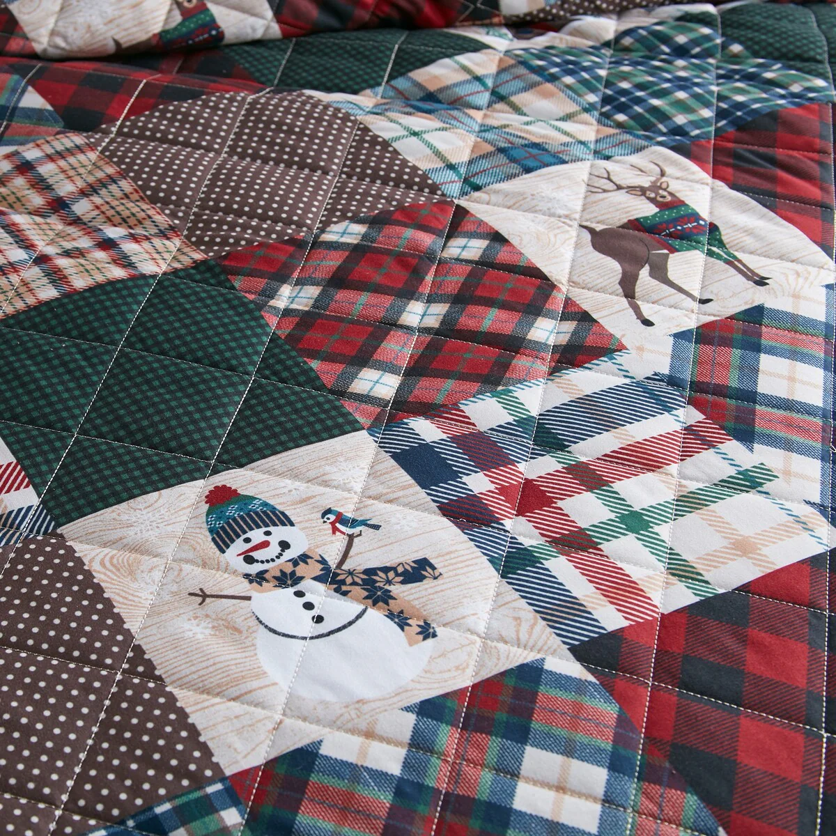 This festive, 3-piece quilted microfiber bedding collection features a patchwork of plaid, winter motifs and wildlife. Colors include gold, pine green, ivory, navy, chestnut brown, dark cherry red and slate blue. Each set comes tucked into a Free matching tote bag!