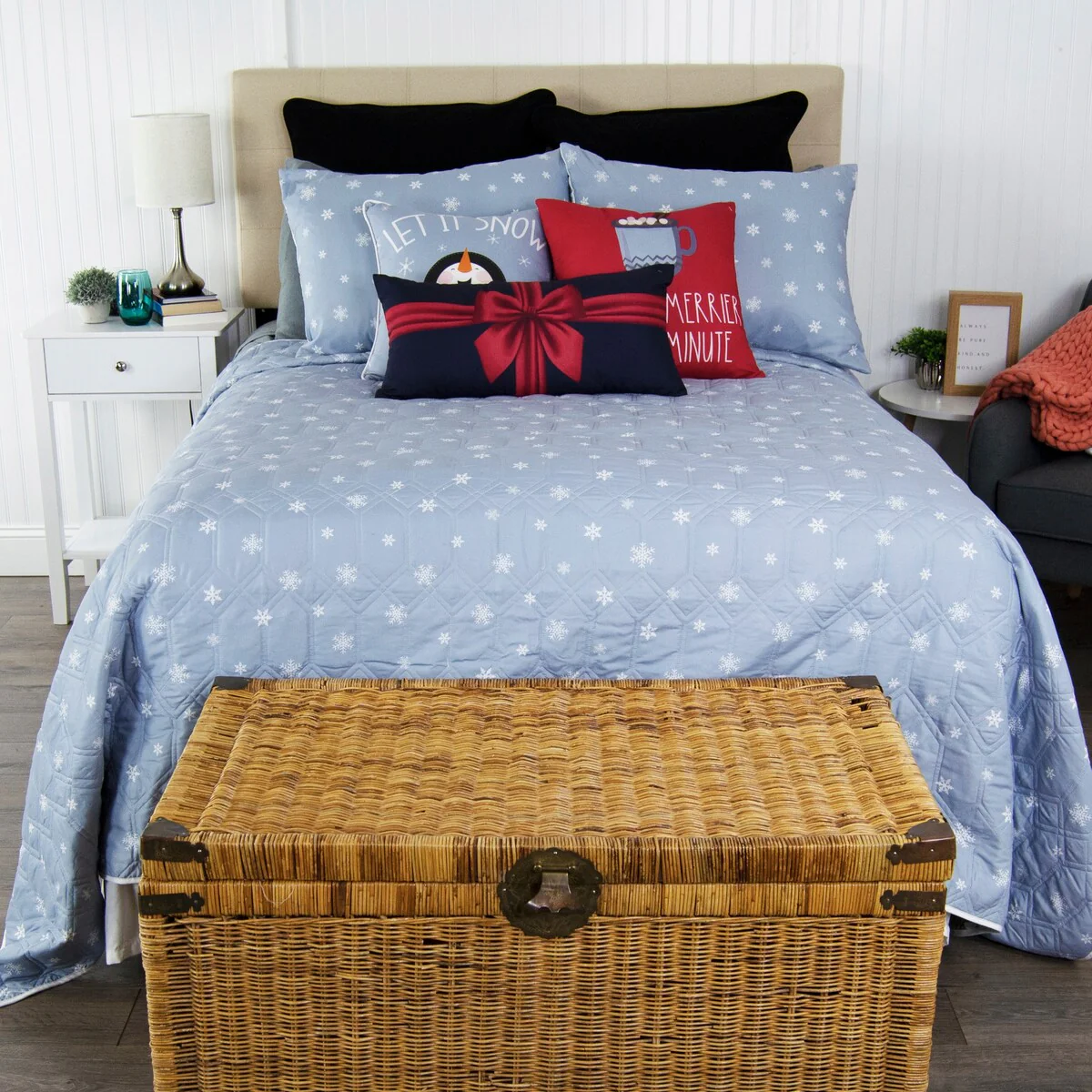 Transform your bedroom into a winter wonderland with the charming polyester bedding ensemble from Your Lifestyle. Featuring a festive village scene with ice skaters and falling snow, this set is available in red, shades of blue/grey, olive green, tan, yellow and white. The reverse side features an all-over snowflake pattern. Stay warm and cozy with the comforter and 2 pillowcases (Twin set has 1 pillowcase) included in the set. Packaged inside a free matching tote bag, this set is perfect for gifting.