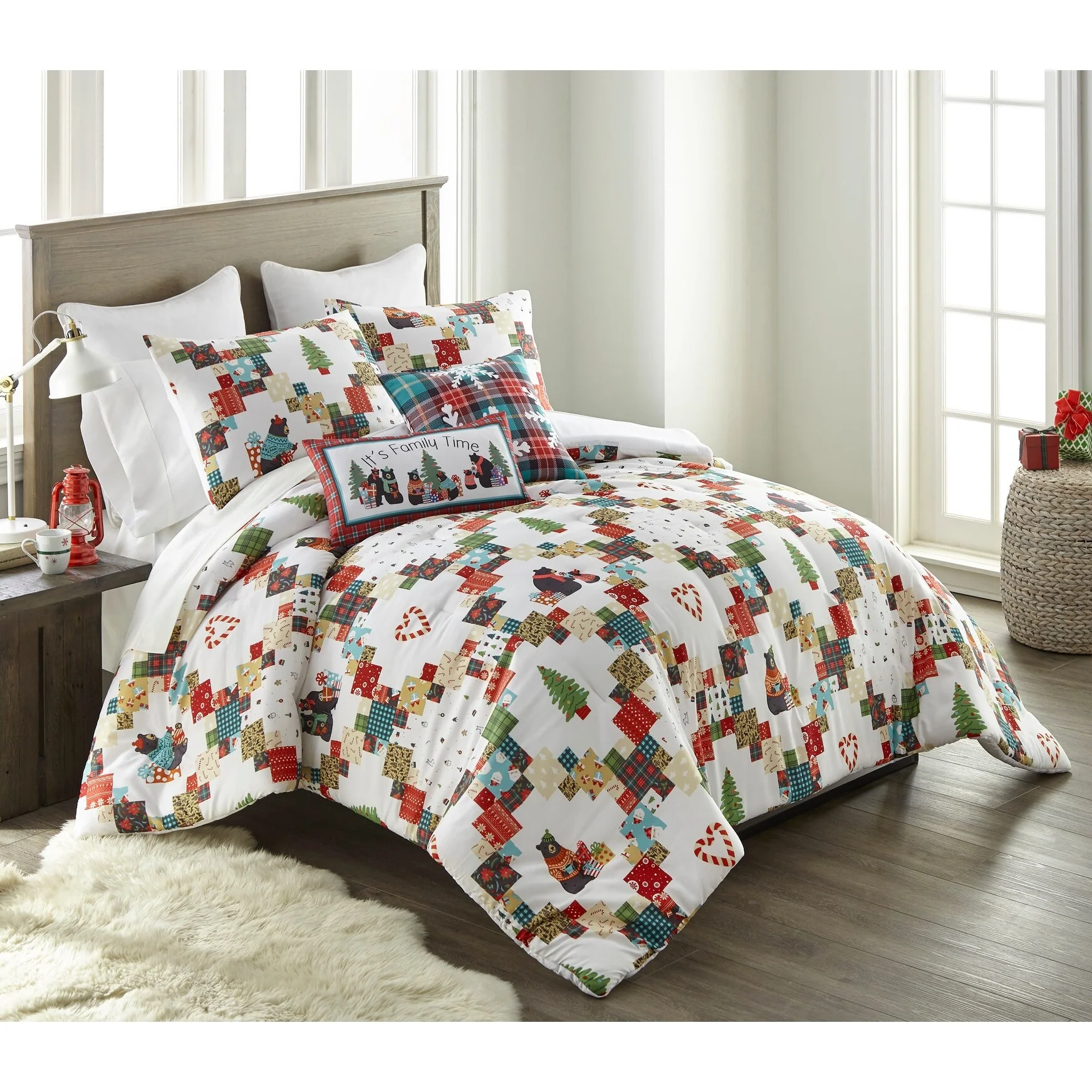 Introducing the "Holiday Love" 3PC Comforter Bedding Set from Your Lifestyle Brand, a celebration of festive elegance and cozy comfort. This enchanting ensemble showcases a printed patchwork design inspired by vintage Irish Chain quilt patterns, adding a timeless charm to your bedroom decor. �Adorned with delightful Christmas trees, playful black bears, and whimsical candy canes, amidst a backdrop of assorted plaids and holiday prints, it captures the joyful spirit of the season. The color palette features shades of rich red, deep charcoal, creamy ivory, soft tan, various greens, classic black, delicate pink, and refreshing aqua, creating a harmonious blend that brightens any room. Machine washable, tumble dry low. Decor pillows and throw sold separately.�