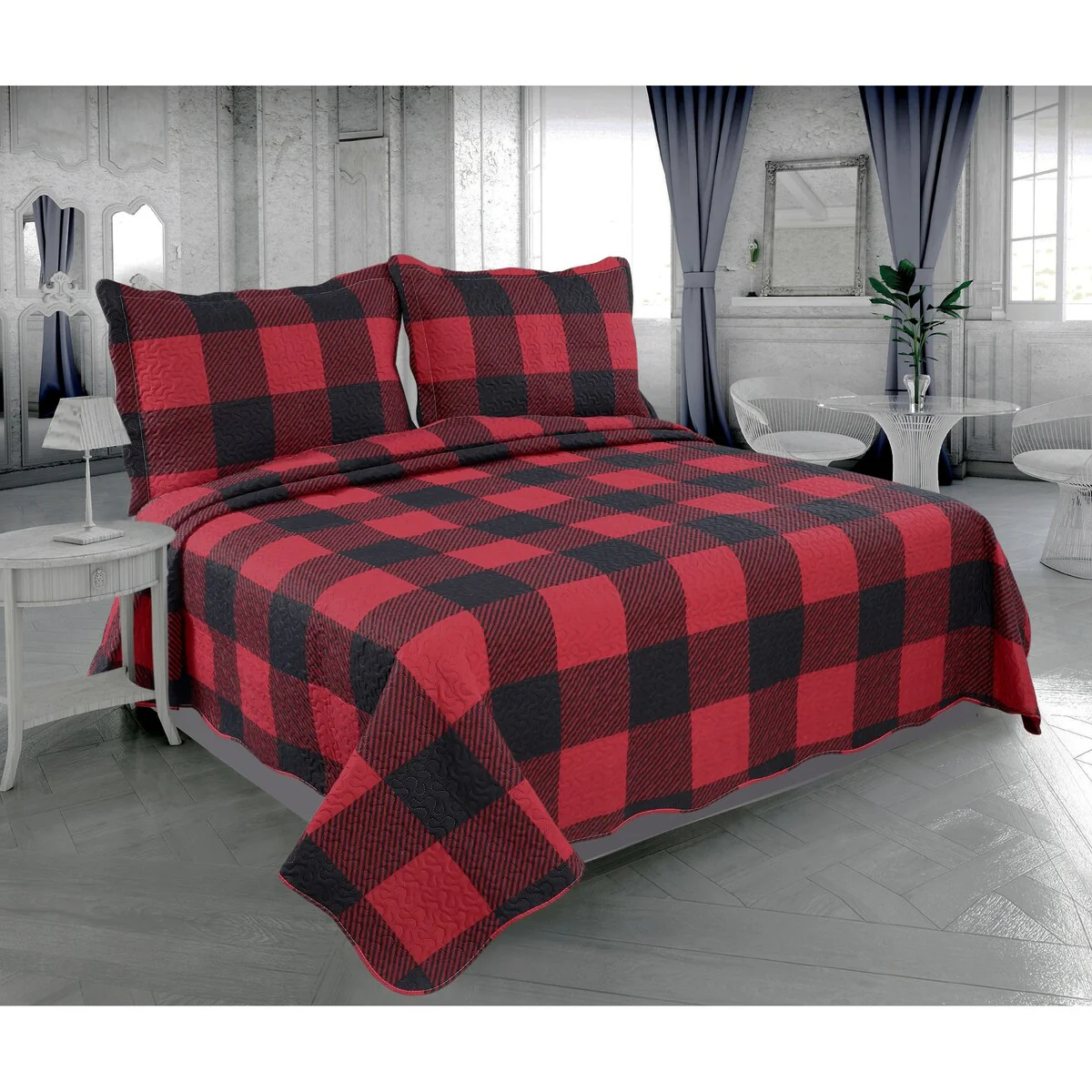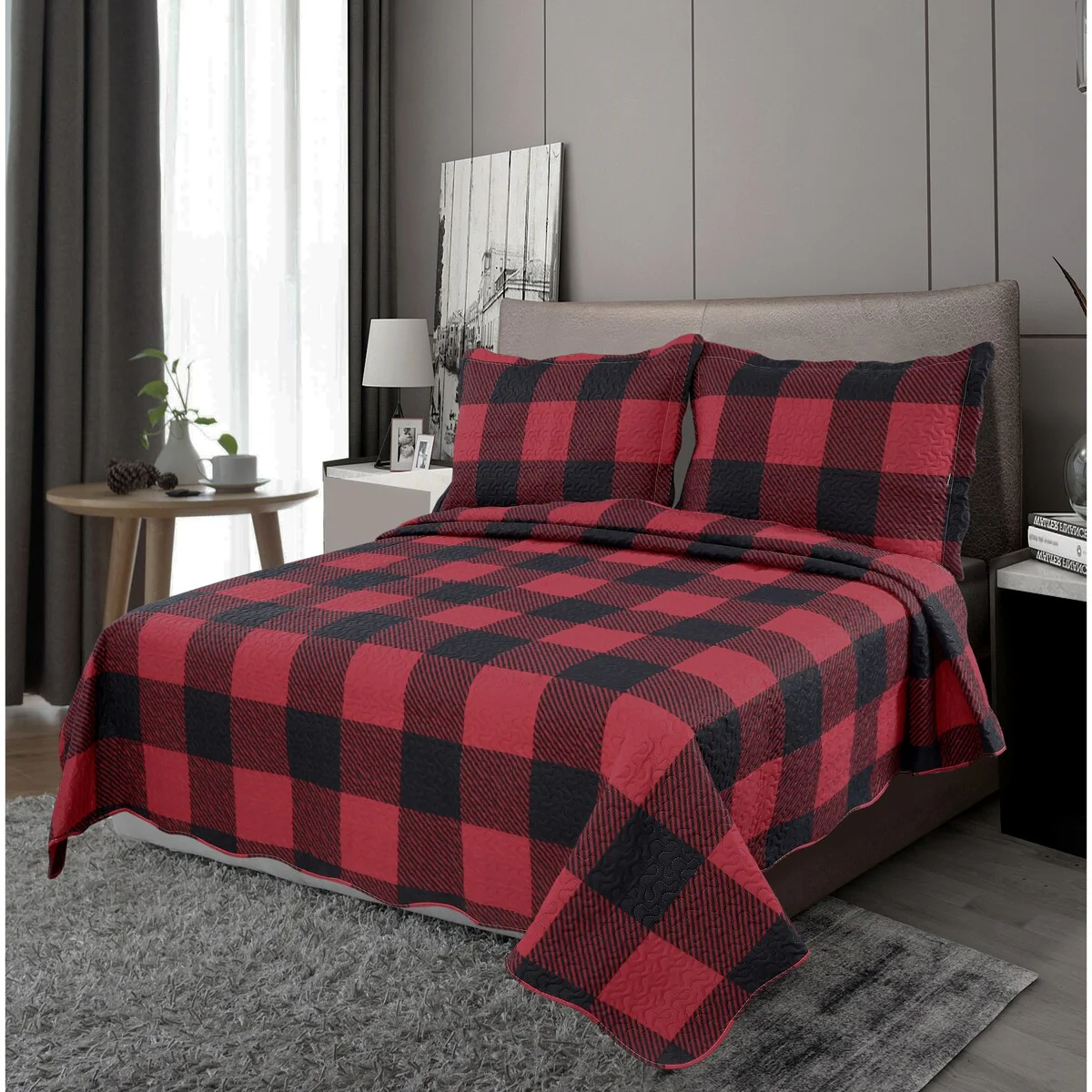 Printed Embossed Pinsonic Coverlet Bedspread Ultra Soft Bedspread Coverlet Christmas Quilt Set, Red Black Plaid