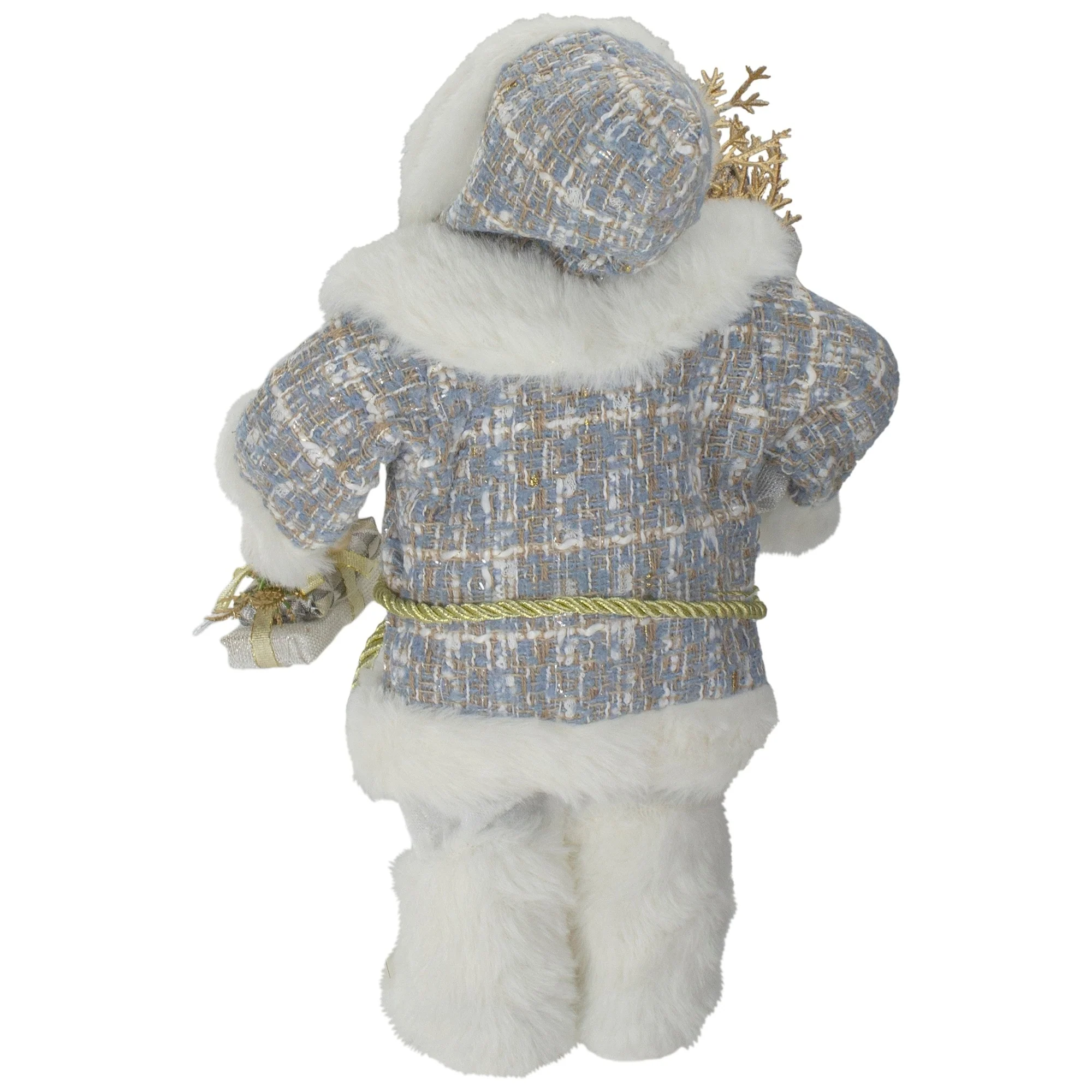 Add a touch of festive charm with this unique Santa Claus figure. Dressed in a striking blue and white coat with matching hat and a jingle bell, he stands out with his faux fur trim and gold rope accents. His white faux fur pants and boots complement the look, while he carries an overstuffed sack in one hand and a collection of wrapped presents in the other. This Santa brings a fresh twist to holiday decor, blending traditional cheer with a vibrant, new style.