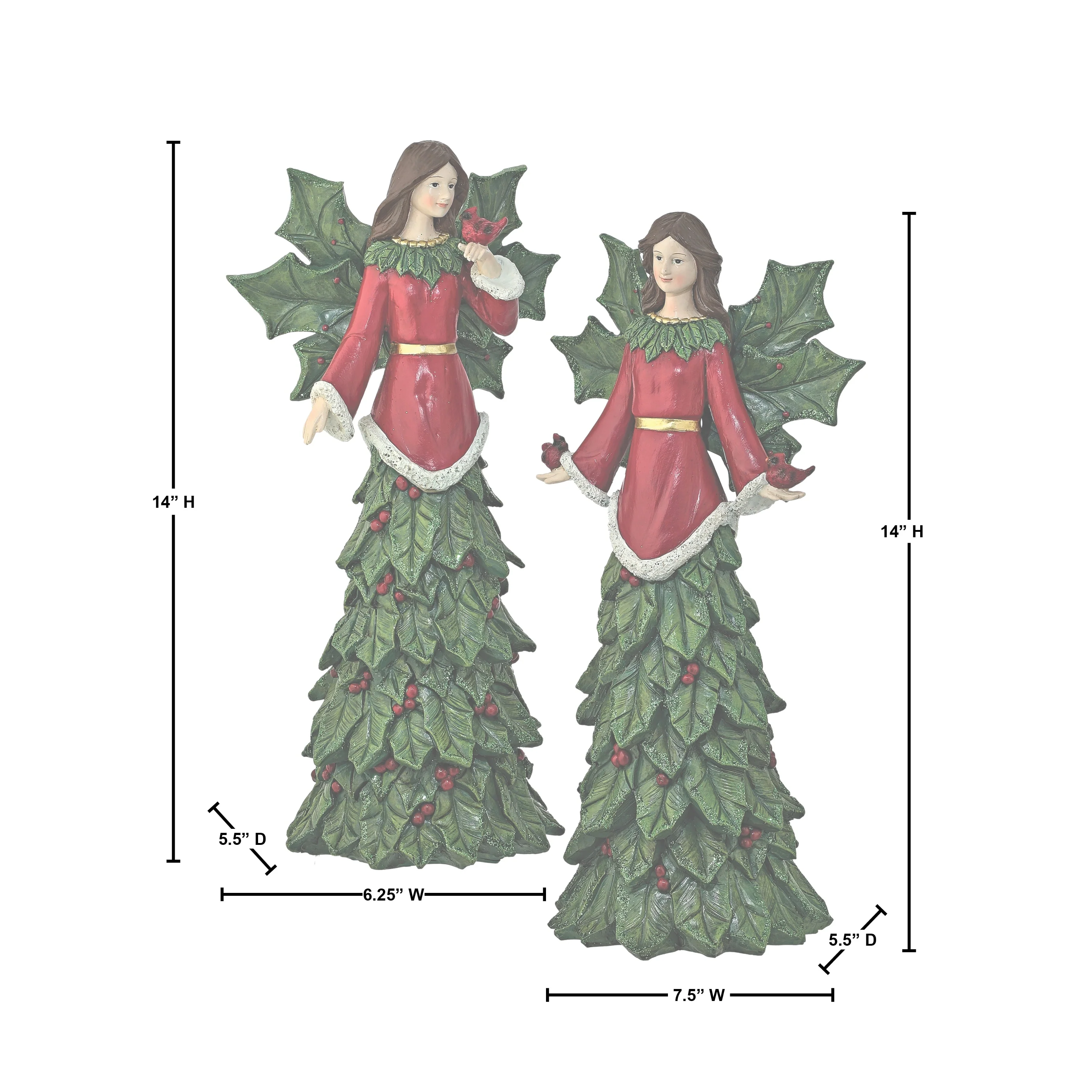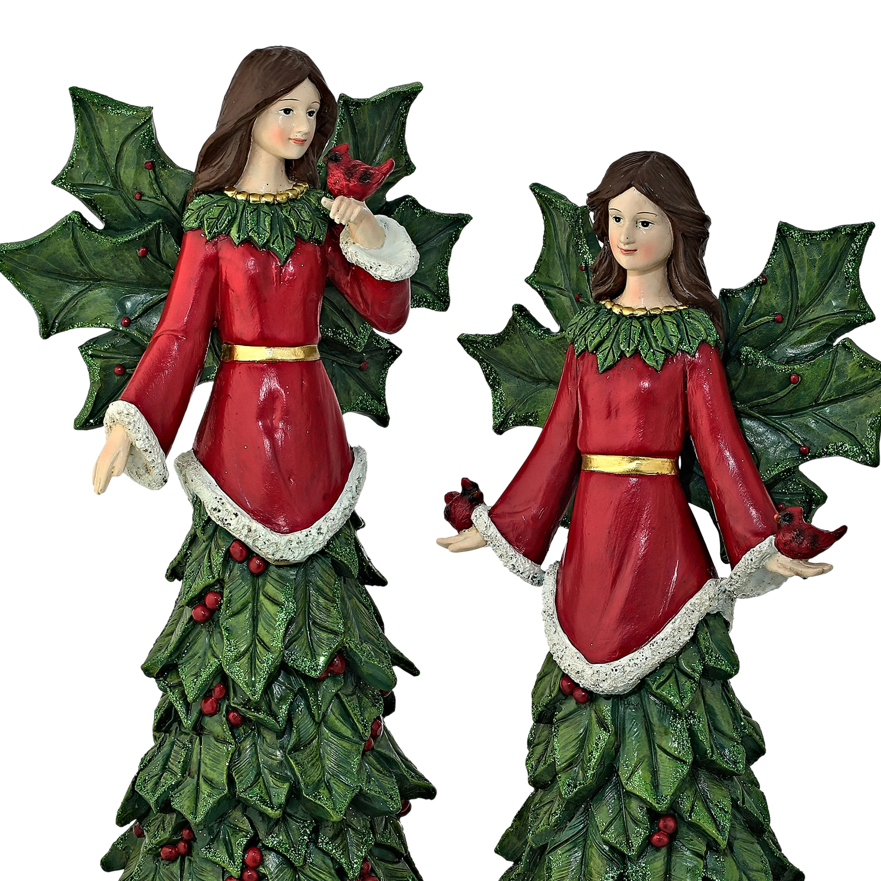 Add a touch of heavenly charm to your home with our enchanting 14" Resin Holly Angel Set of 2. These exquisite figurines are each holding little cardinals, embodying the spirit of the season with their serene expressions and elegant design, making them a stunning addition to your holiday display. Crafted from high-quality resin, featuring an intricately detailed holly leaf skirt adorned with red berries, holly wings, painted faces, and vibrant colors that capture the beauty of the holiday season. Each leaf is lined with green glitter adding a touch of sparkle. Intended for decorative use. Celebrate the spirit of joy and reverence!