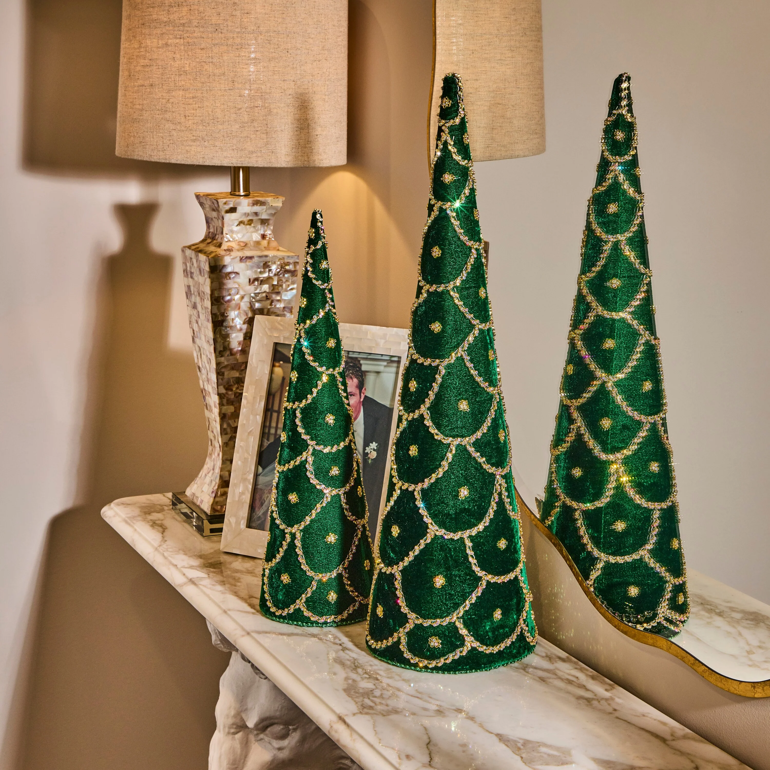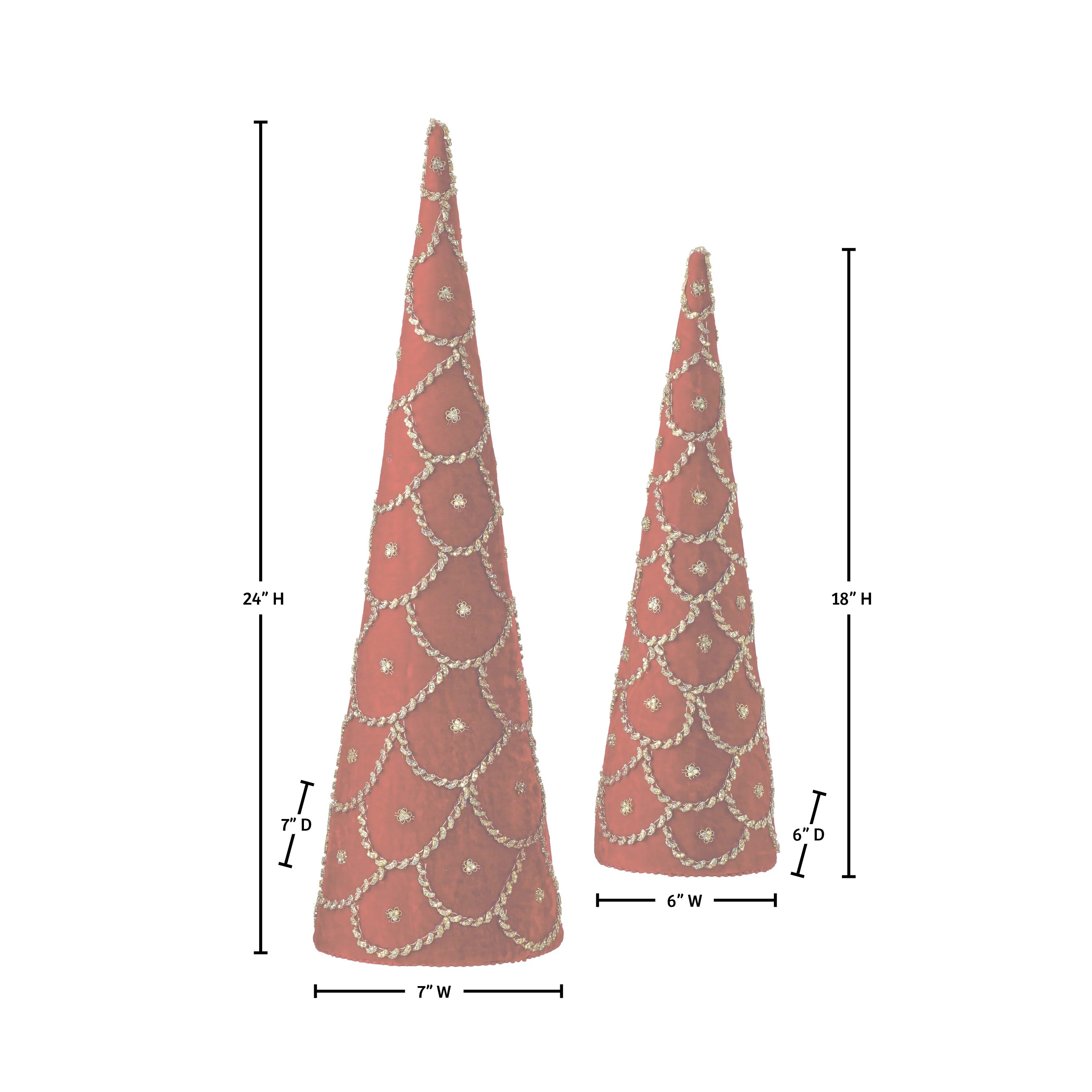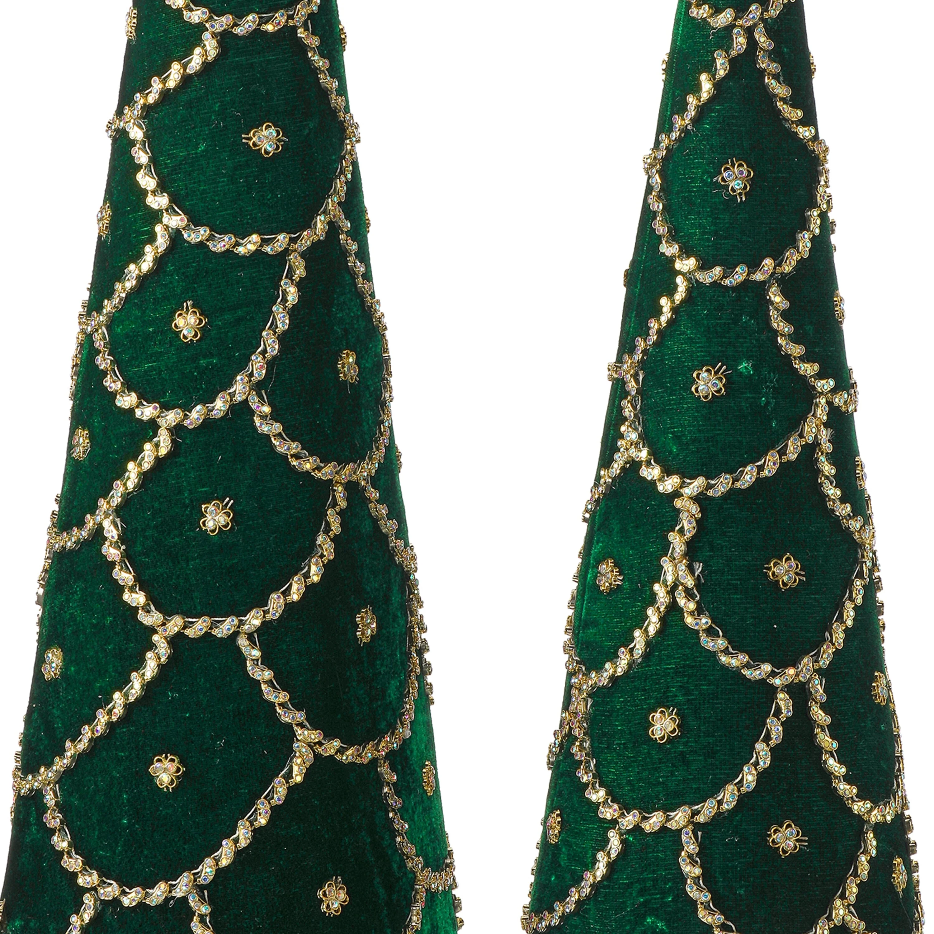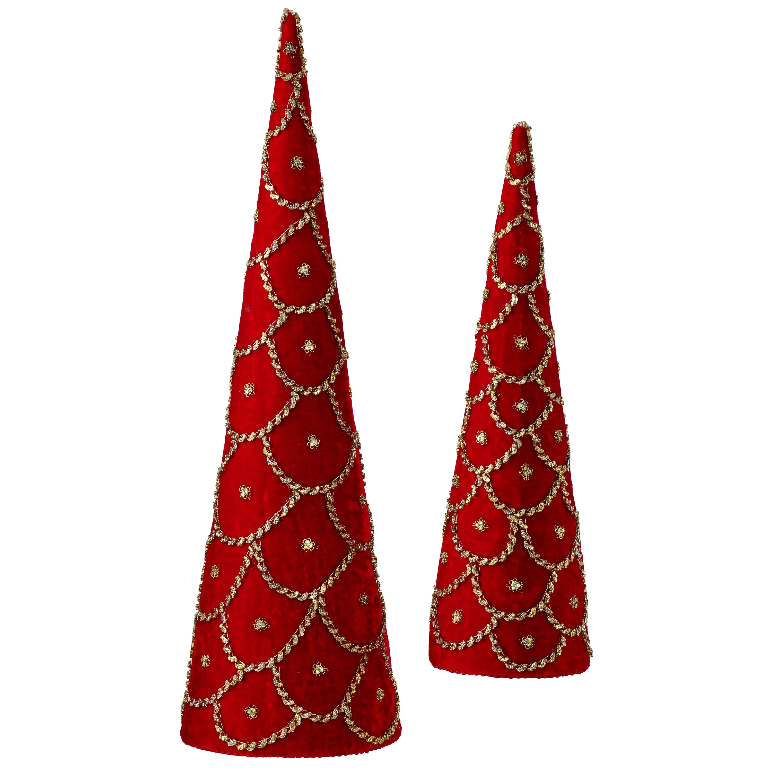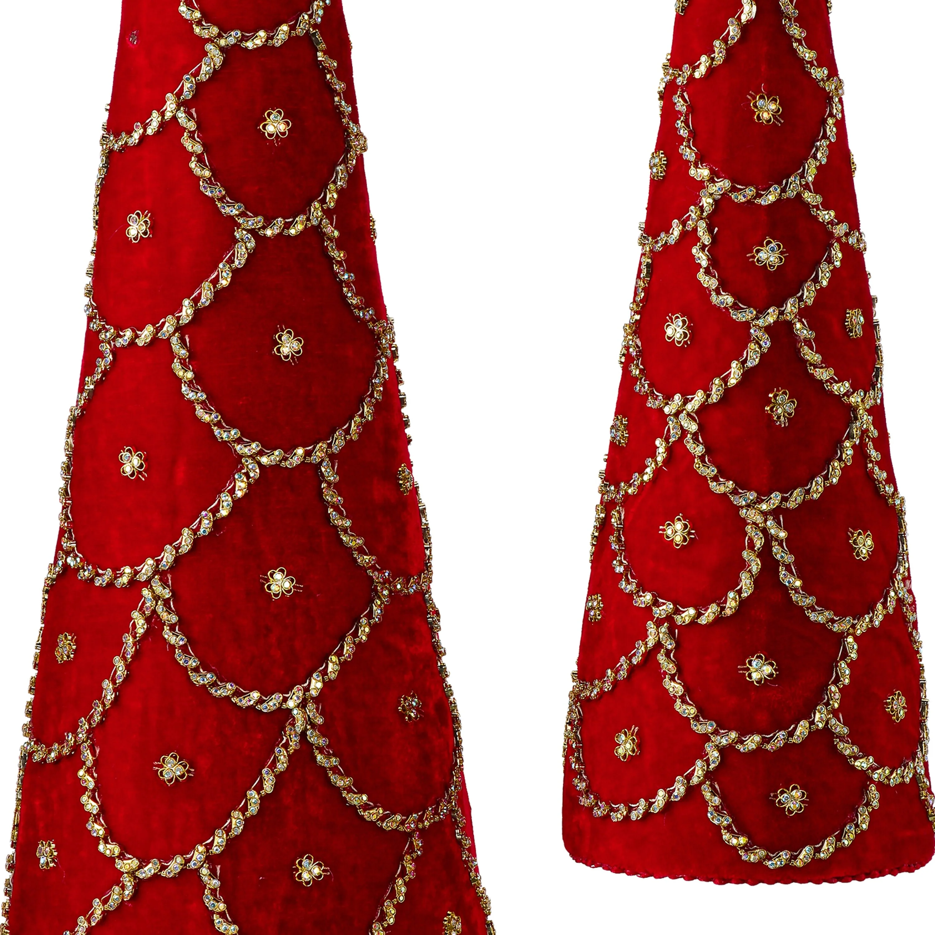 Elevate your holiday décor with this stunning 18-24" Jeweled Scalloped Velvet Cone Tree. Designed with luxurious velvet fabric and adorned with intricate jeweled accents, this cone tree exudes elegance and sophistication. The scalloped design gives it a unique, textured look, while the sparkling jewels add a touch of glamour to any space. Perfect for holiday tablescapes, mantle displays, or as a standalone accent, this tree is sure to bring a festive and refined charm to your home. Add a touch of opulence to your seasonal décor with this exquisite velvet cone tree, available in two sizes to suit any setting. Intended for decorative use. Made in India, globally known for their quality products.