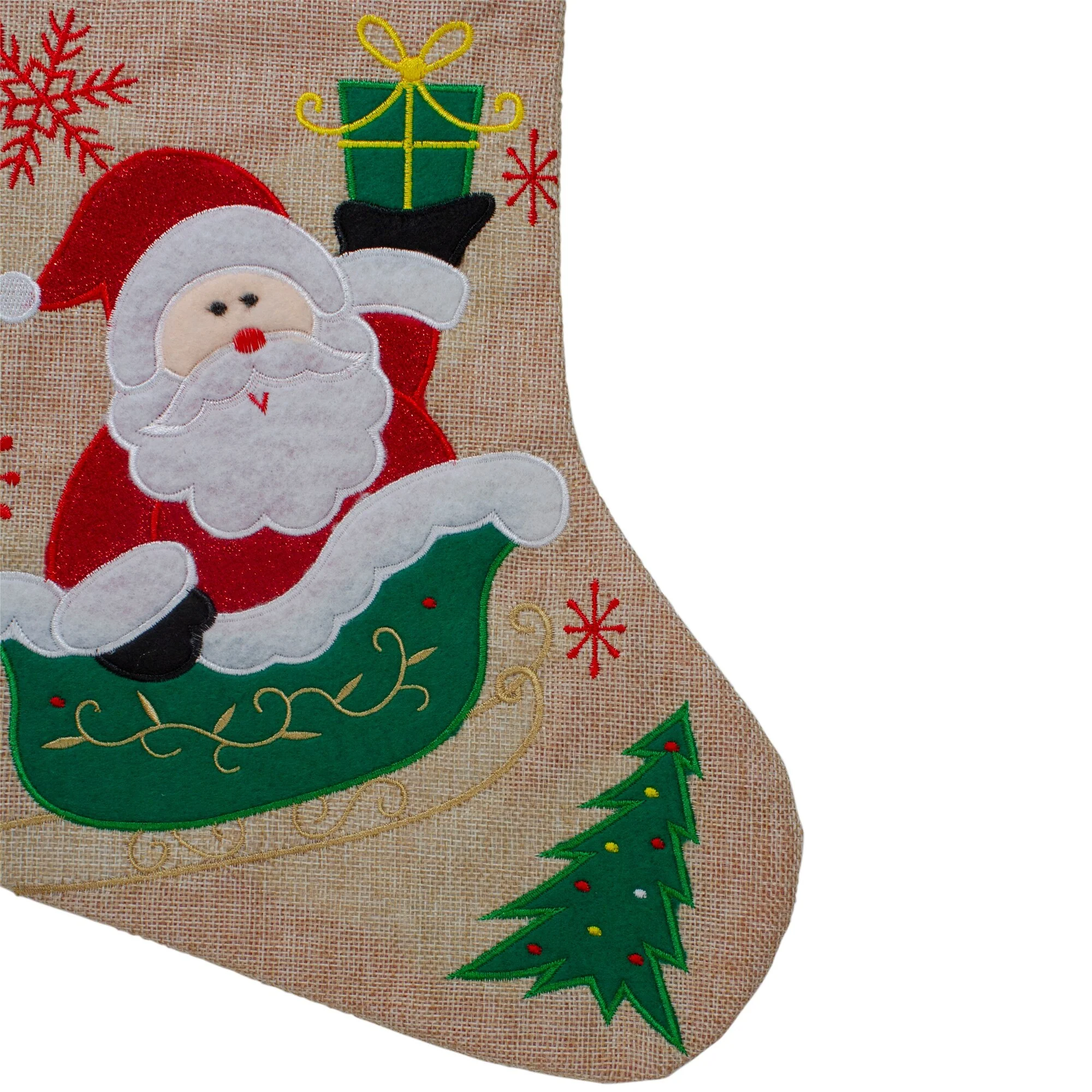 Kick start your festive season with this beautiful Christmas stocking! The stocking is burlap with an embroidered design of Santa on the sleigh. You hang it to your trees, stairways, or pathways; it enhances the beauty of the decor. Fill it with goodies and candies and gift a smile to your loved ones.