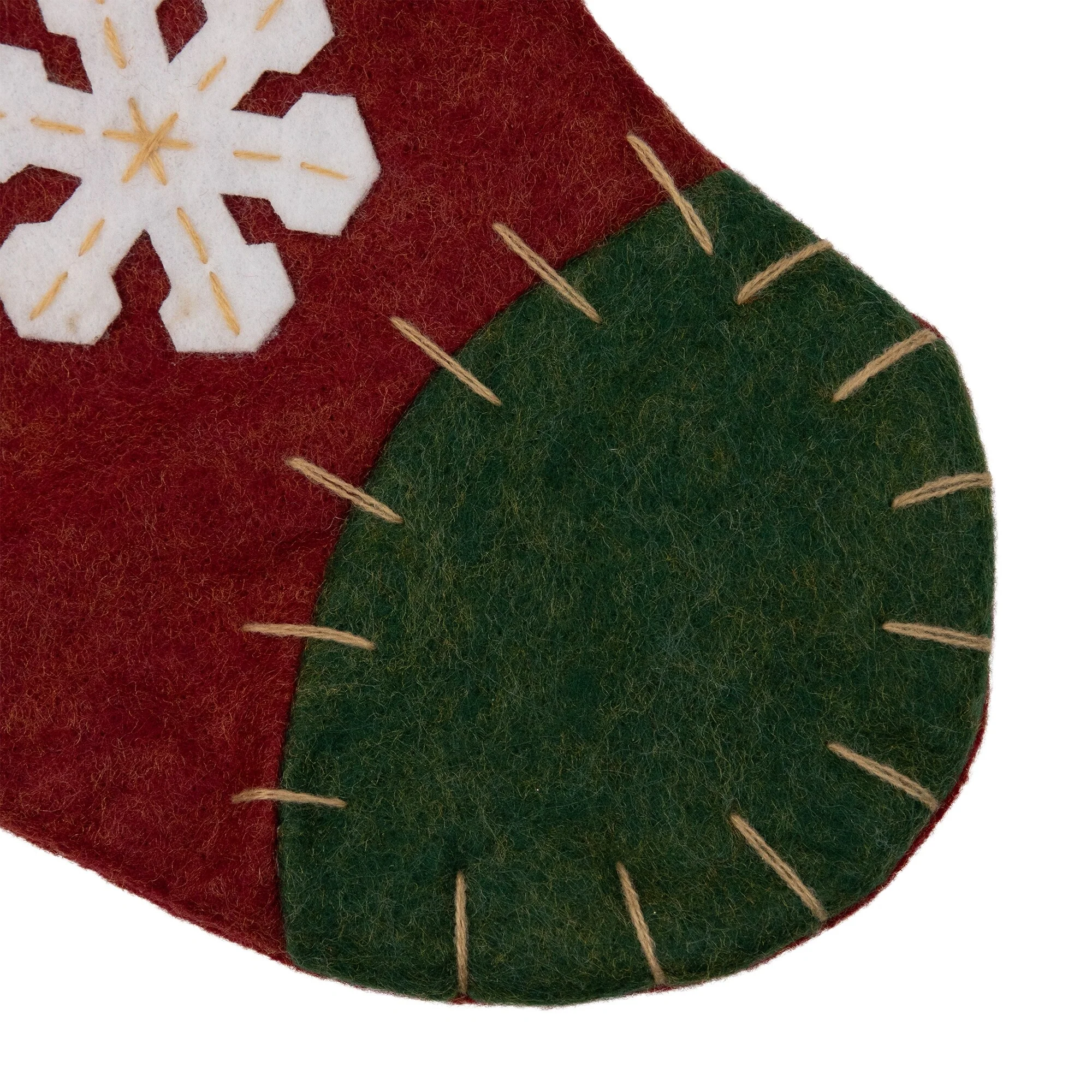 Stocking features a green and red body with snowflake decorations and blanket stitches for a homemade look. This classic traditional stocking can be used to fill with goodies to be discovered on Christmas morning for years to come!