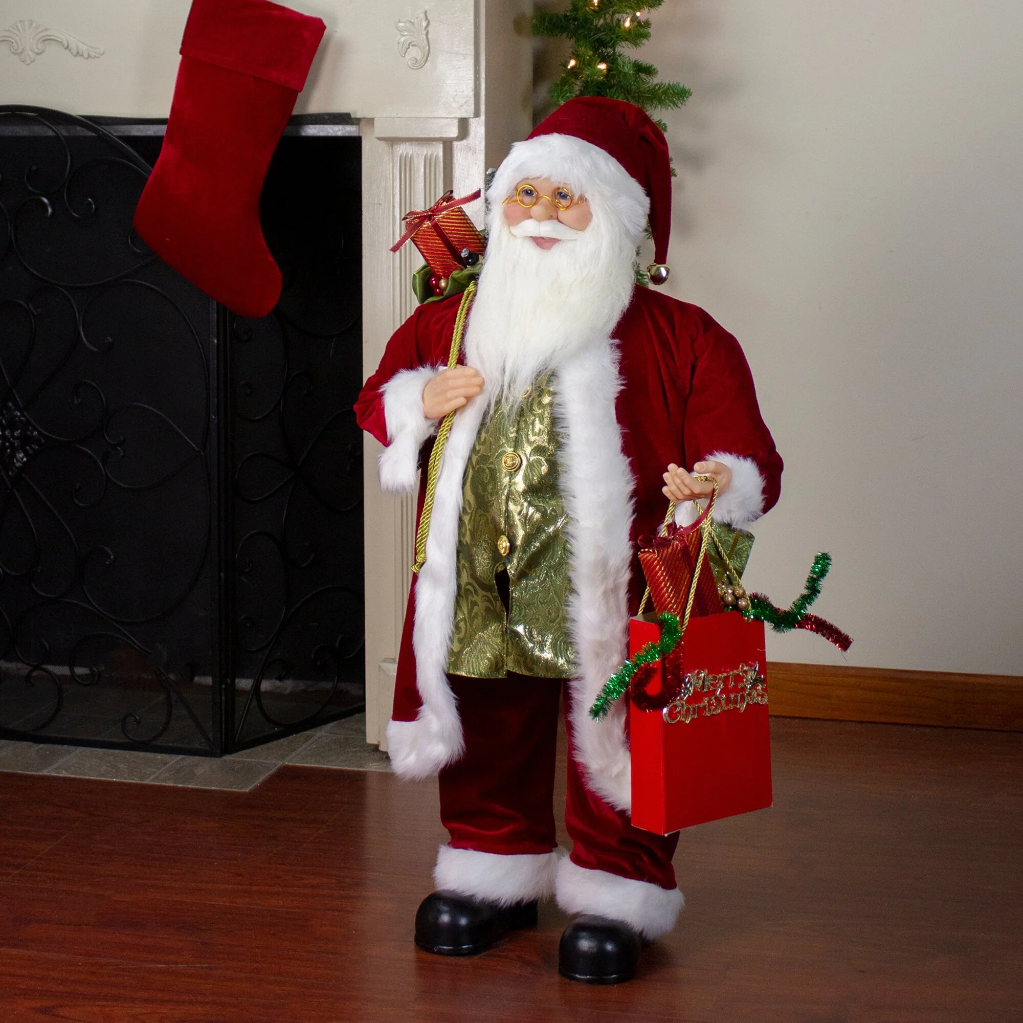 This classic, present bearing, Santa is donning his traditional red and white coat with a beautiful green vest. His present bag full of gifts lays over his shoulder as holds onto presents in the opposite hand. You can add some holiday cheer by adding this Santa to any room in your home.