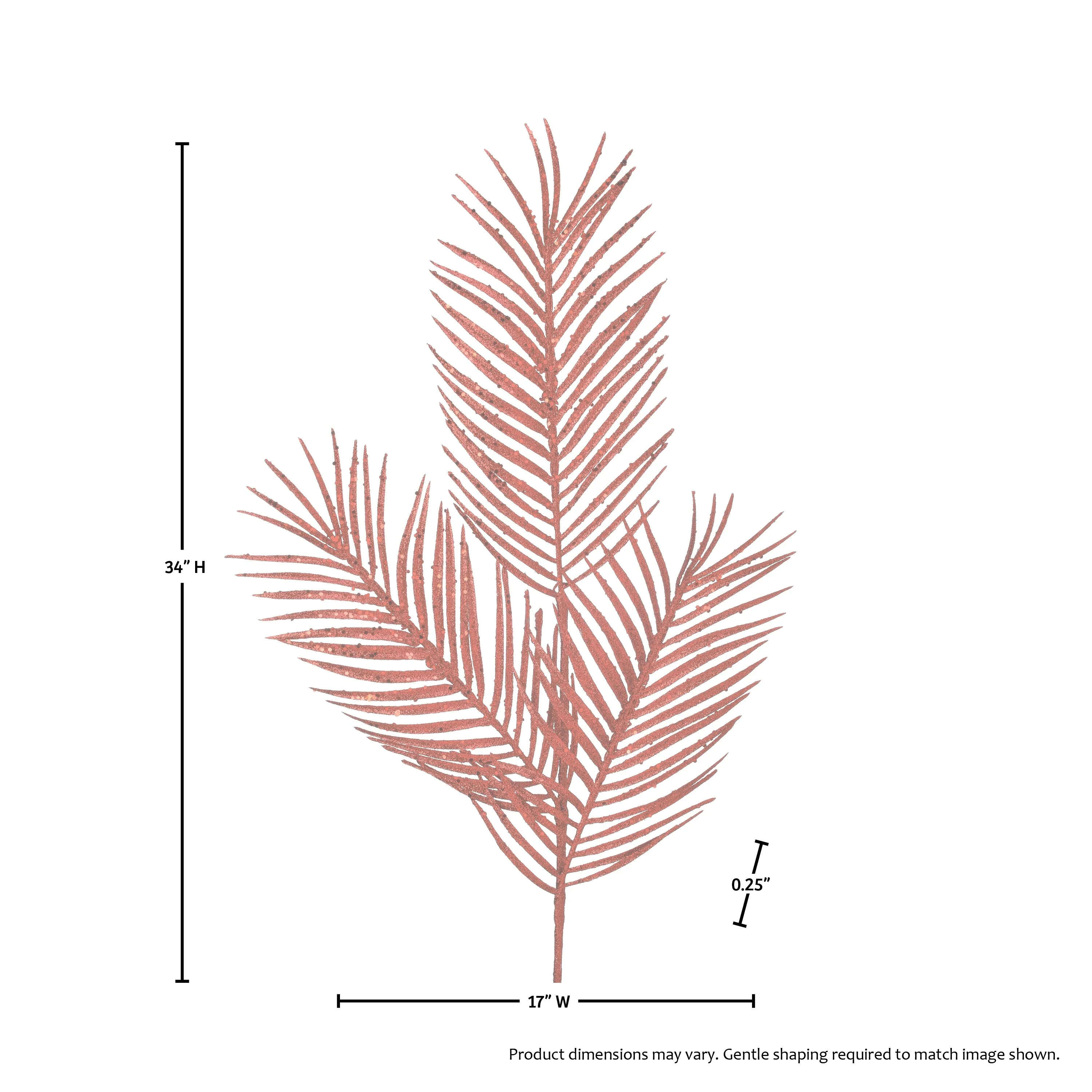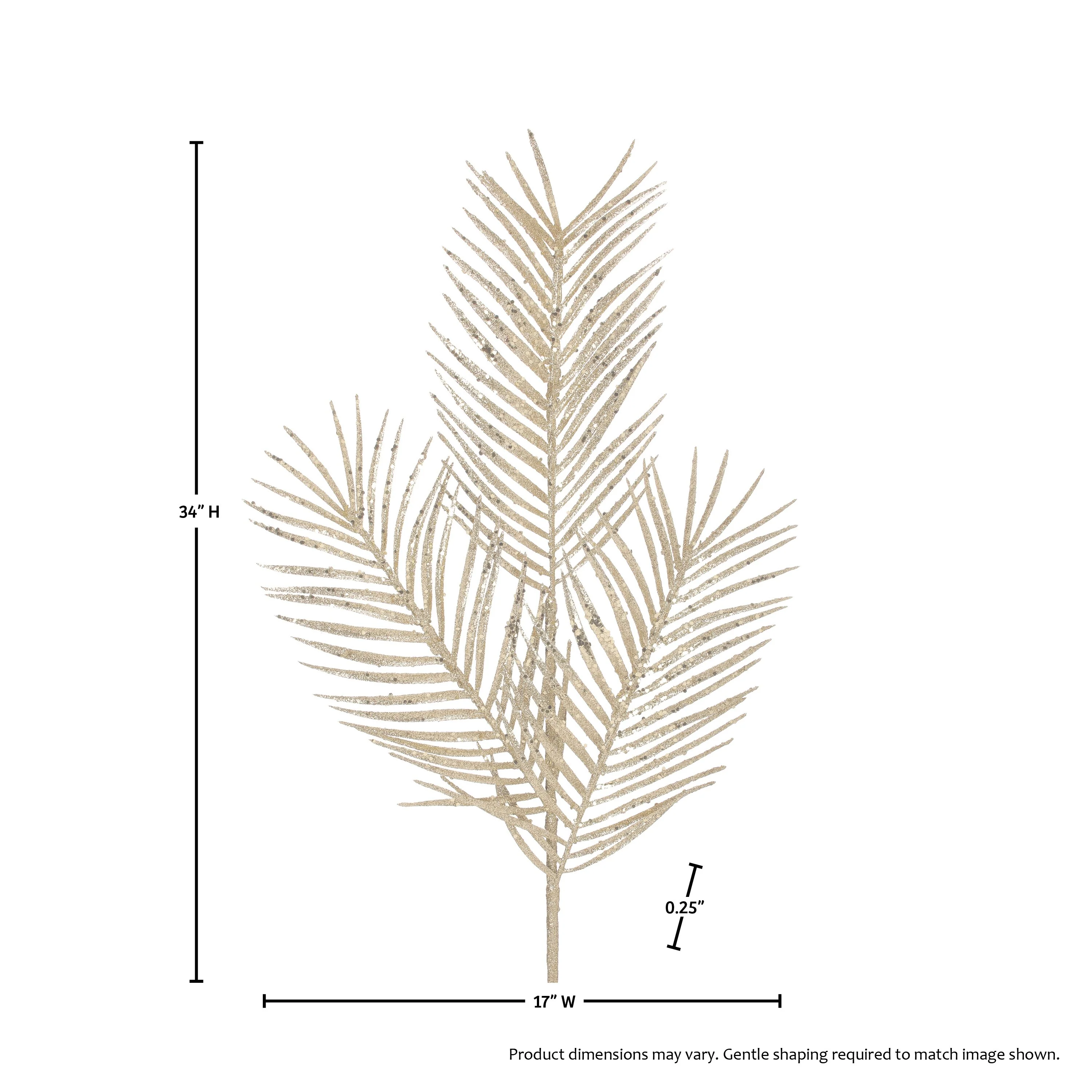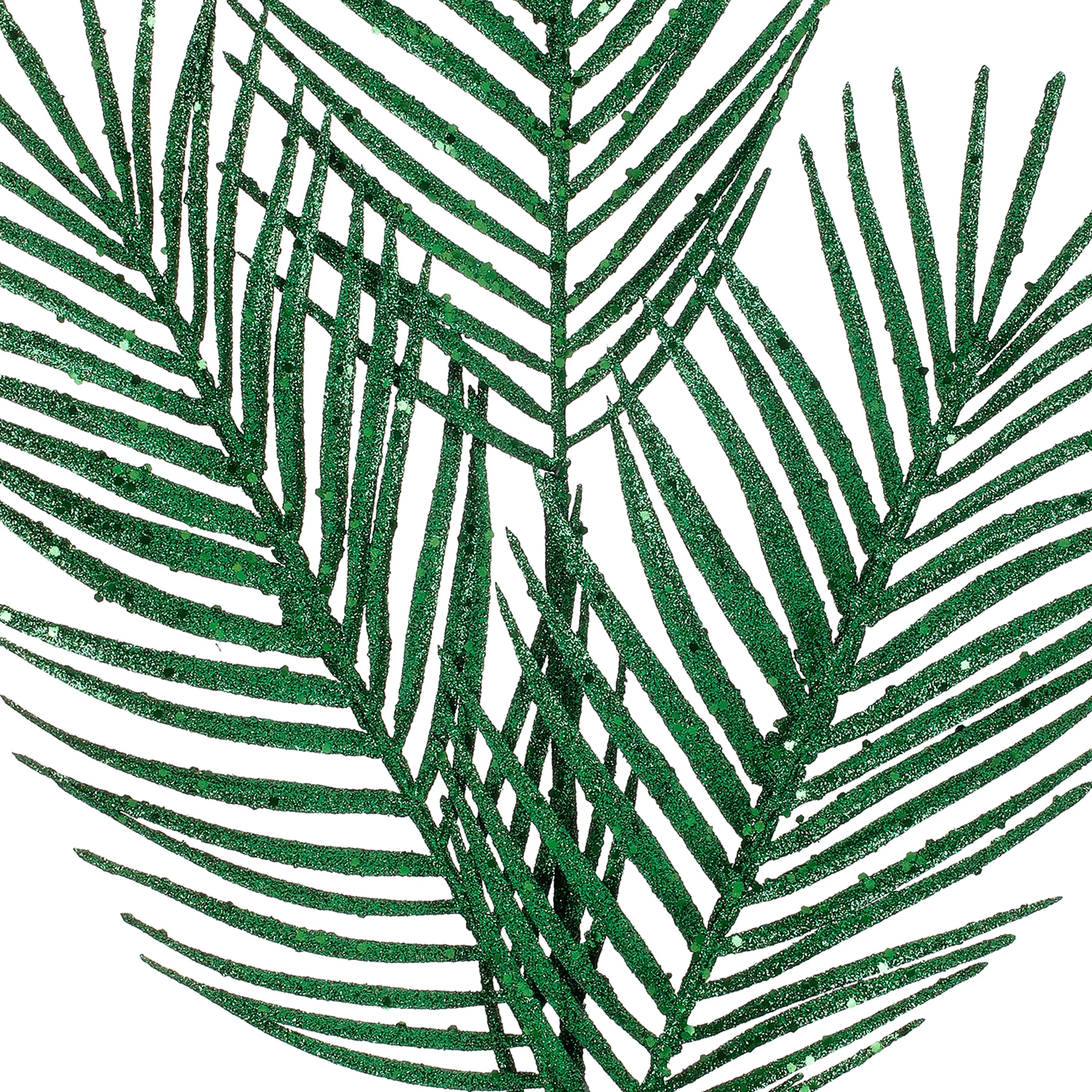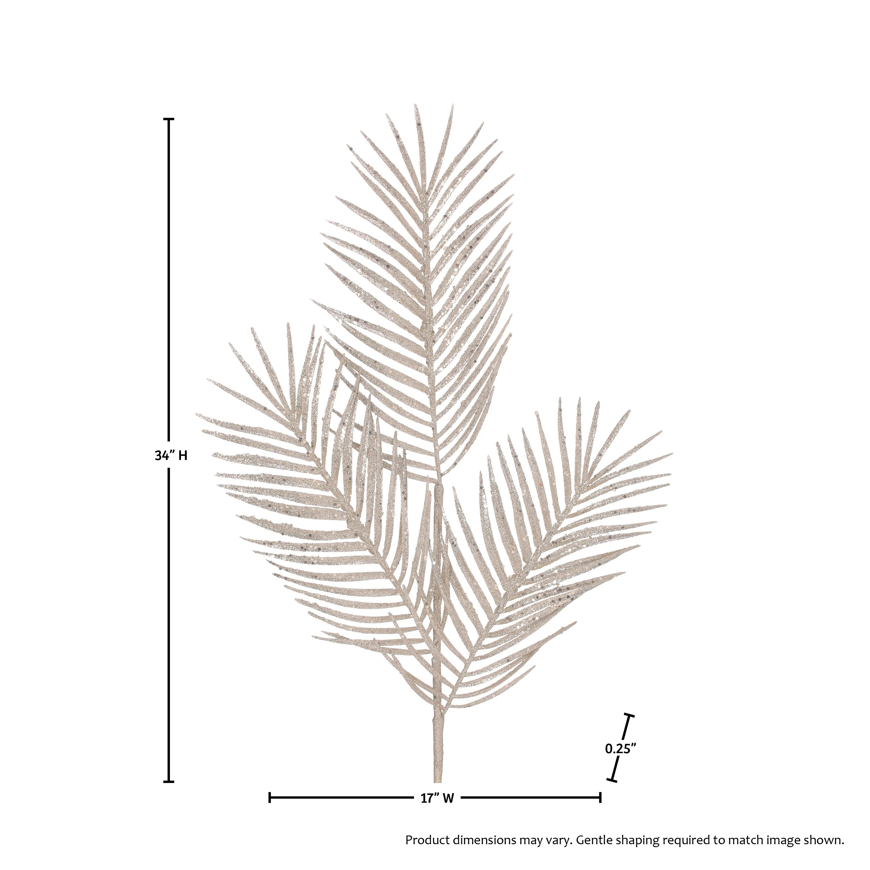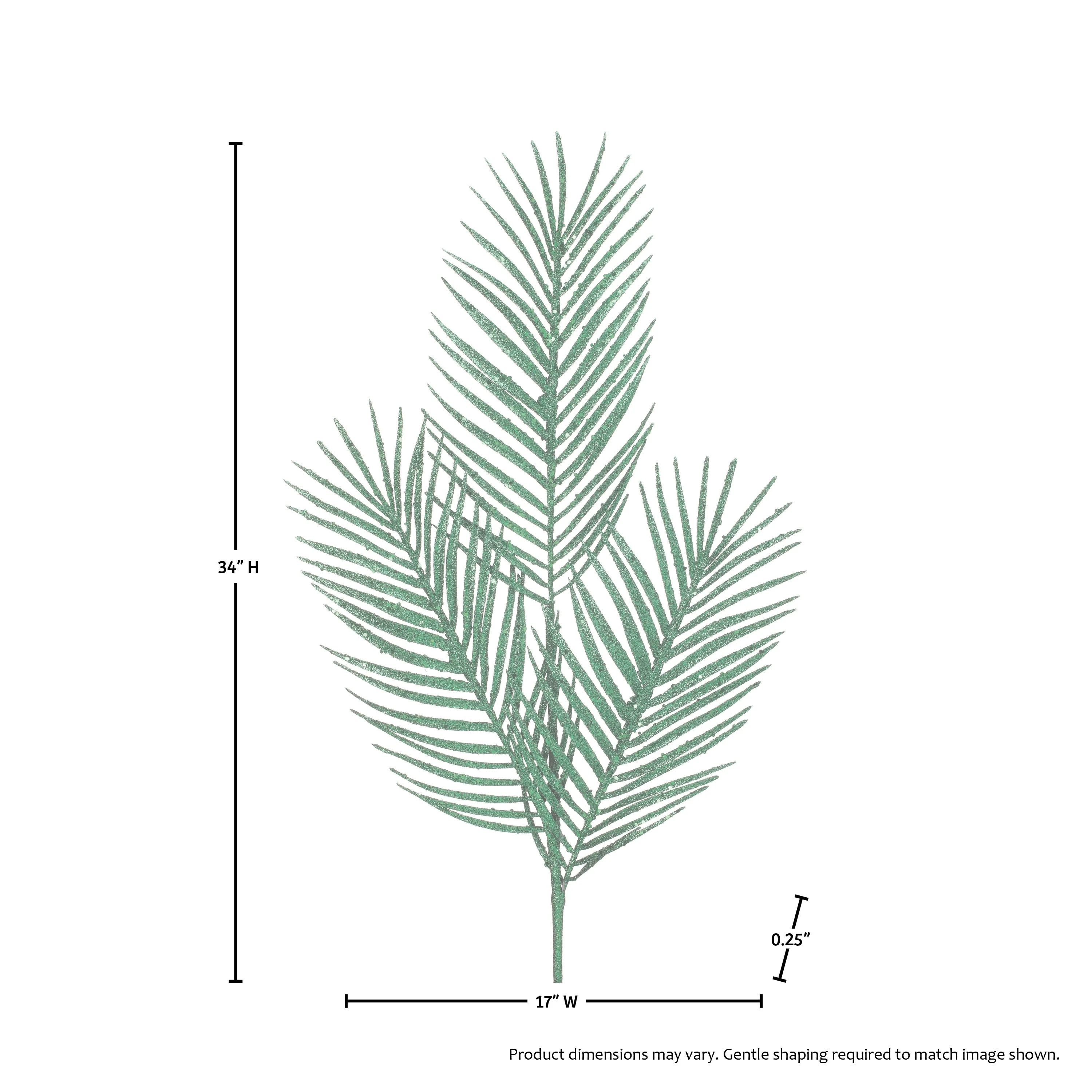 Add a touch of tropical elegance to your décor with this stunning 34" Glitter Mica Triple Palm Leaf Spray. Crafted with intricate detail, each leaf features a shimmering glitter finish, creating a luxurious sparkle that catches the light. Perfect for Christmas trees, wreaths, centerpiece designs, or as a standalone accent, this spray brings a vibrant, yet refined aesthetic to any space. Whether you're decorating for the holidays, special events, or simply enhancing your home décor, this eye-catching piece is sure to impress. Bring the beauty of the tropics into your home with this exquisite palm leaf spray!