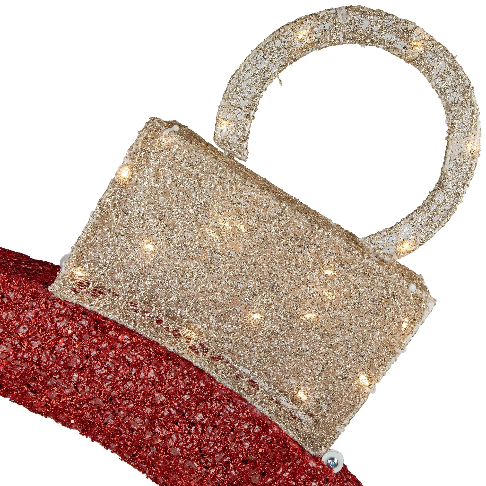 This unique ornament arch is a stunning and festive addition to any outdoor holiday display. Glitter, red threads take the shape of a ball ornament, complete with a gold ornament cap. The lights cast a warm and inviting glow. It's easy to assemble and comes with everything you need for quick installation.