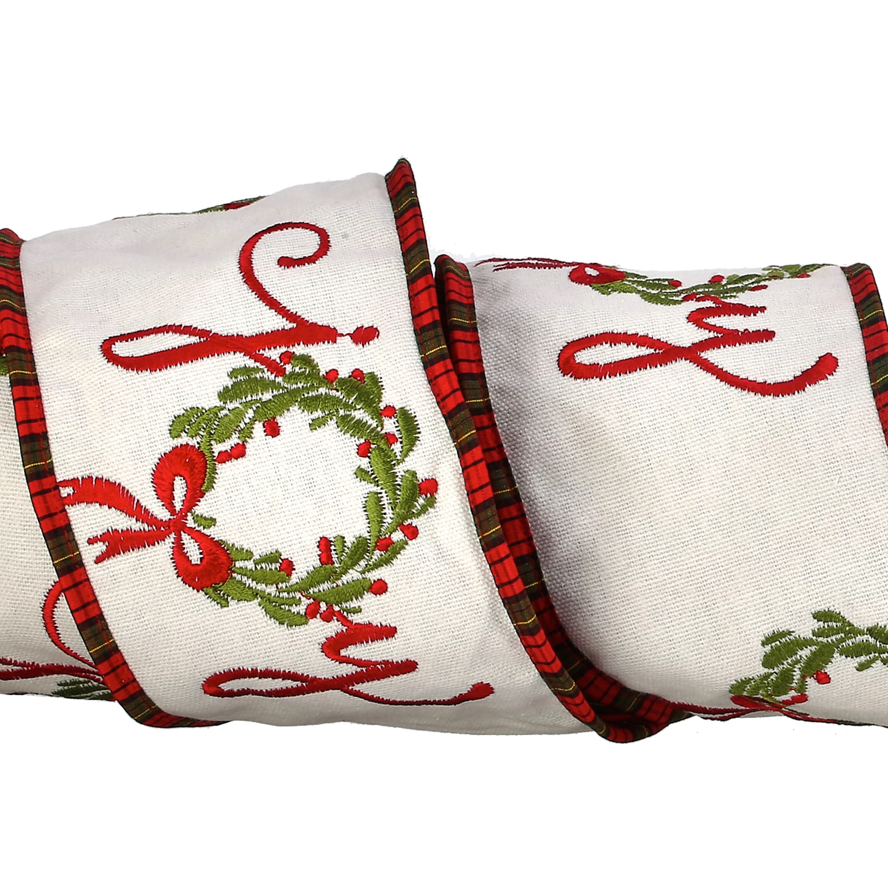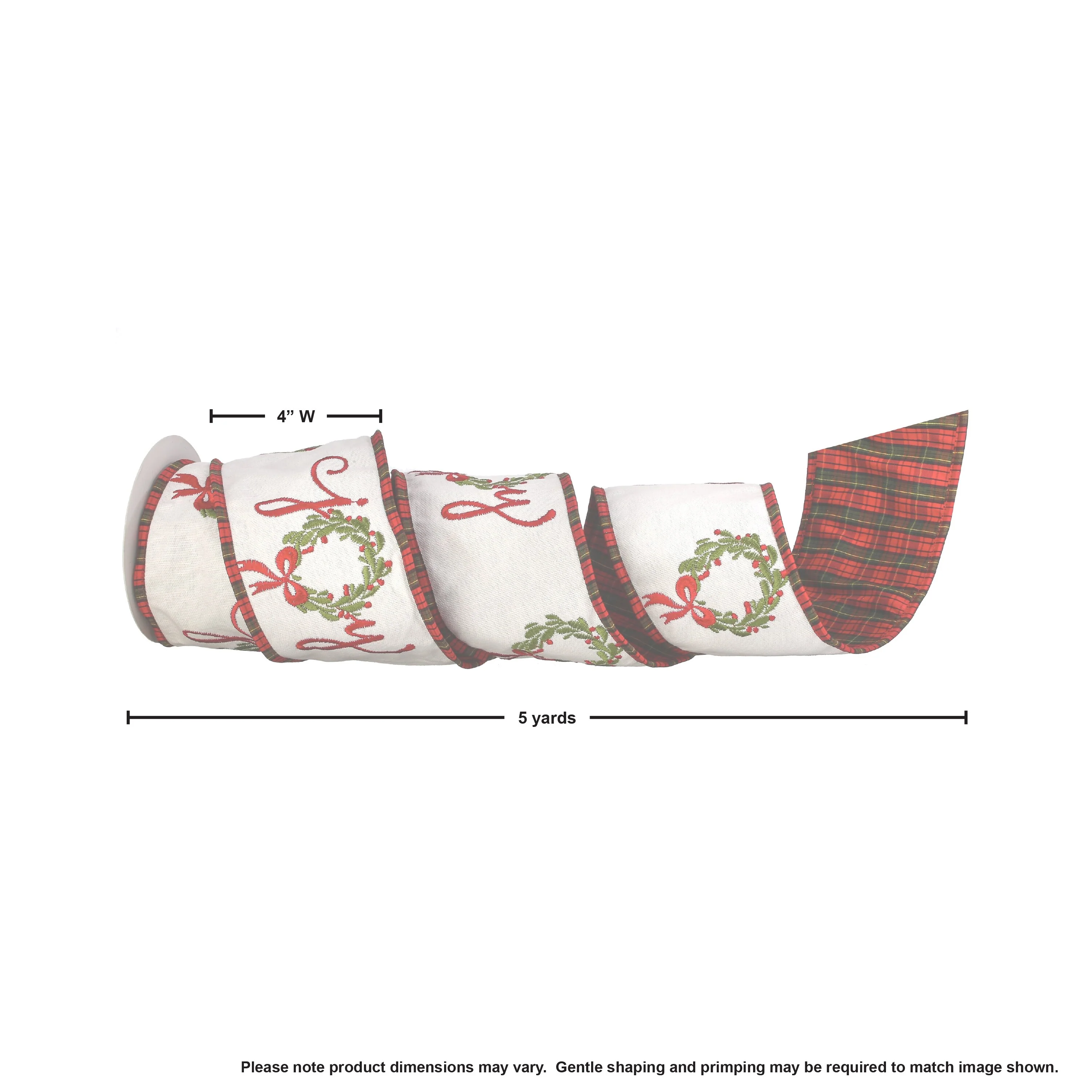 Add a festive flourish to your holiday décor with this 4" x 5-yard "Joy" Wreath Dupion Plaid Back Ribbon. This beautifully crafted ribbon features elegant "Joy" wreath embroidery on the front and a classic holiday plaid on the reverse, offering two looks in one versatile design. Made from luxurious dupion fabric, it holds its shape perfectly for bows, garlands, wreaths, and more. Designed with classic holiday charm, this ribbon brings warmth, texture, and timeless cheer to any space. Made in India, globally known for their quality items.