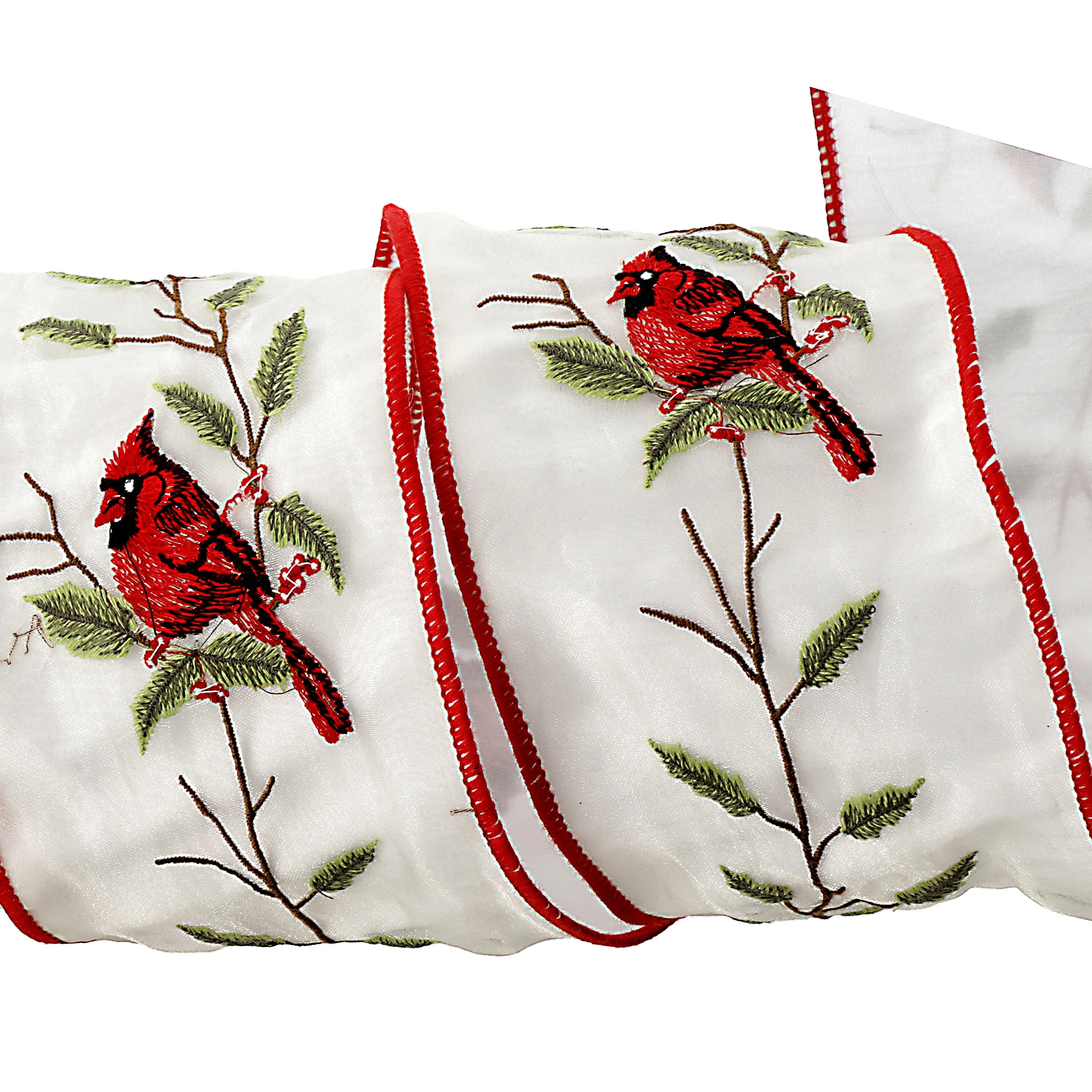 Make a statement with the rich, refined beauty of our 4" X5Y Sheer Cardinal Dupion Ribbon. This ribbon features a luxurious dupion texture with a shimmery sheer finish that adds a soft, elegant touch to any design. The textured cardinal on a holly branch design sets this ribbon apart from the rest. The wired edges make it easy to shape, holding bows and folds with ease. Whether you're decorating for the holidays or adding a dramatic flourish to an event, this ribbon delivers sophistication with every twist. Made in India, globally known for their quality items.