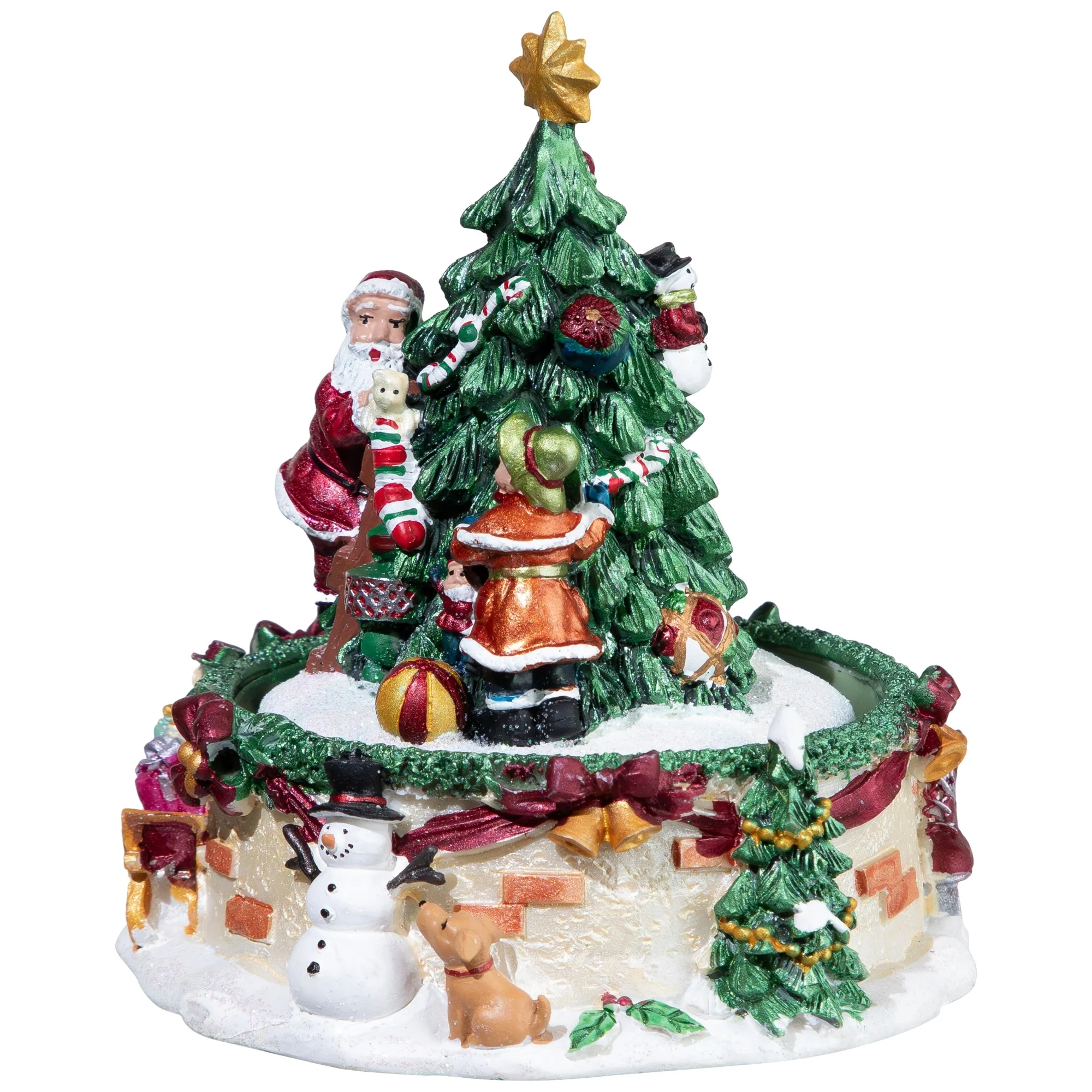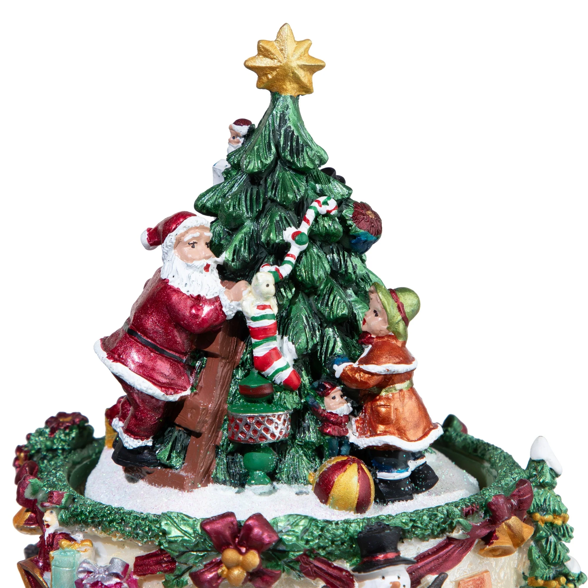This music box features Santa Claus standing on a ladder decorating a Christmas tree for the holiday season