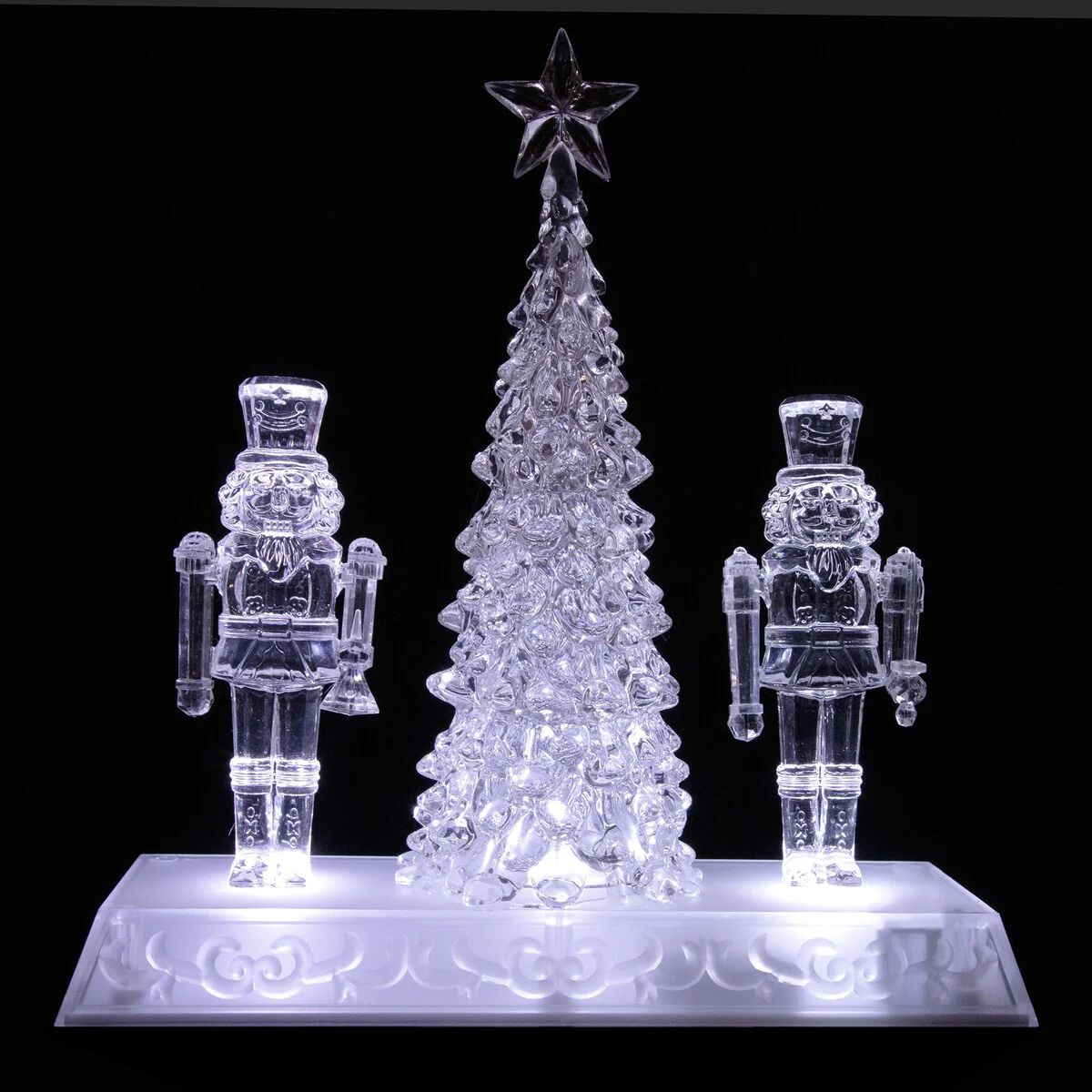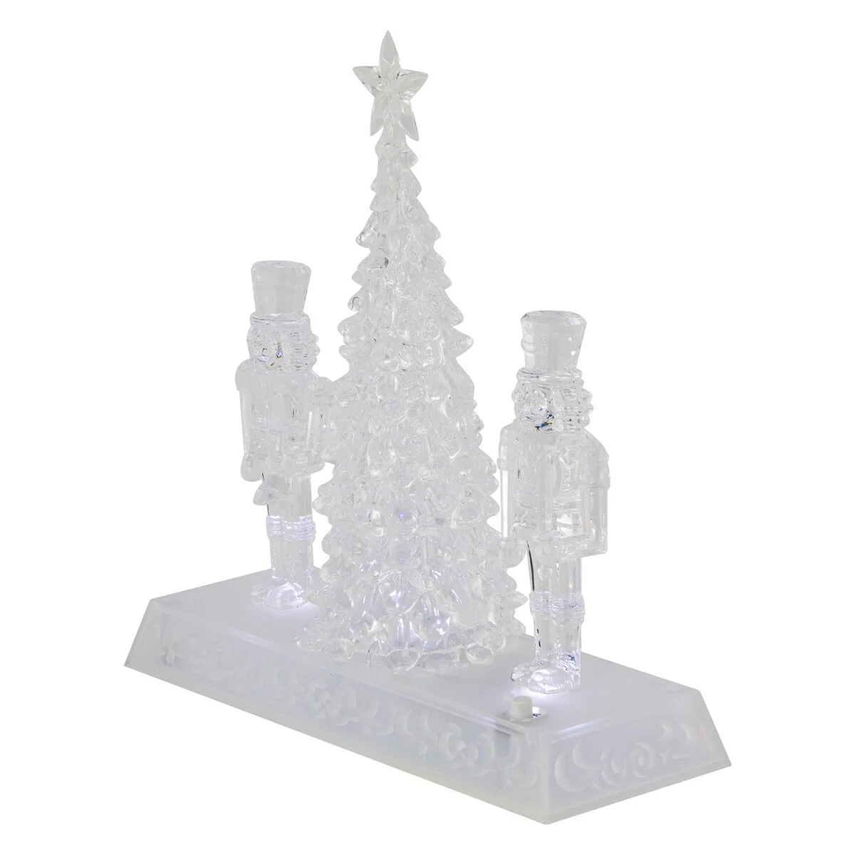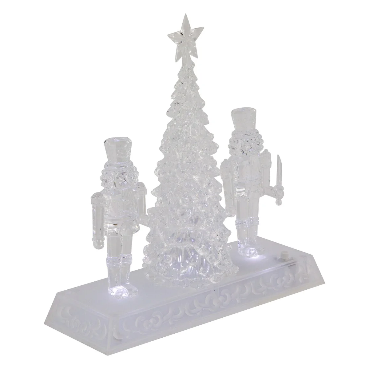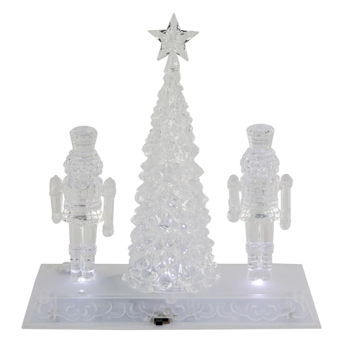 Add this festive nutcracker decoration from the Icy Crystal Collection to your home this holiday season. Two nutcrackers guard the Christmas tree. Perfect as a gift or to use as a centerpiece for your Christmas decor. Product Features: Christmas tree and nutcracker tabletop decor. Nutcrackers are holding a bell and sword. Illuminated with white LED lights. On/off switch located on the back of the base. Clear rectangular base has a scroll design. Requires (3) AAA batteries; not included. Recommended for indoor use. Dimensions: 9"H x 8.75"W x 3"D. Material(s): acrylic