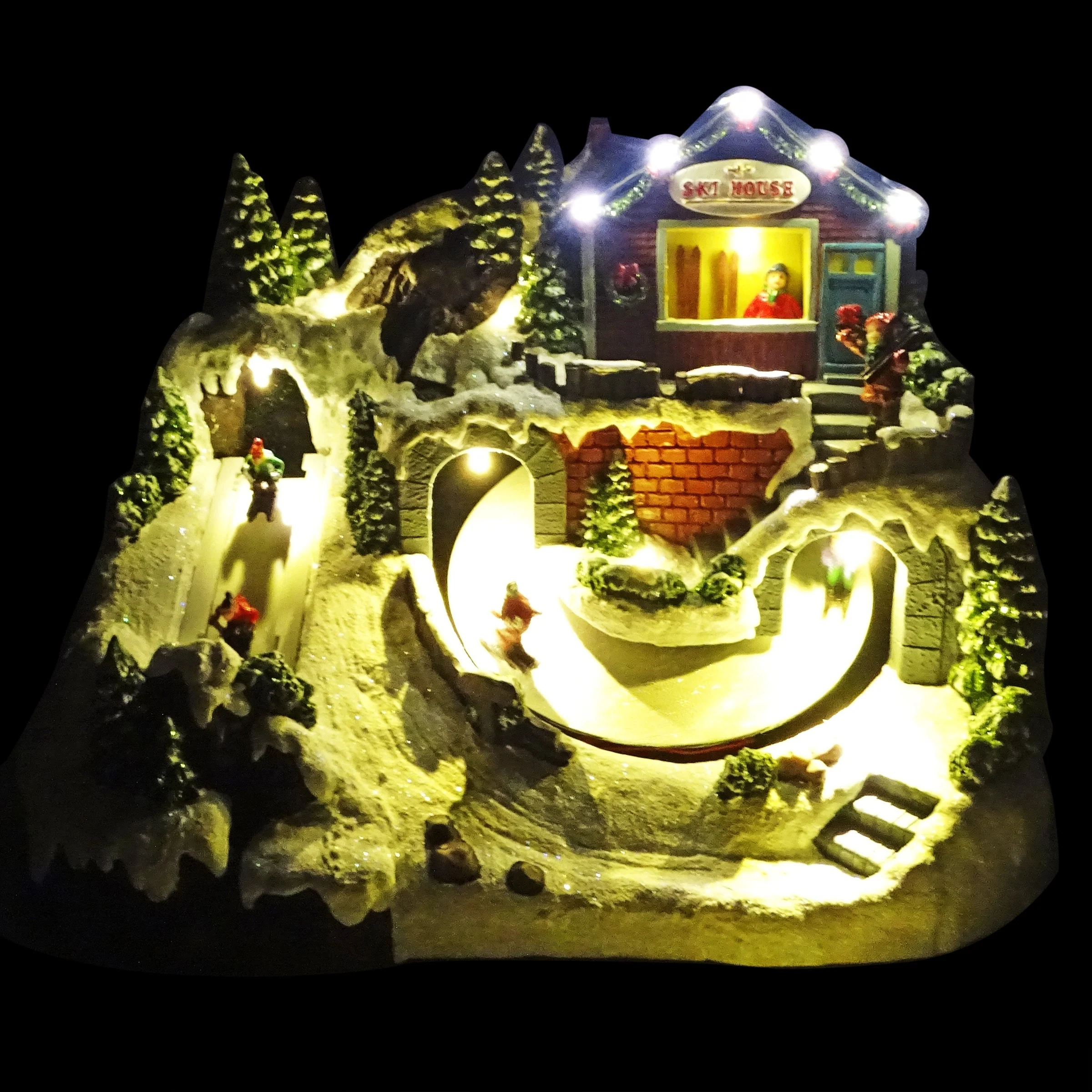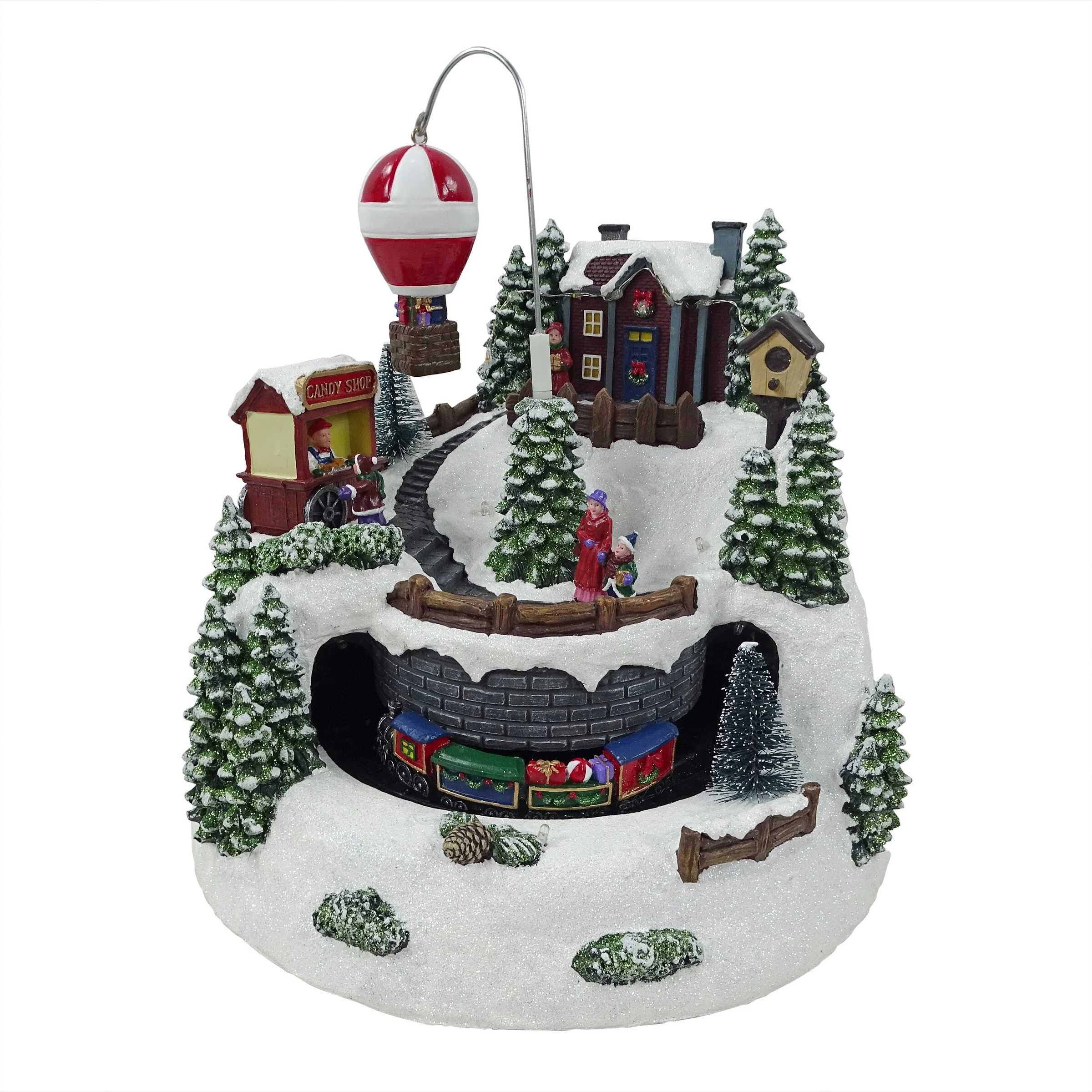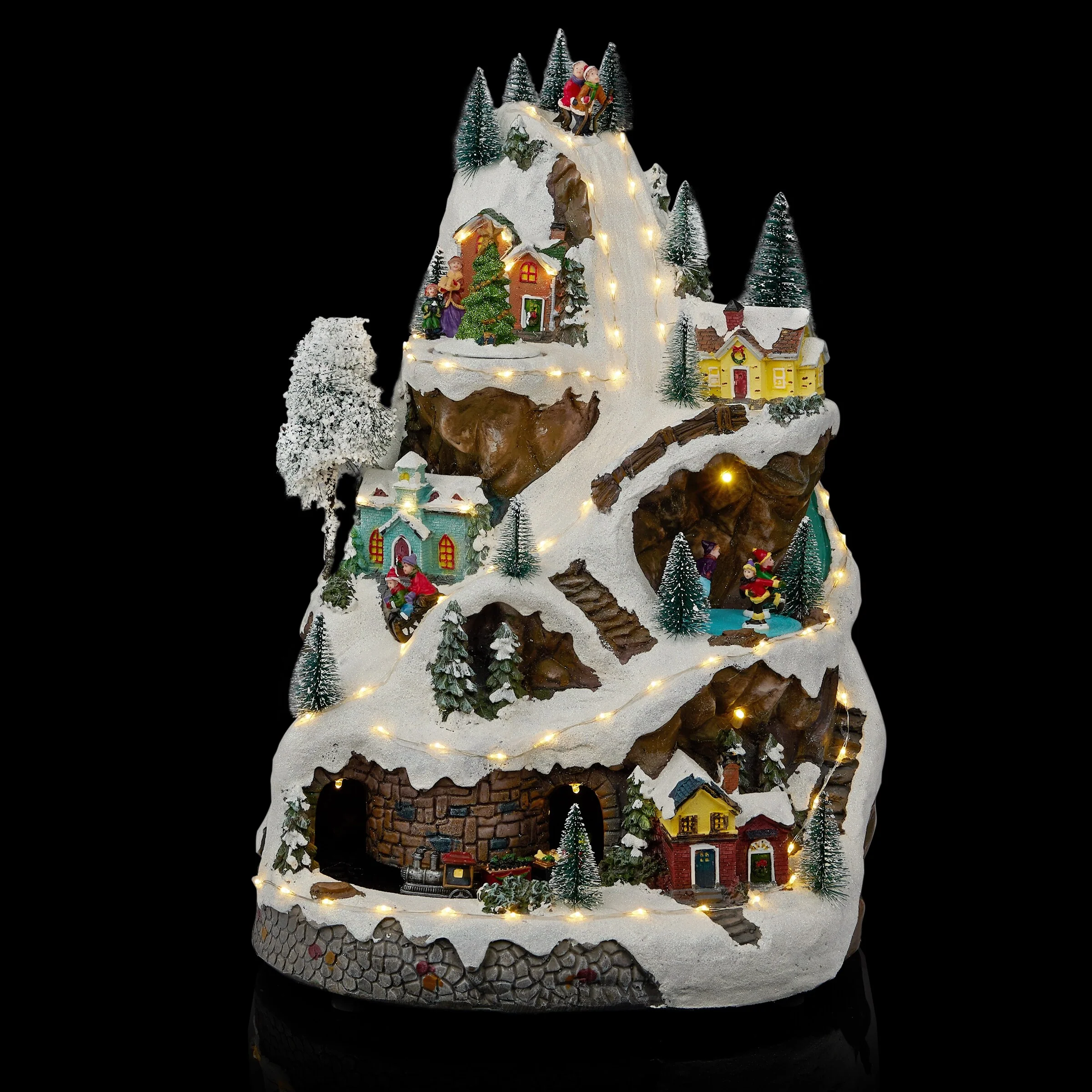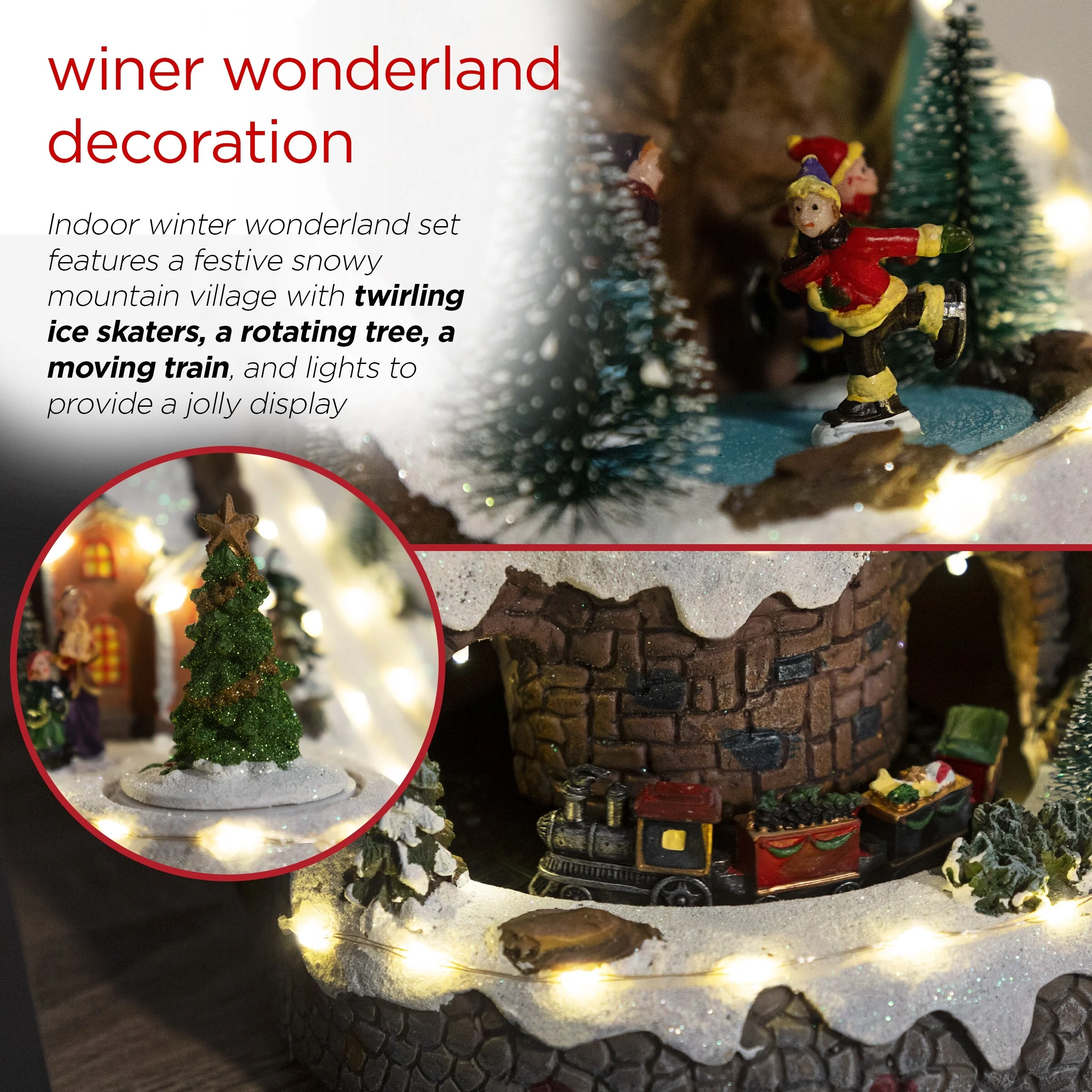- Indoor winter wonderland set features a festive snowy mountain village with twirling ice skaters, a rotating tree, a moving train, and lights to provide a jolly display