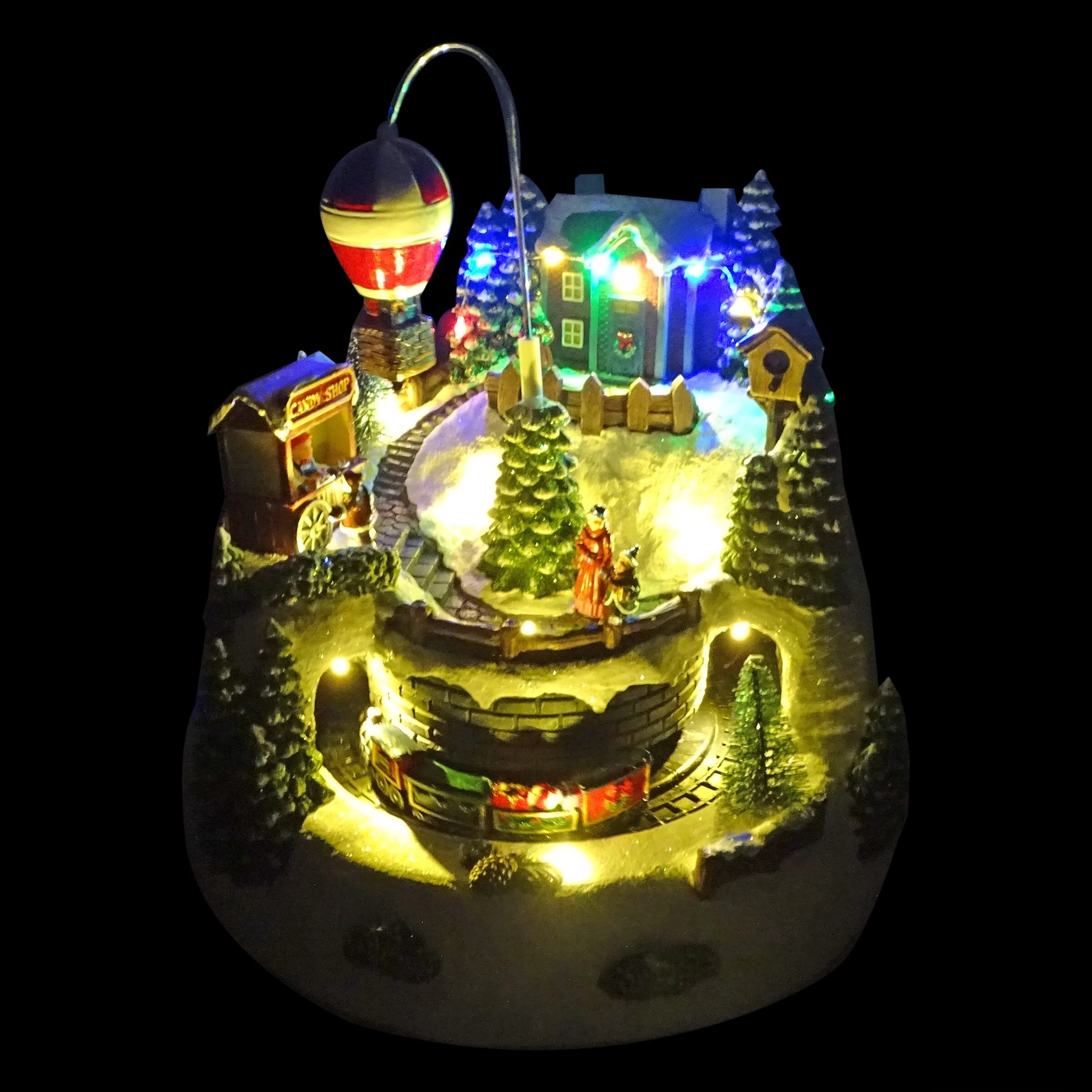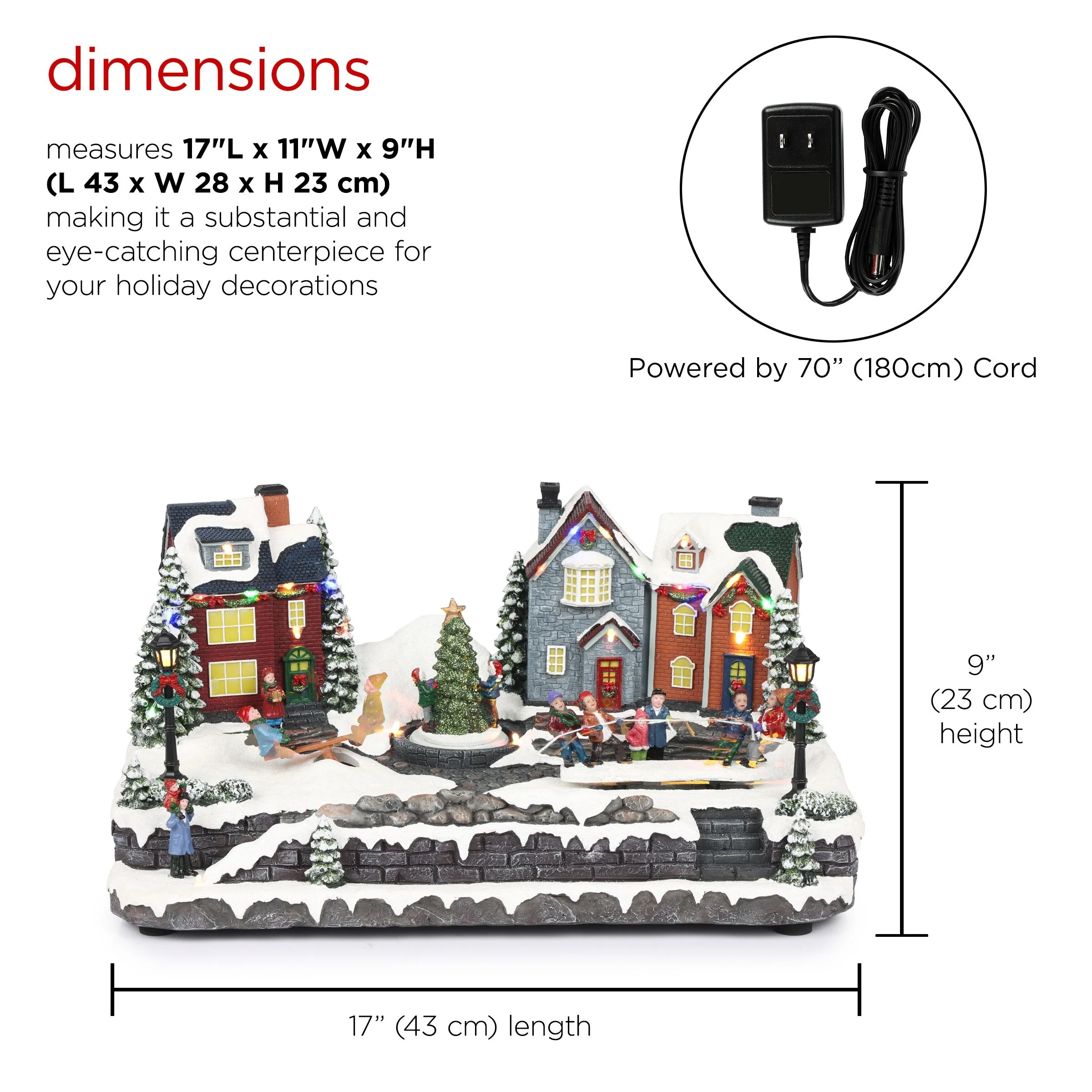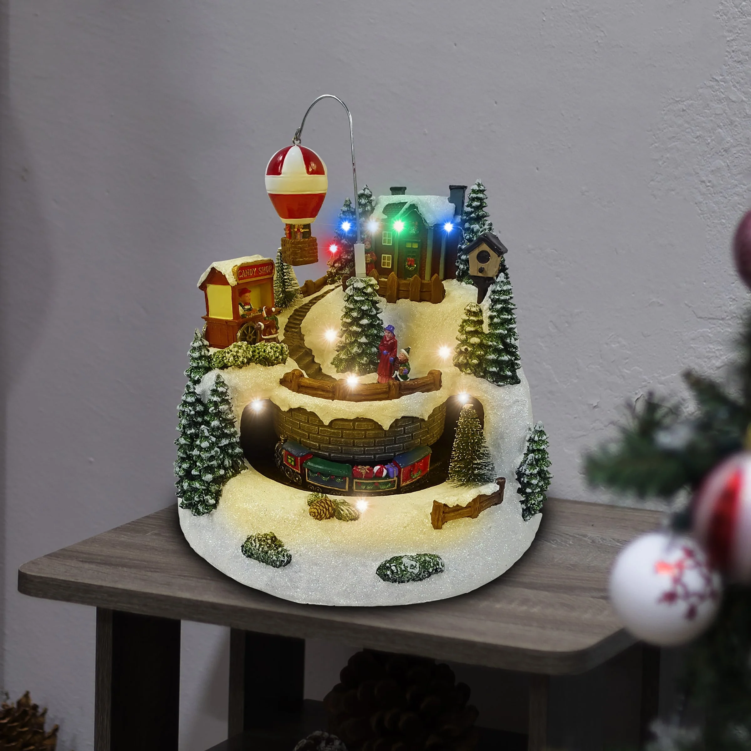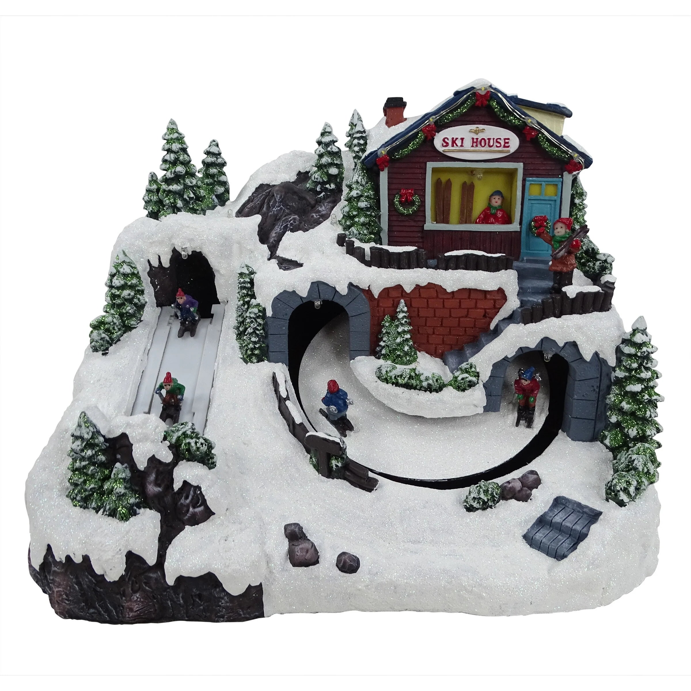 - Indoor winter wonderland set features a festive snowy mountain village with twirling ice skaters, a rotating tree, a moving train, and lights to provide a jolly display
