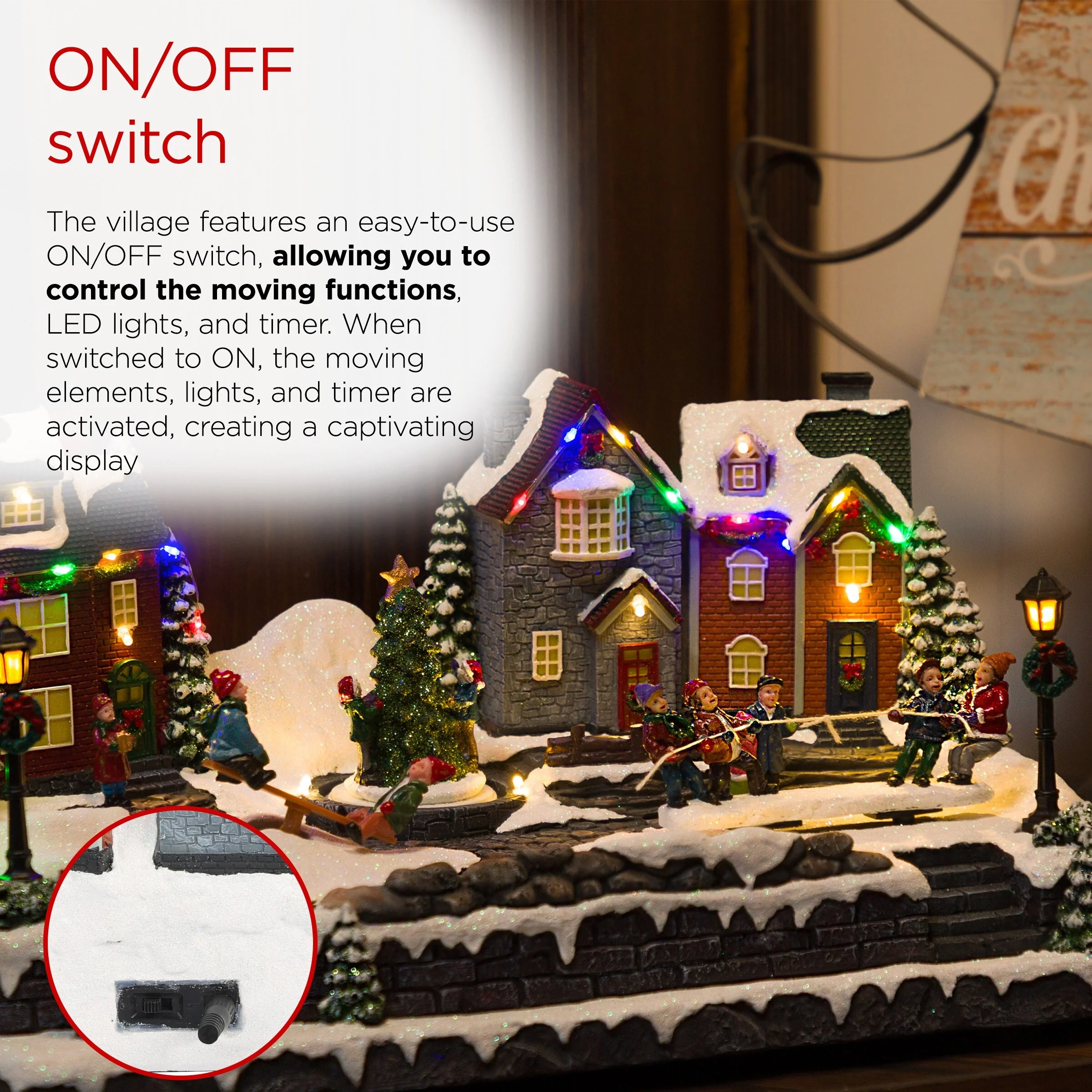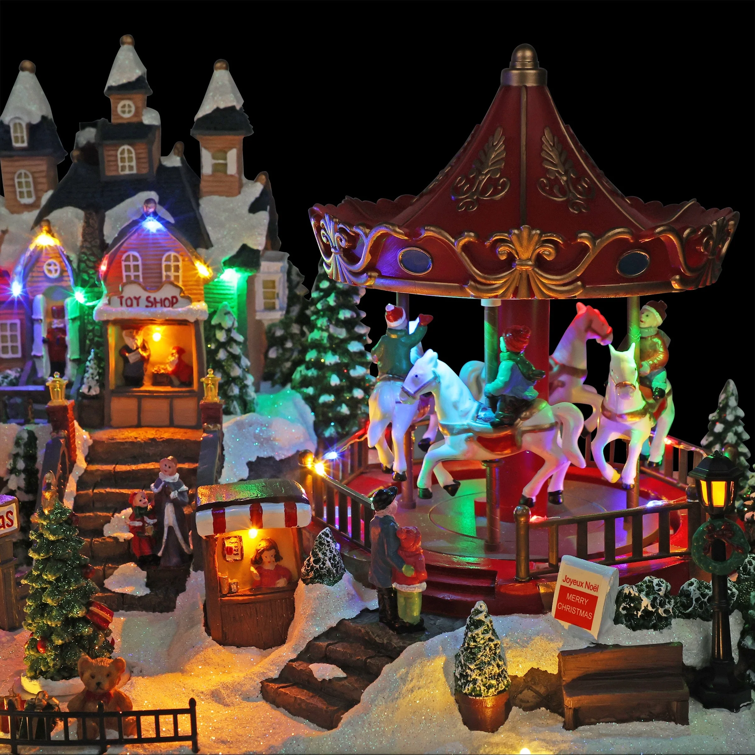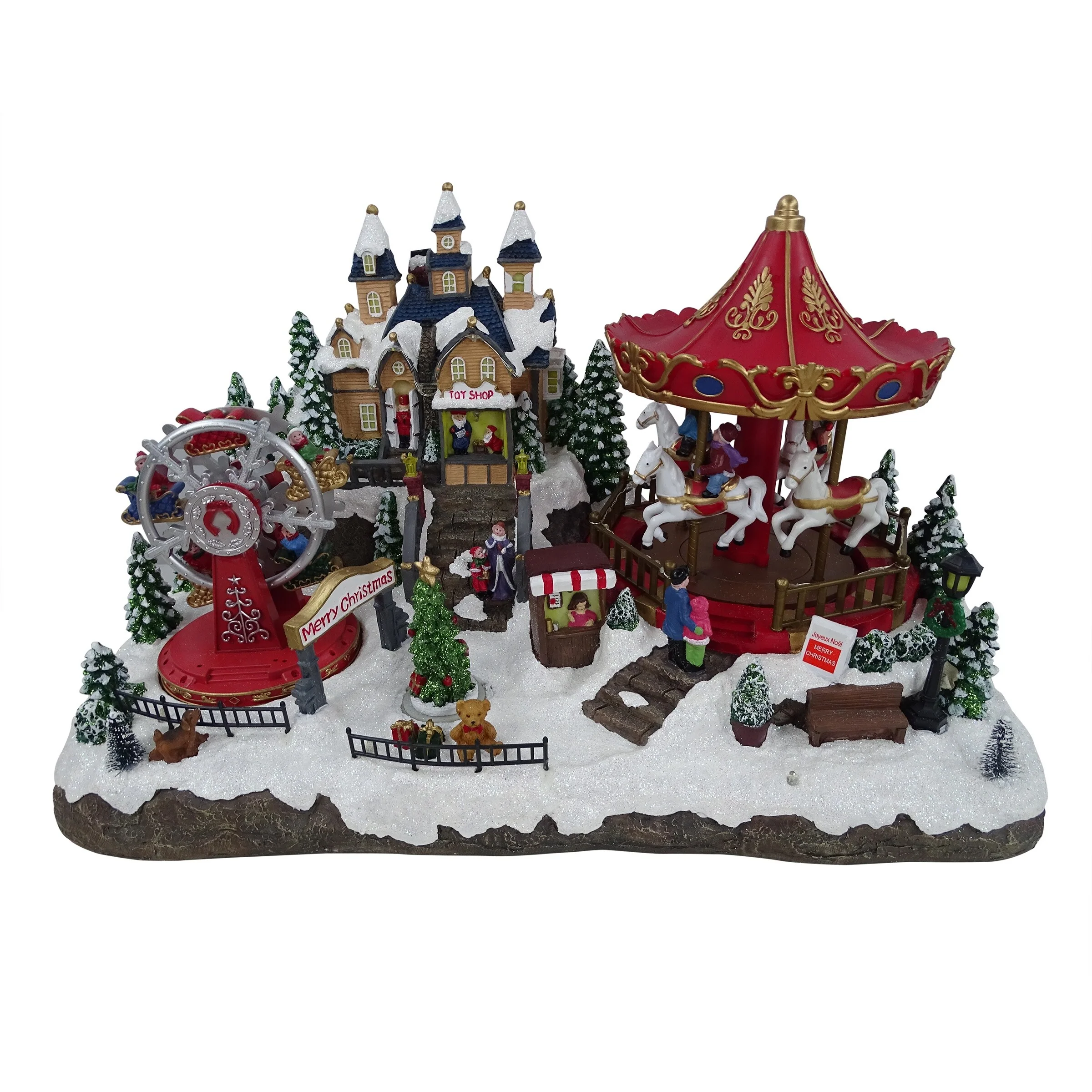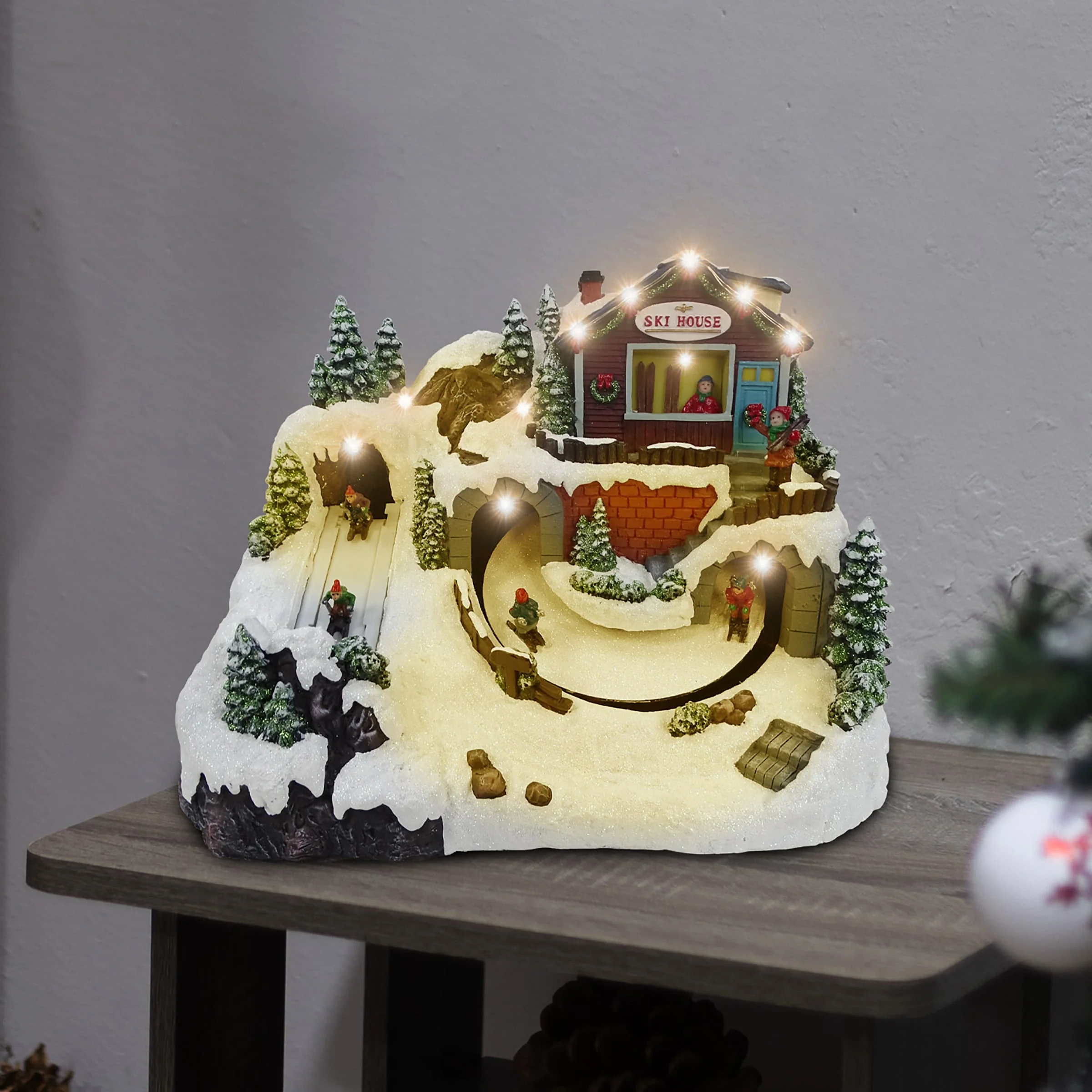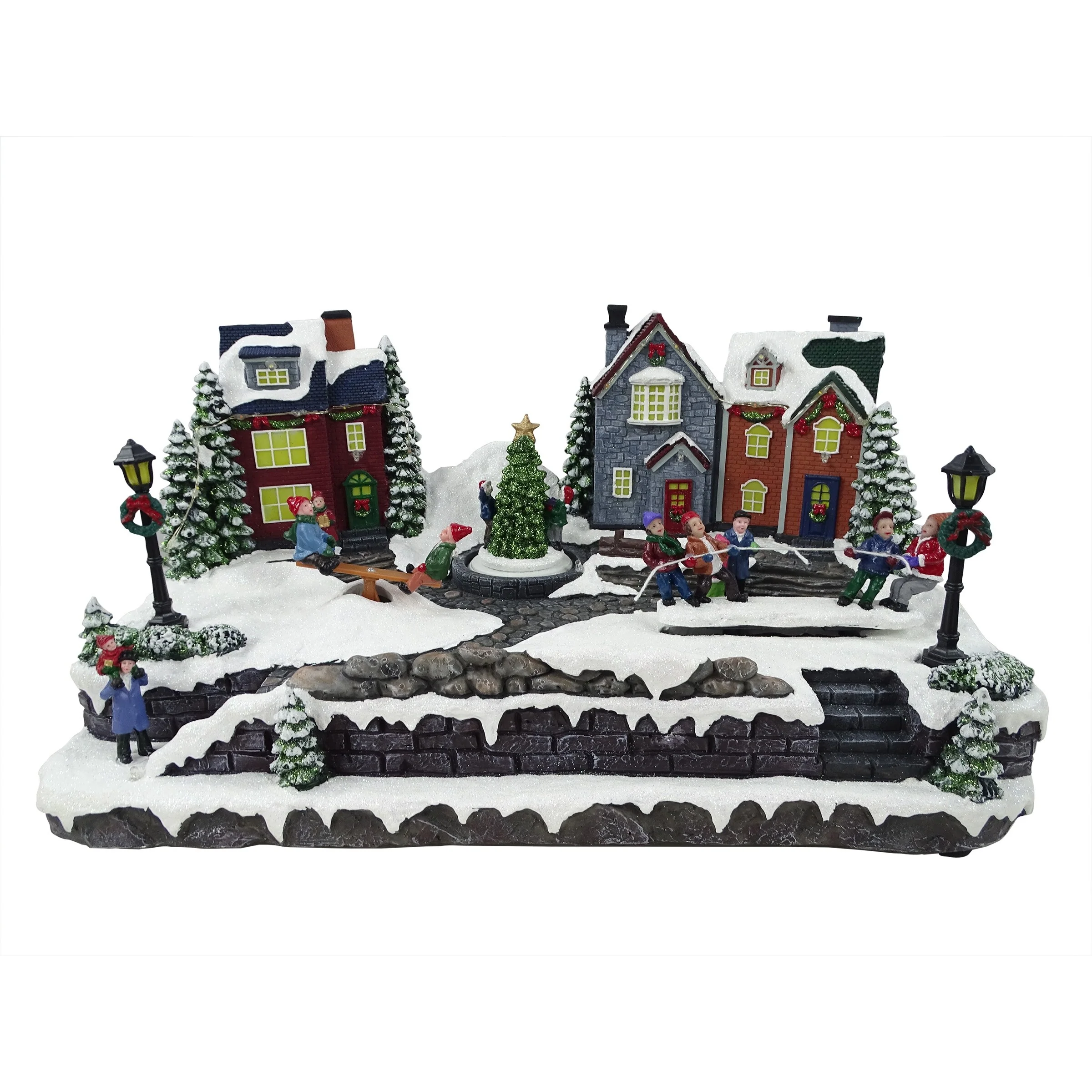 - Indoor winter wonderland set features a festive snowy mountain village with twirling ice skaters, a rotating tree, a moving train, and lights to provide a jolly display