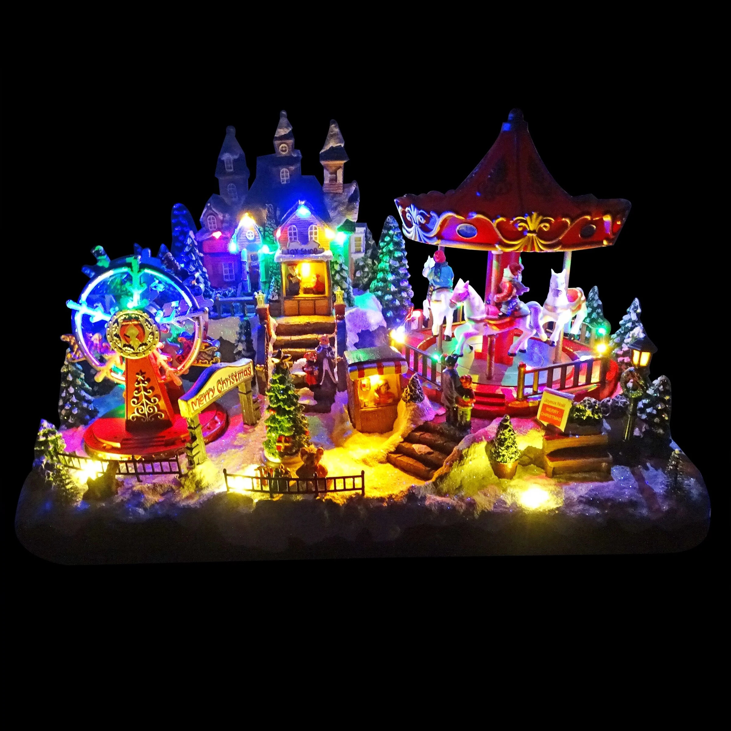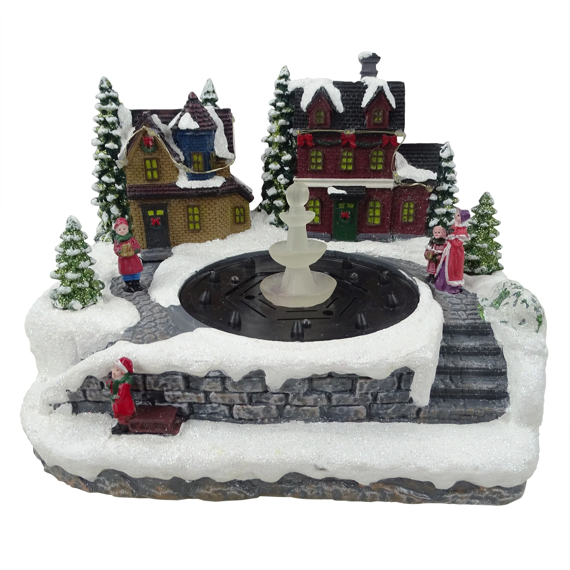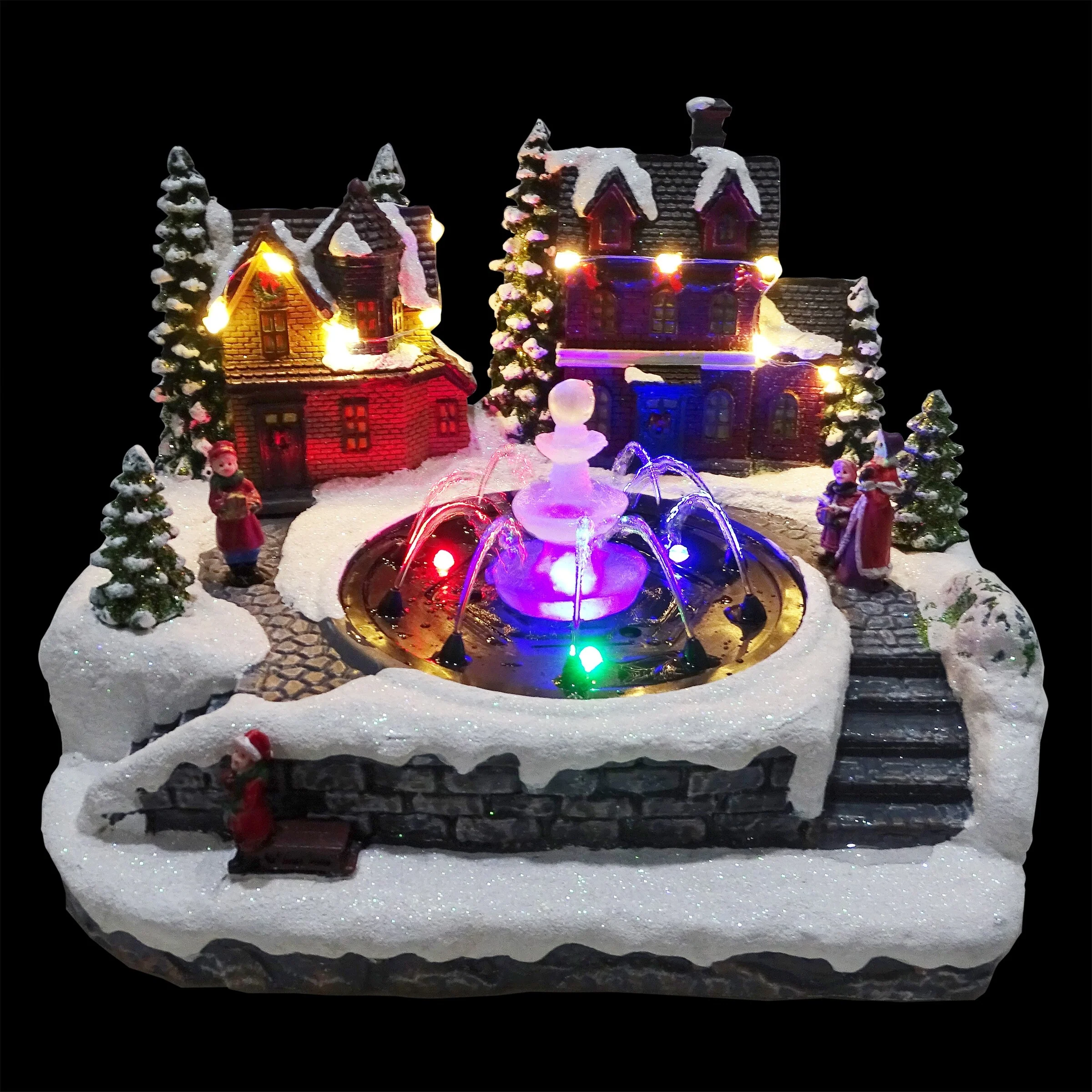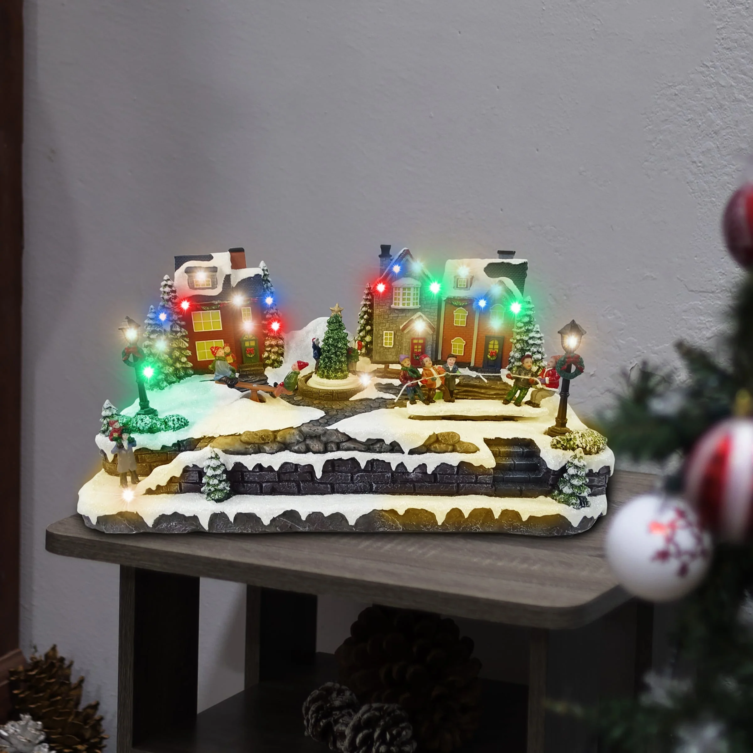 - Indoor winter wonderland set features a festive snowy mountain village with twirling ice skaters, a rotating tree, a moving train, and lights to provide a jolly display