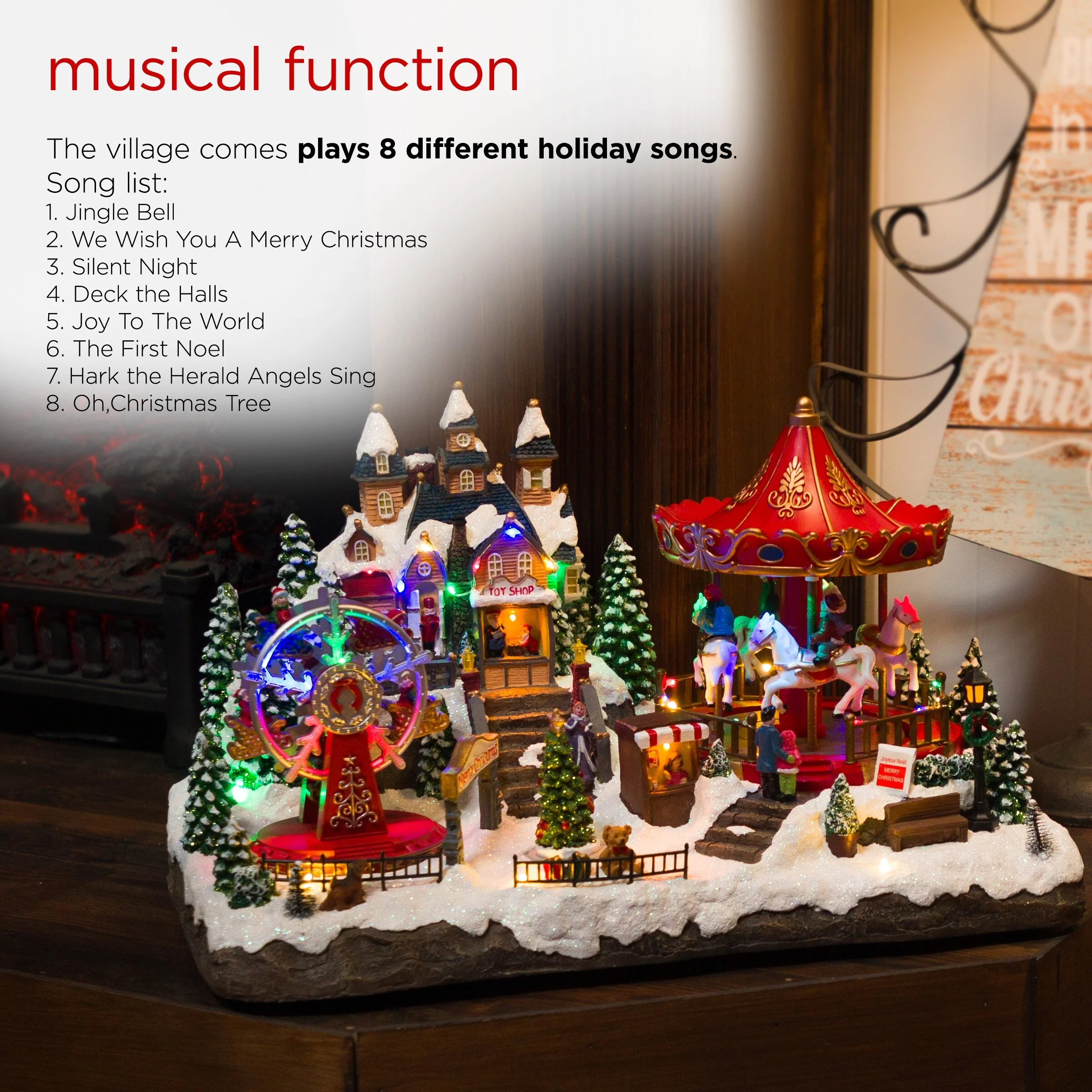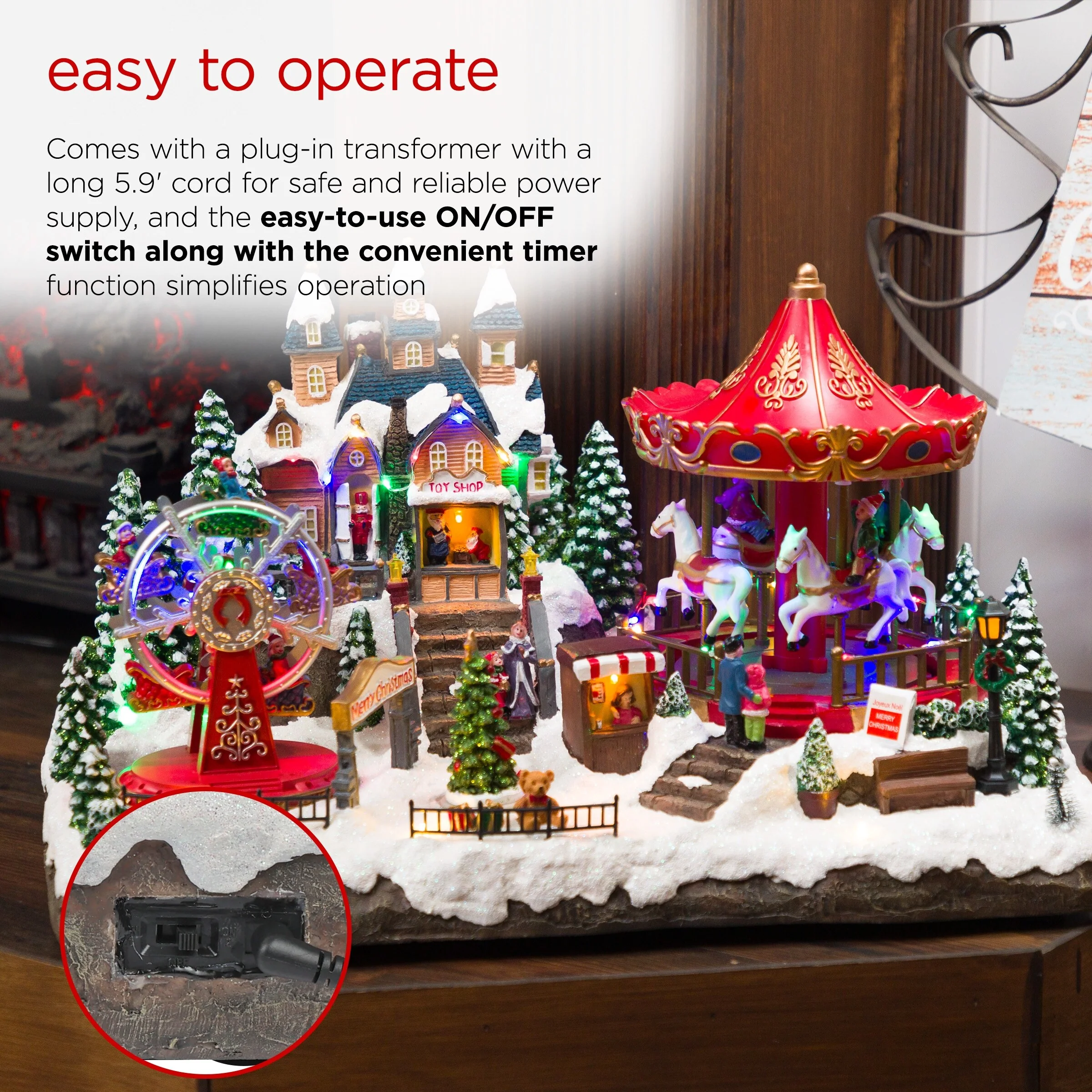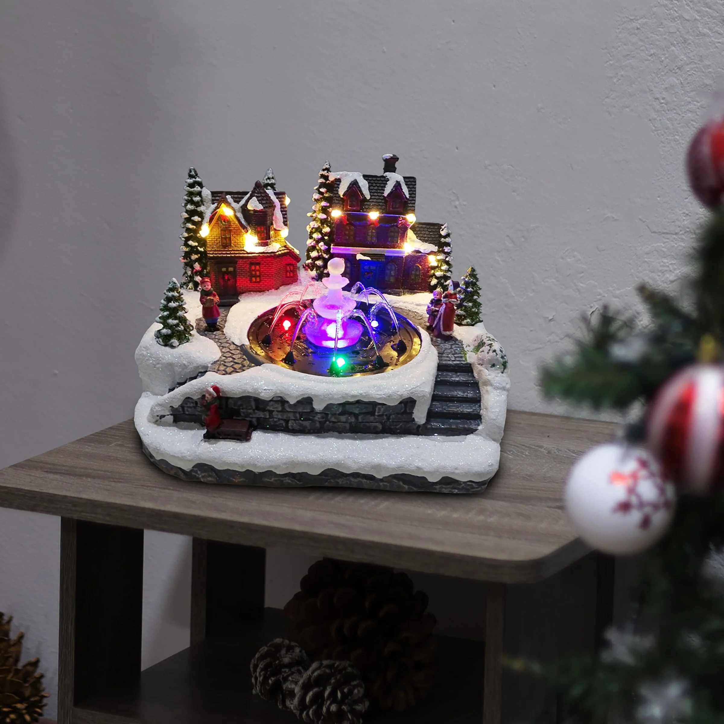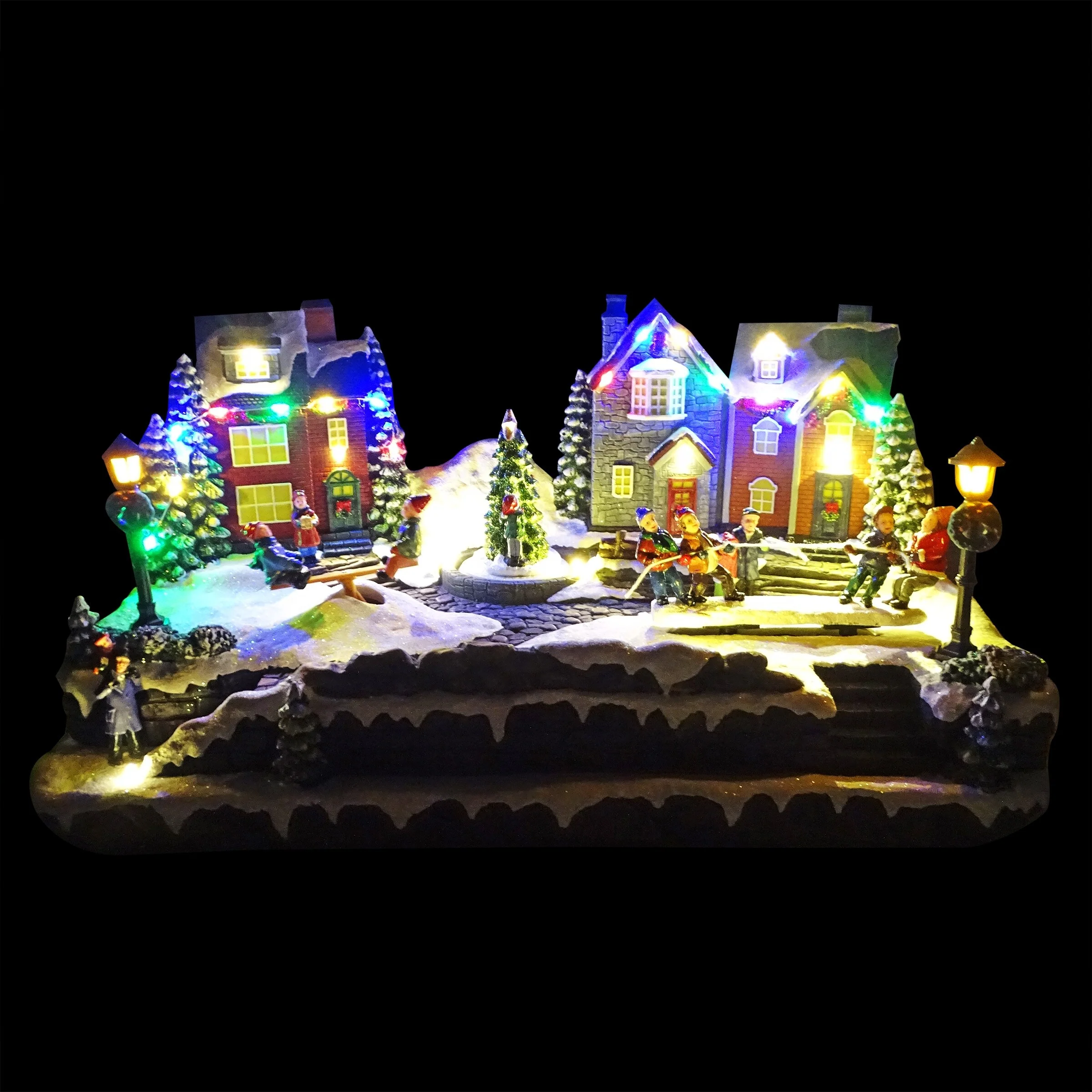 - Indoor winter wonderland set features a festive snowy mountain village with twirling ice skaters, a rotating tree, a moving train, and lights to provide a jolly display