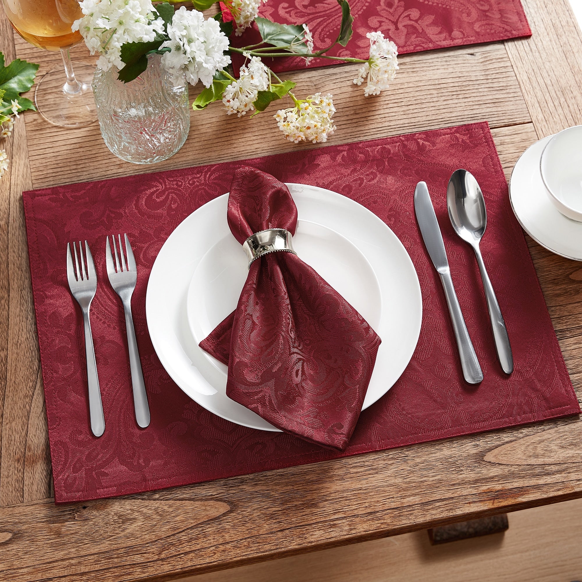 Bring extra elegance to your meal times with this set of four cloth napkins. The napkins are crafted from stain and water-resistant polyester for an extra soft feeling, and woven with a jacquard damask pattern for sophistication. The machine washable napkins are available in a variety of stylish colors to best fit your table settings and style.