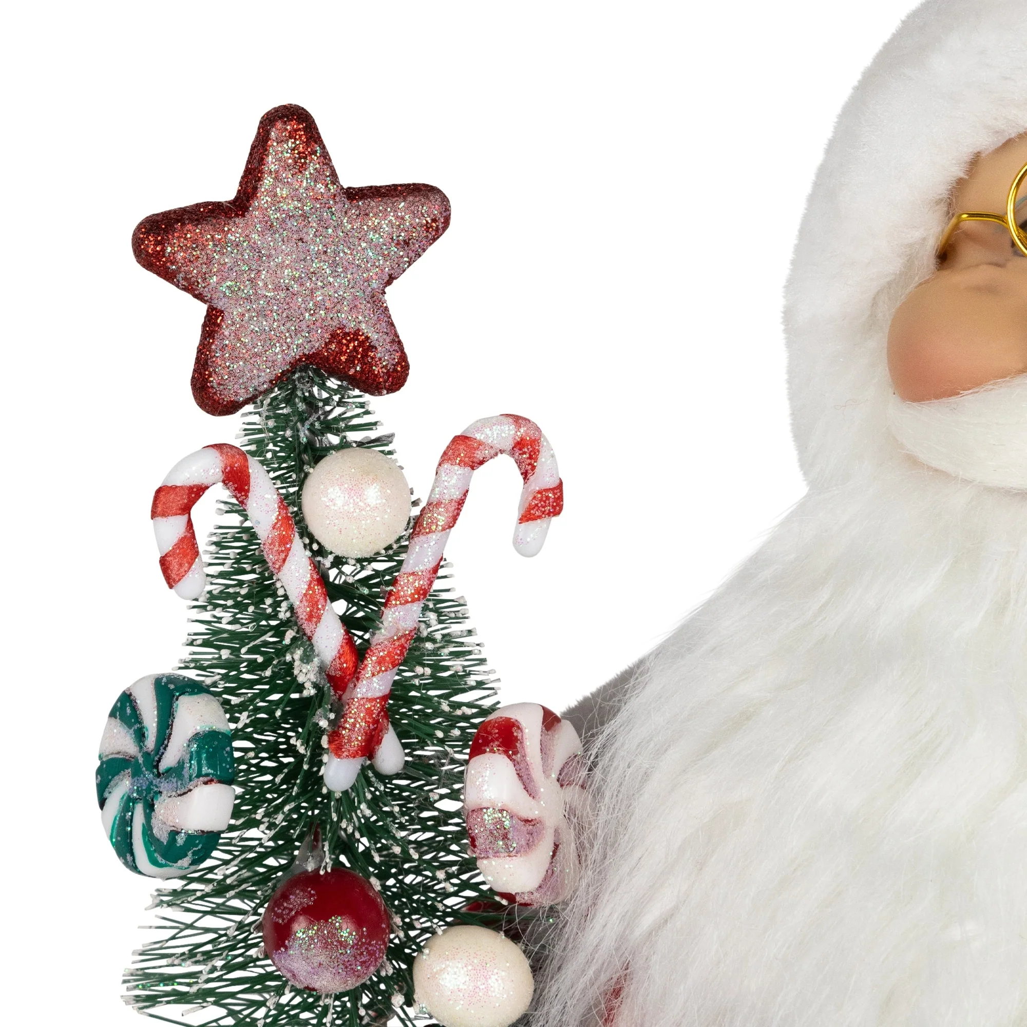 He holds a glittered Christmas tree decorated with peppermint candies and candy canes