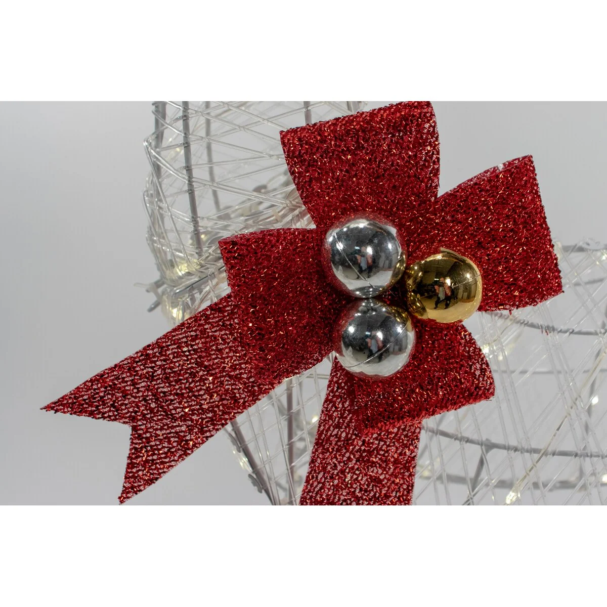 Set the tone to your outdoor holiday scene with the Flextube Micro LED lighted deer and buck set. Rust resistant wire white LED bulbs. Buck stands proudly with his golden rack while his doe feeds. Both buck and doe are adorn with red christams bows and bells. Buck stands 53 inches. Doe stands 29 inches. Stake-Pins included. Lightweight.